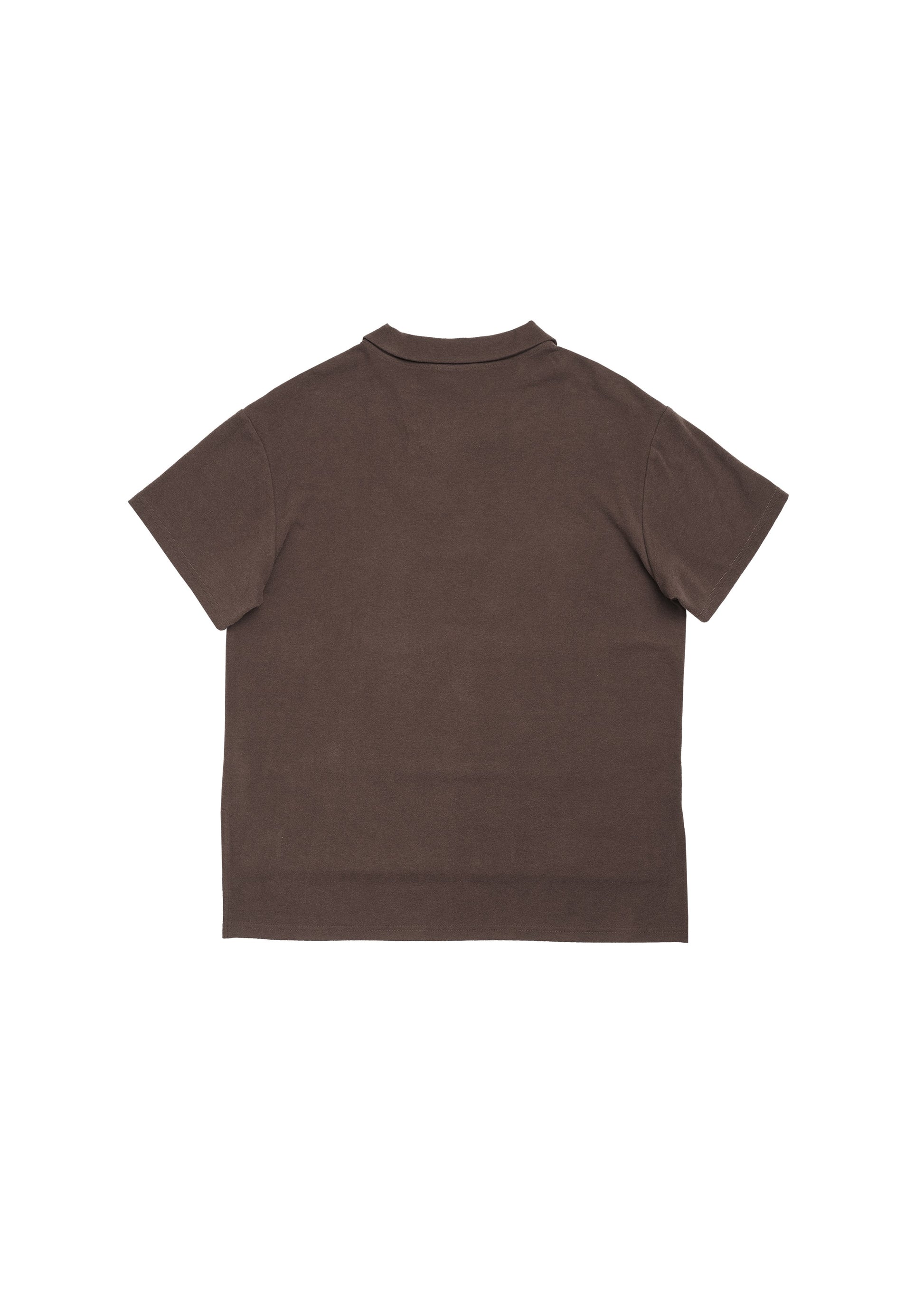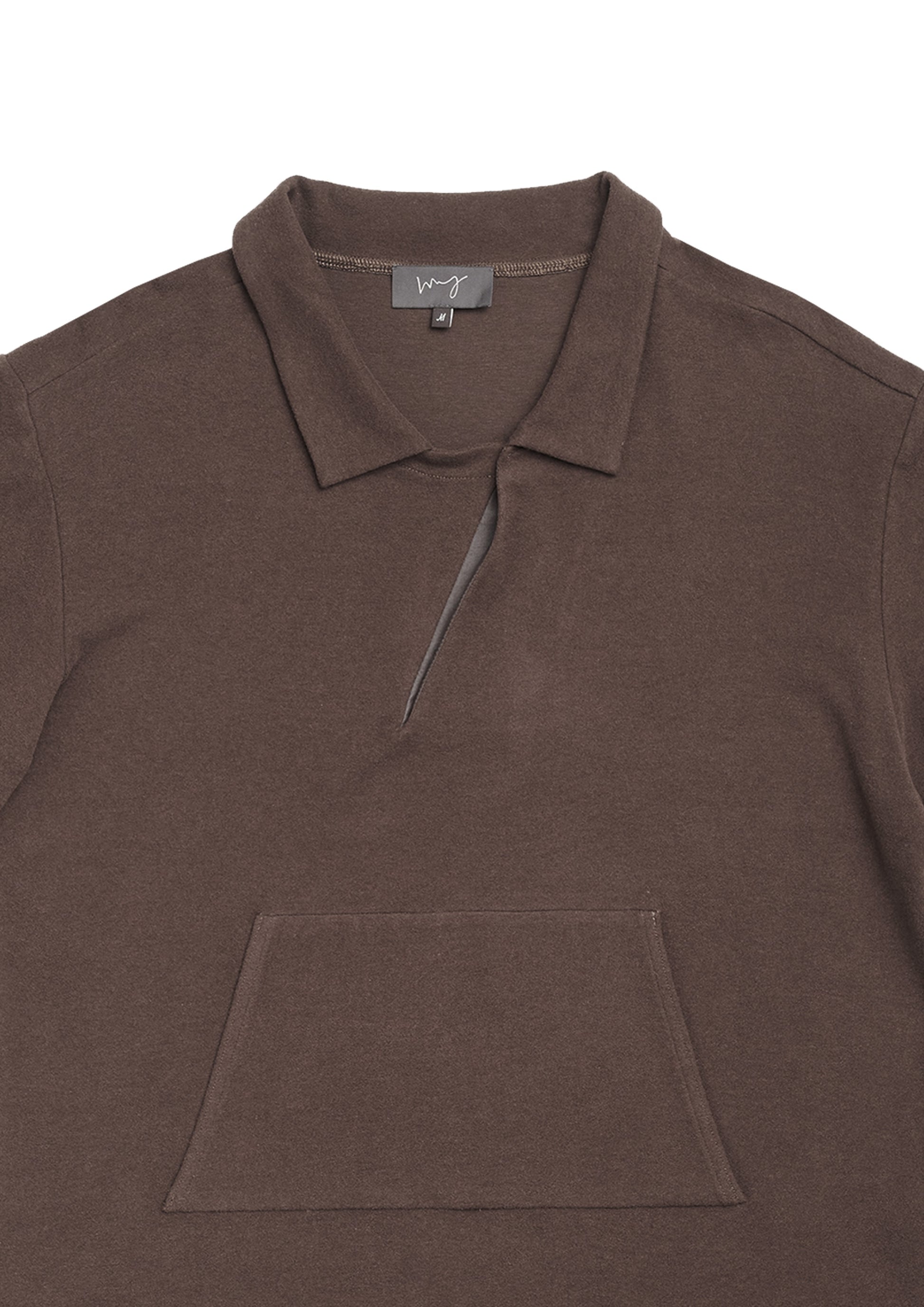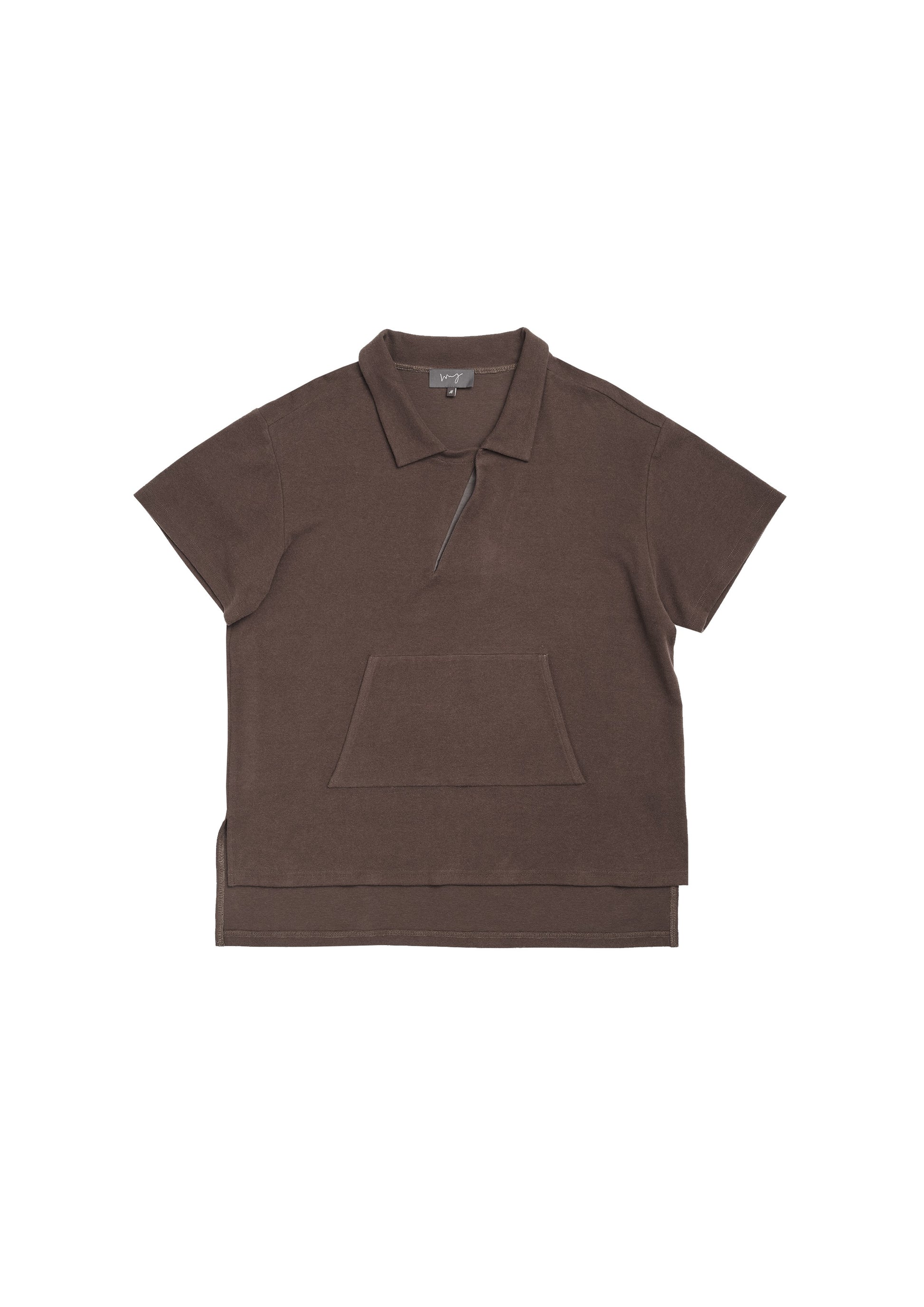 This brown fleece jersey polo neck t-shirt features a short-sleeve design and a unique polo collar design with a front pocket for added style.