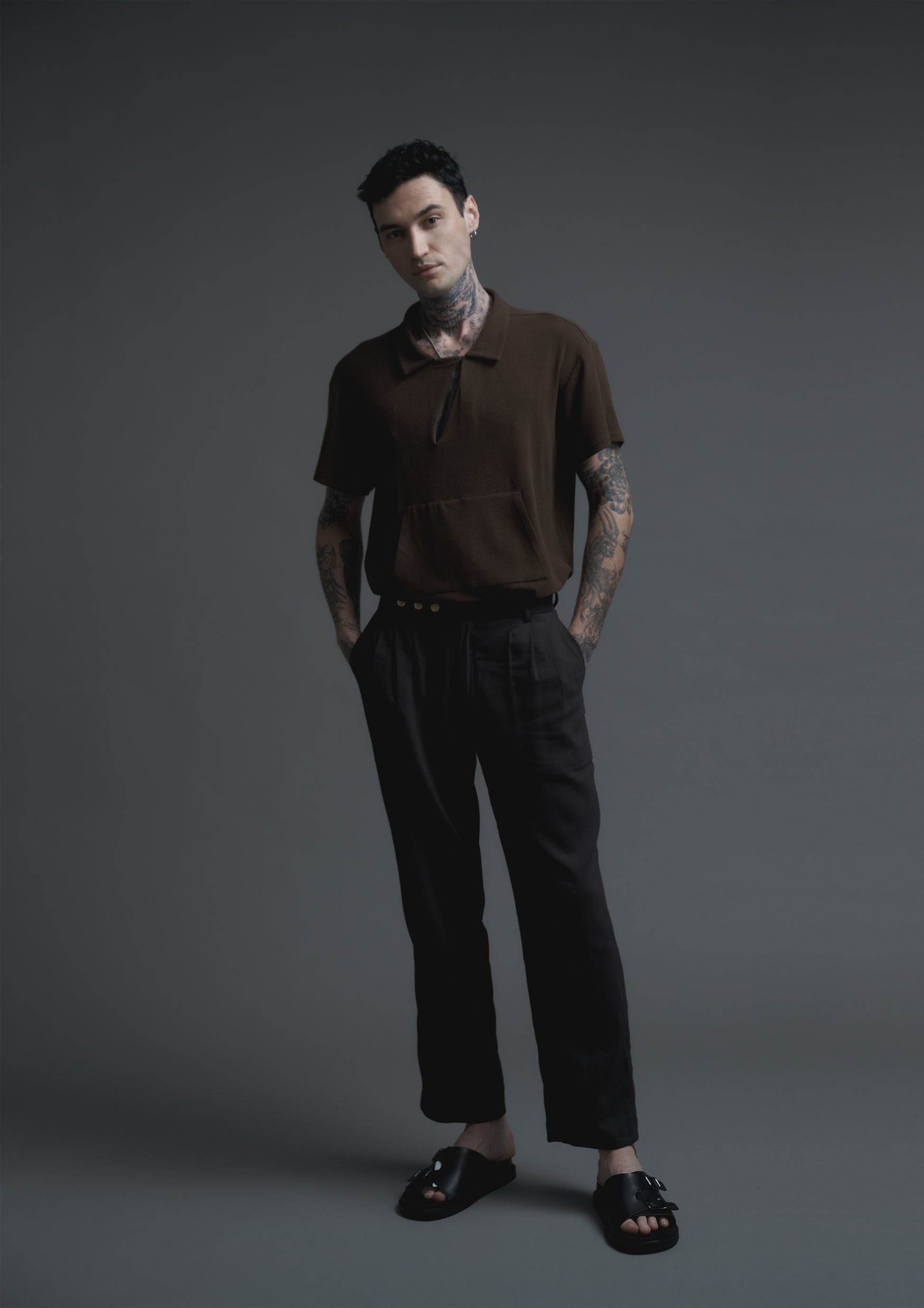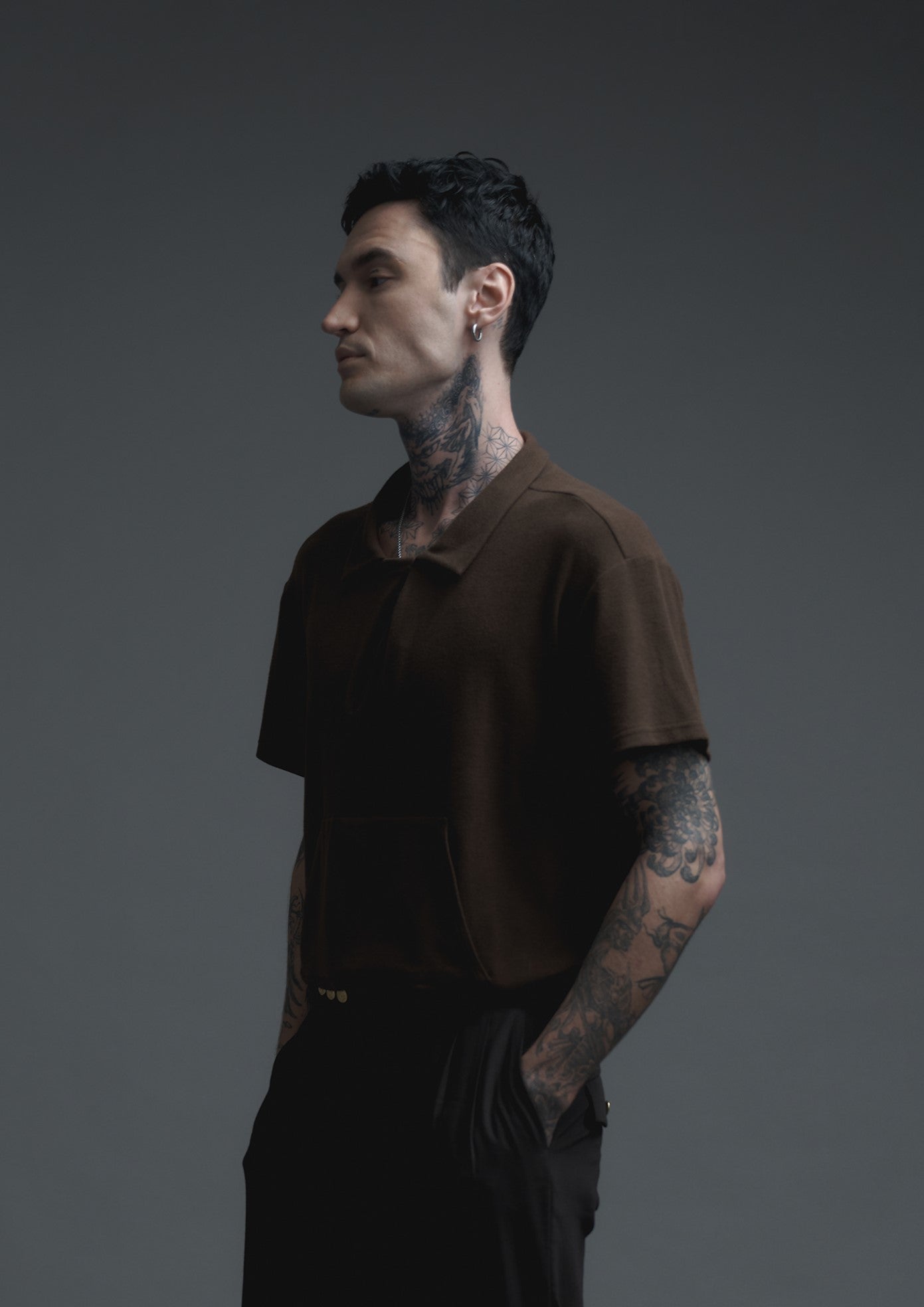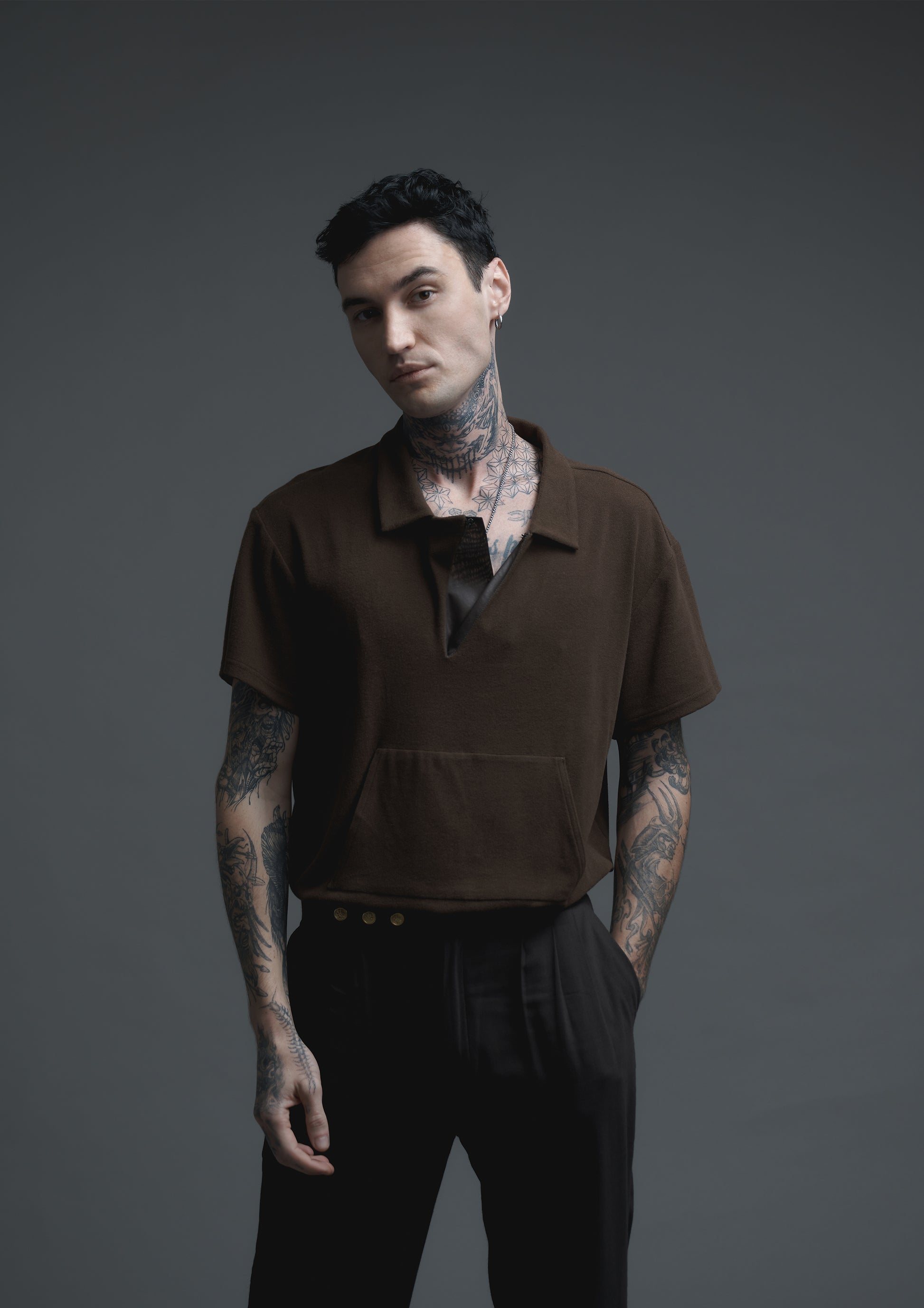 This brown fleece jersey polo neck t-shirt features a short-sleeve design and a unique polo collar design with a front pocket for added style.