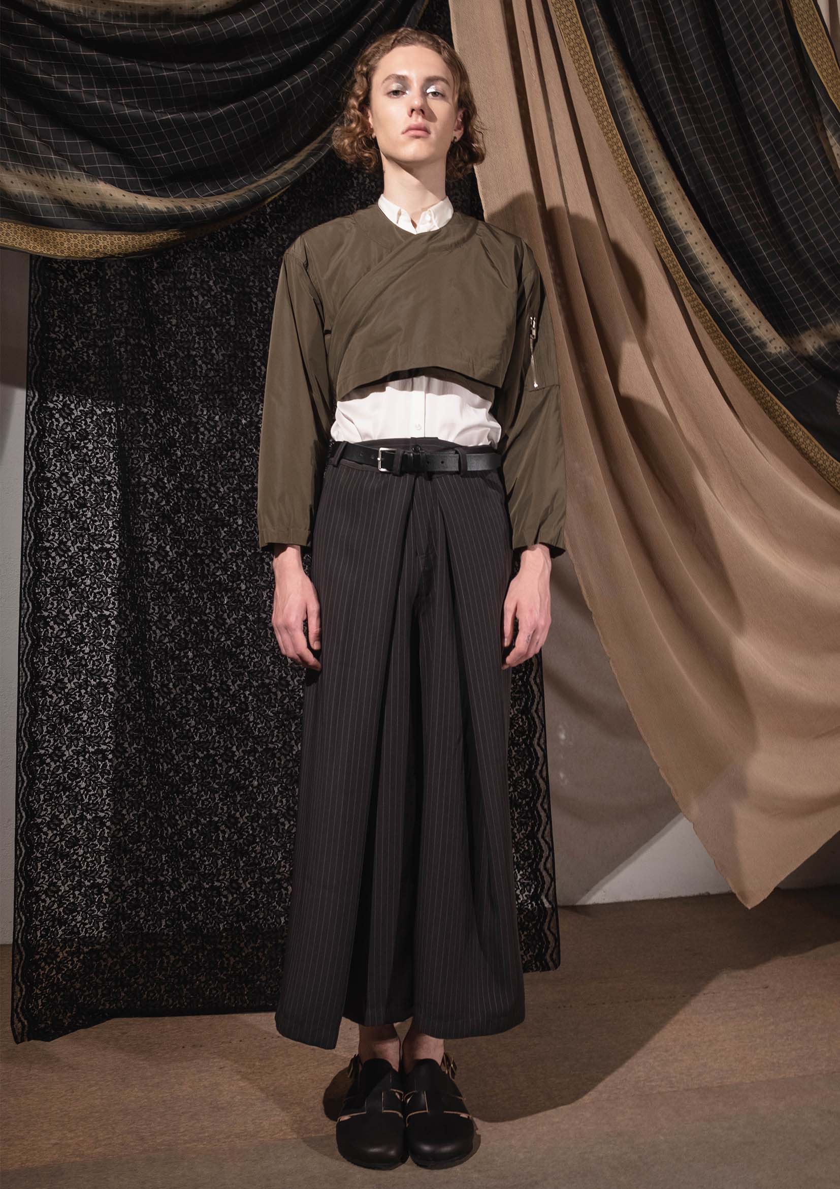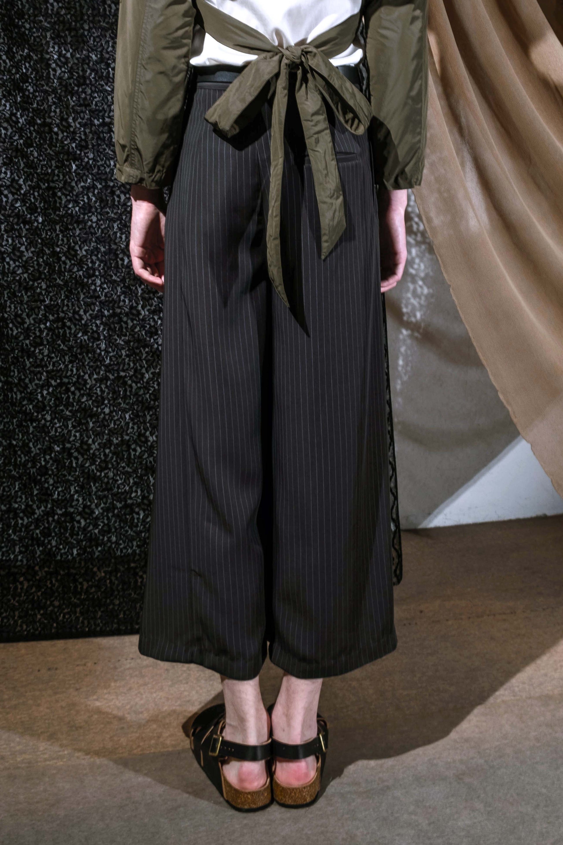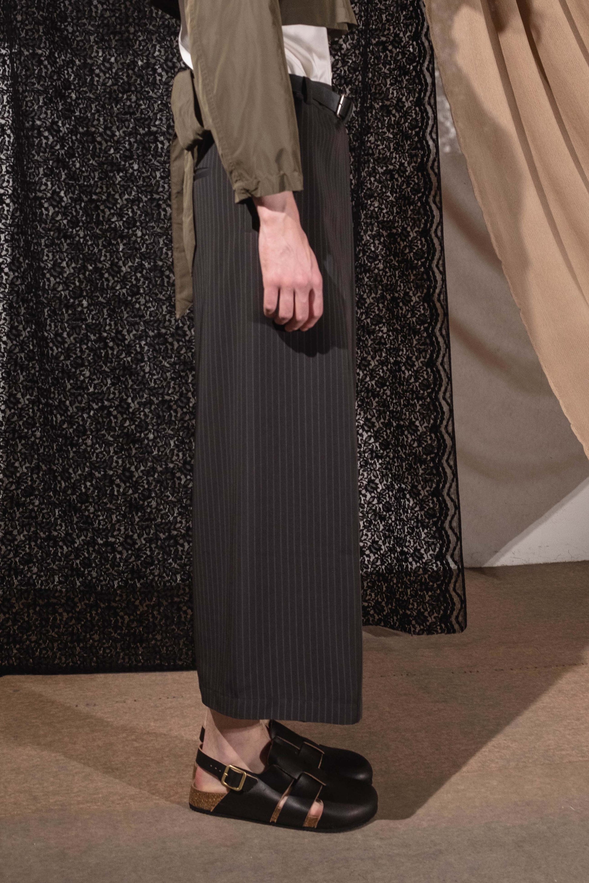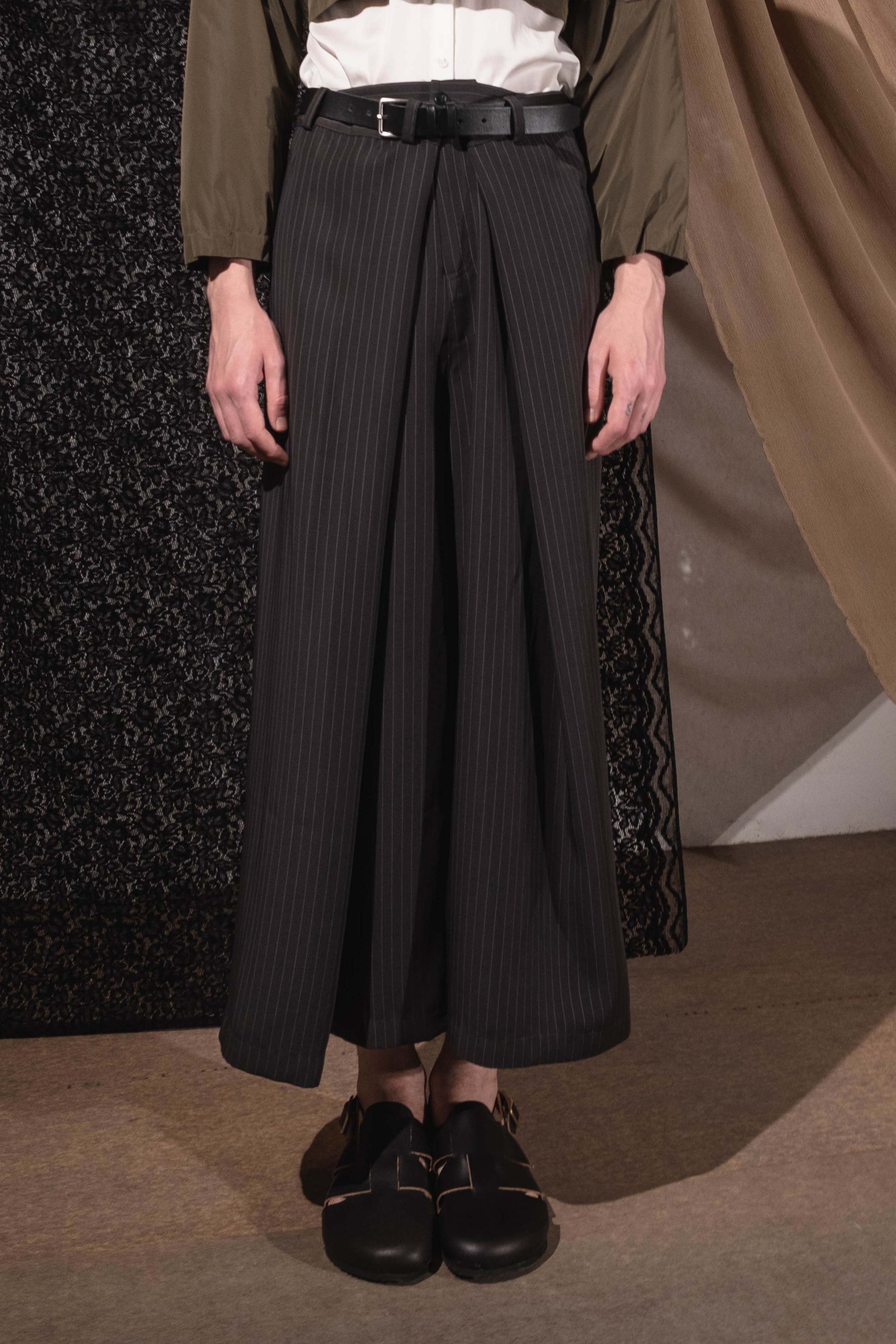 Inspired from traditional square cut kung fu and fishermen pants, these grey striped suiting 3 way pants take a modern twist with an adjustable waist size and versatile wearing options. The button up details at the two sides allow for a customizable fit, and you may styled with a belt for a traditional pant style. Alternatively, wear them as a salon wrap skirt by using the belt. An invisible zipper in the right bottom inner seam creates a stylish skirt slit for added flair.