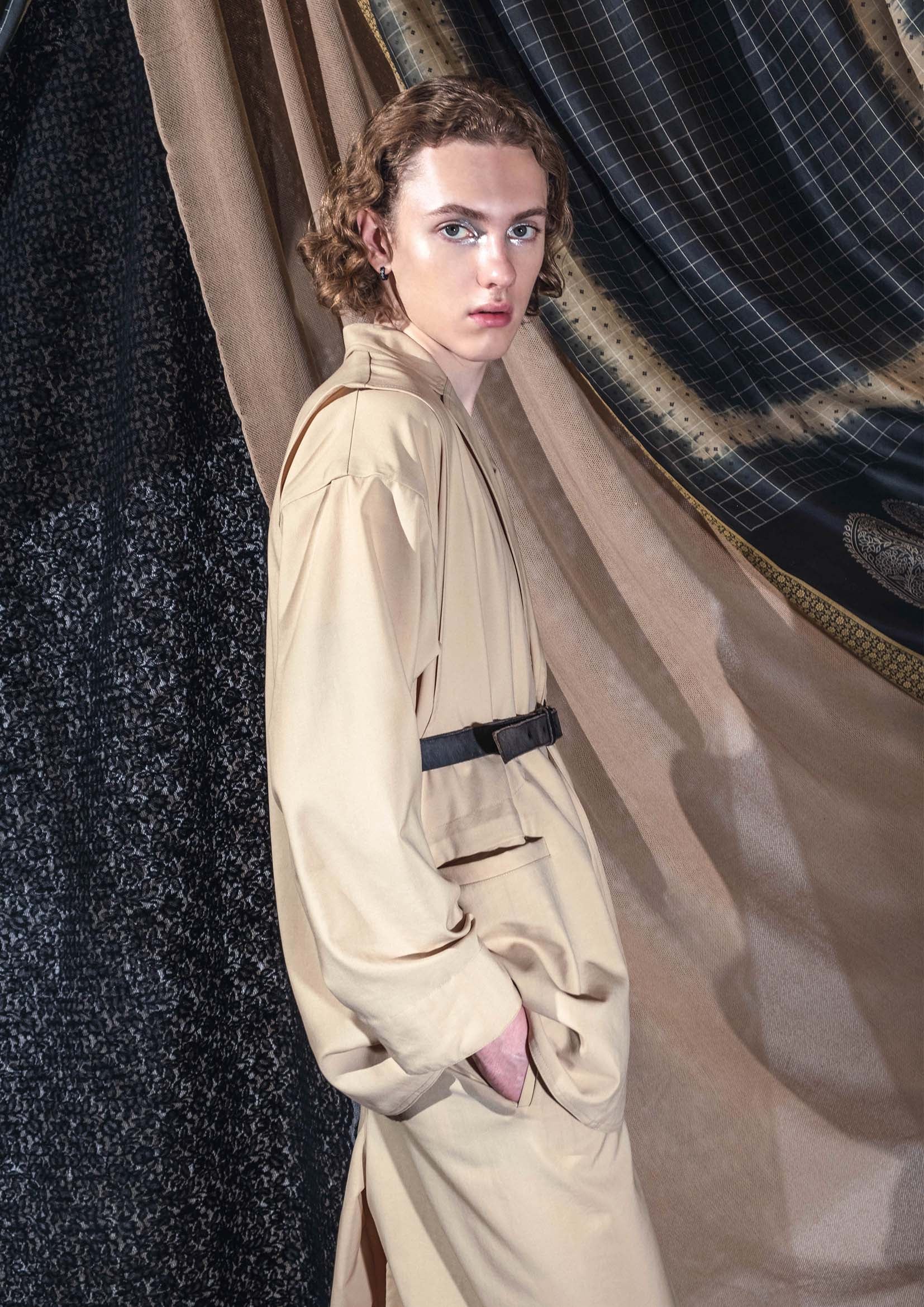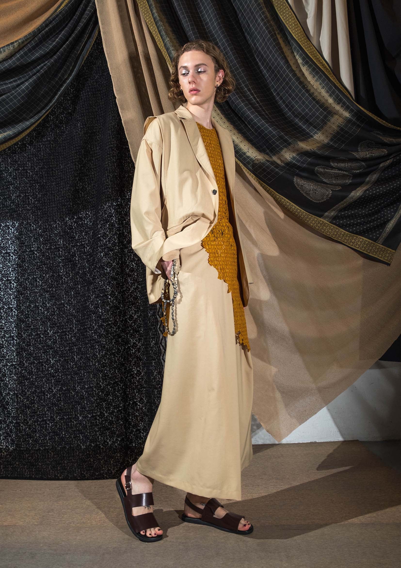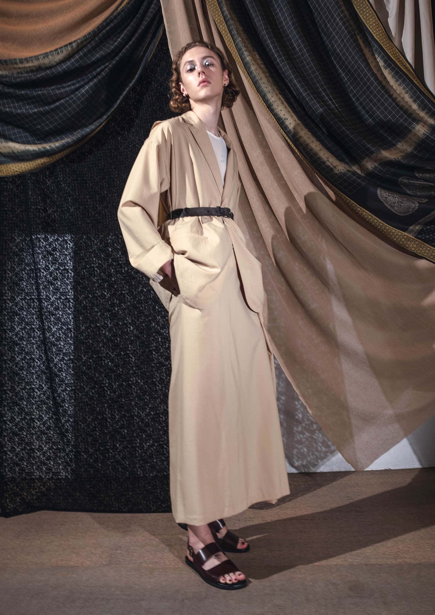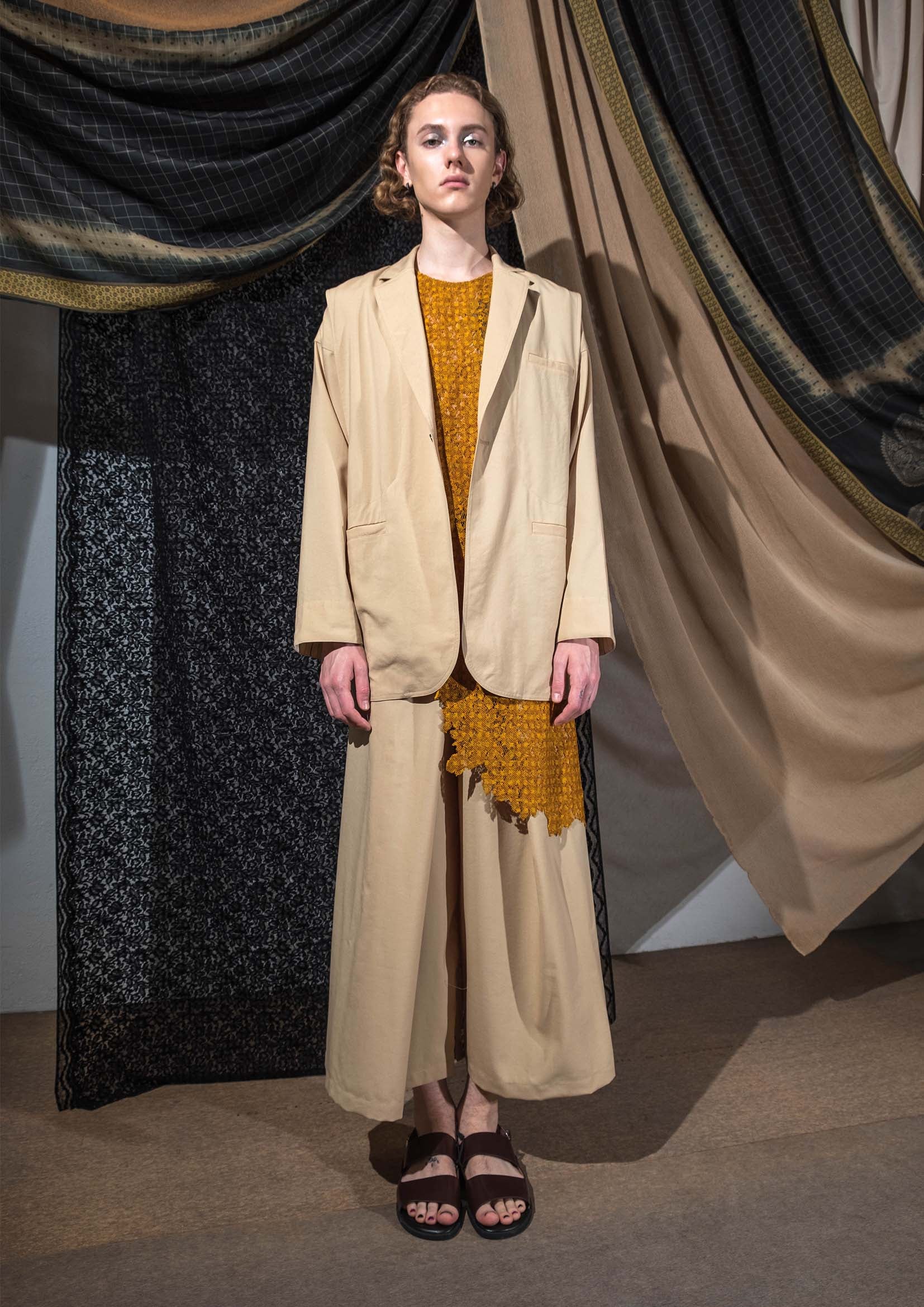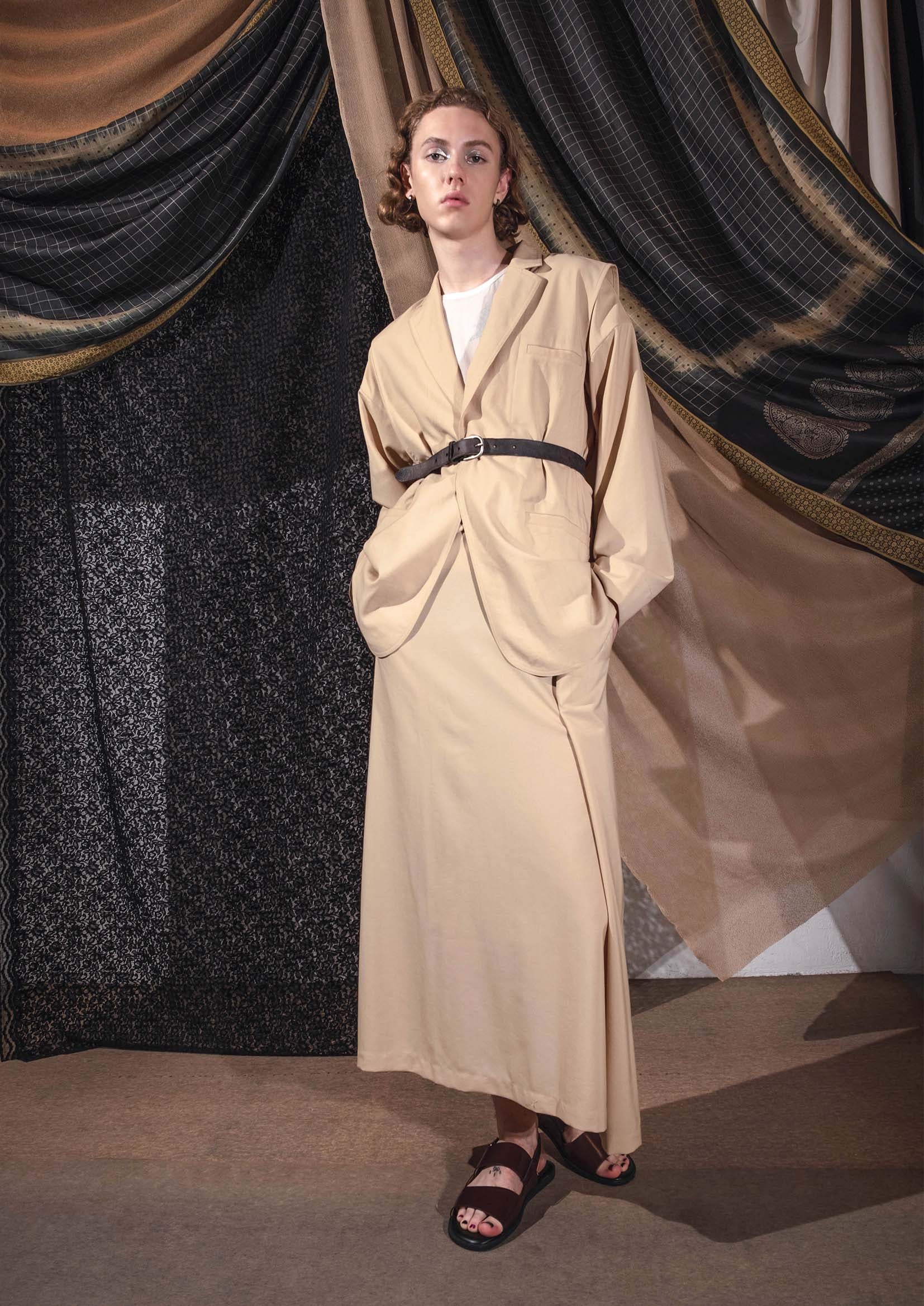 Featuring a double vest layer on top, this mustard woolen blazer boasts T sleeves cutting and a high waist belt loop that can be adjusted to enhance its silhouette. The adjustable cuff length is accented with striped lining, making it suitable for both men and women.