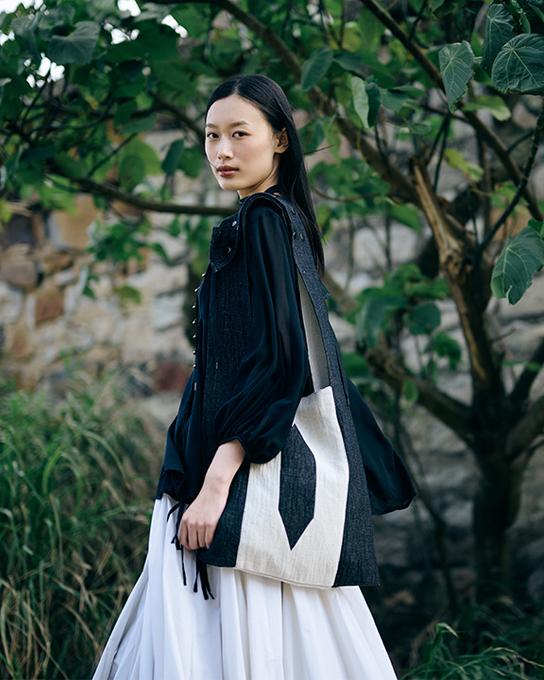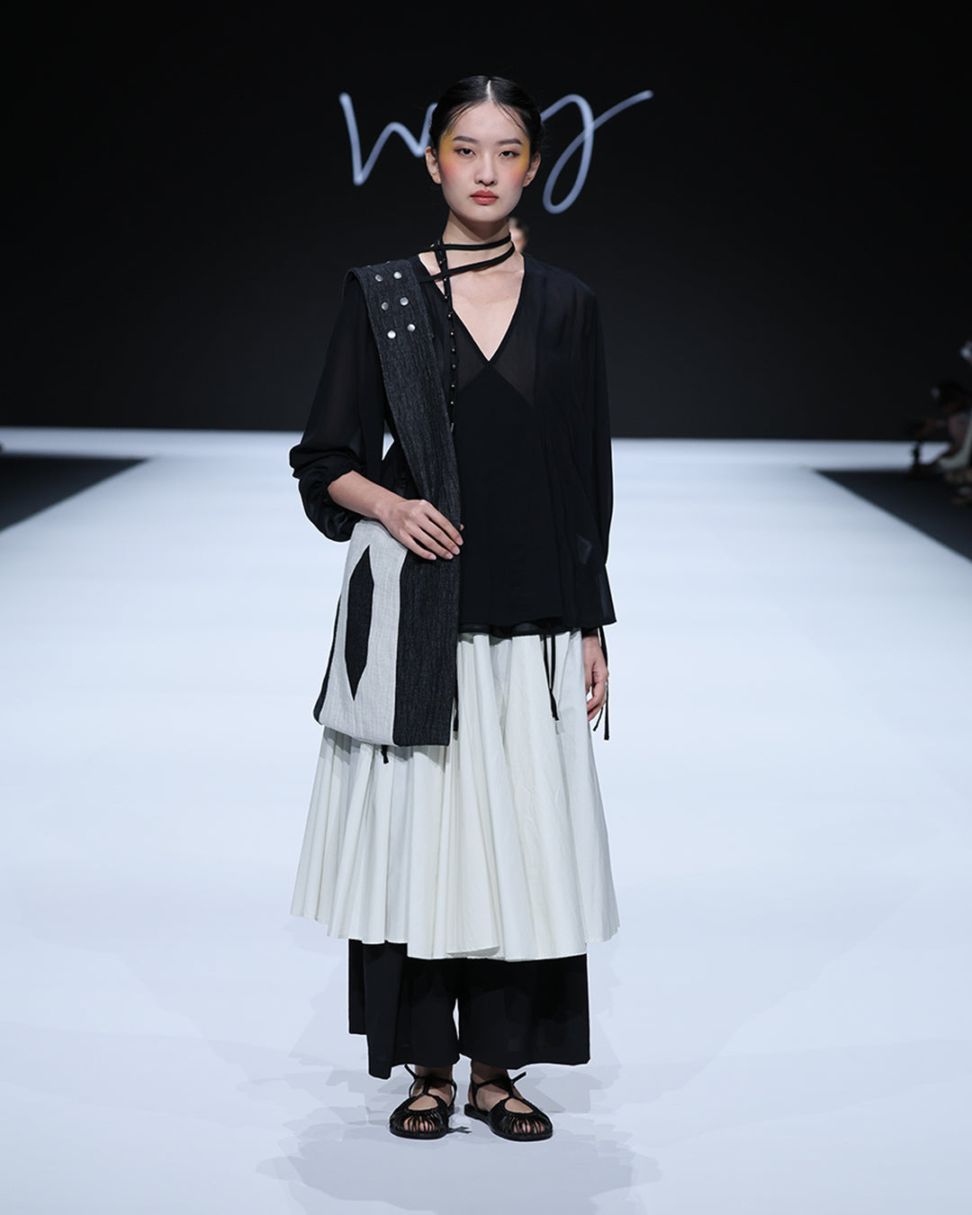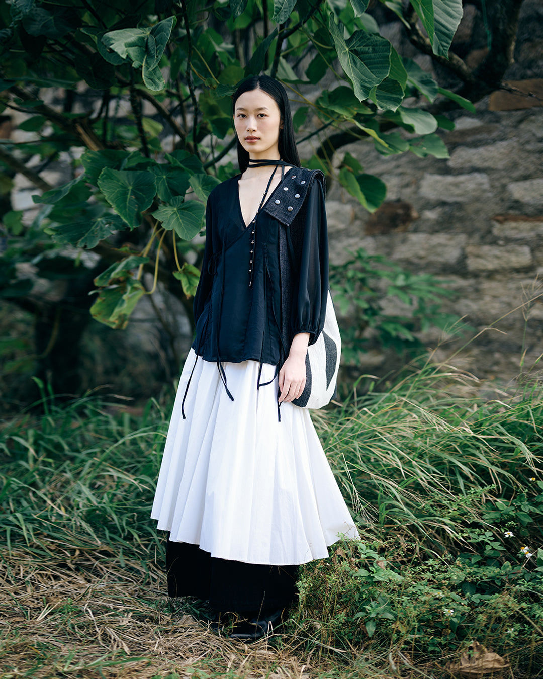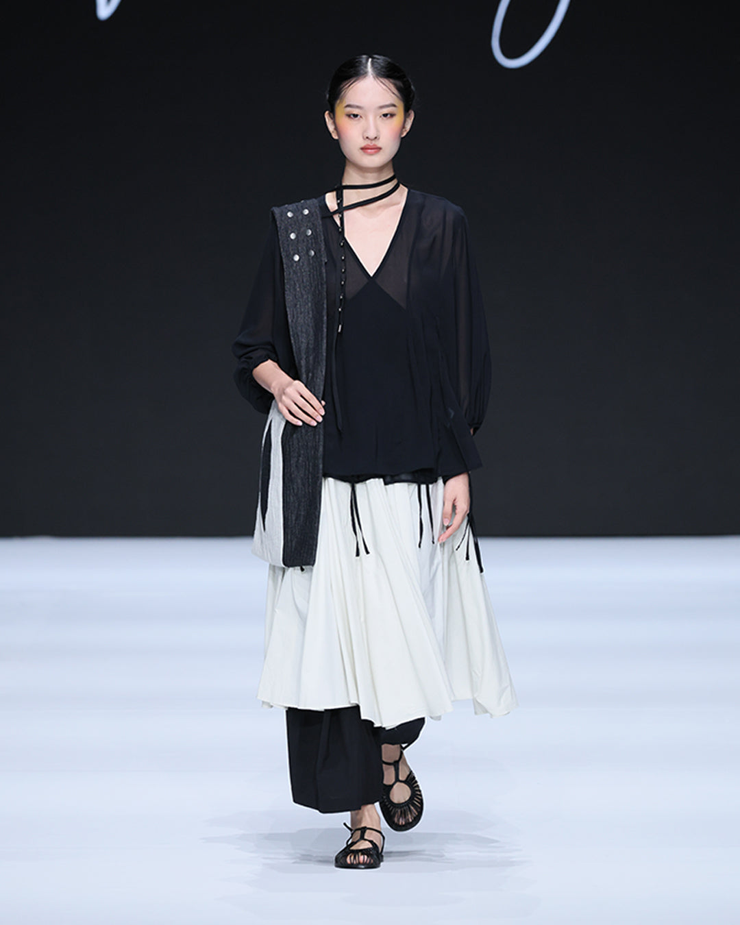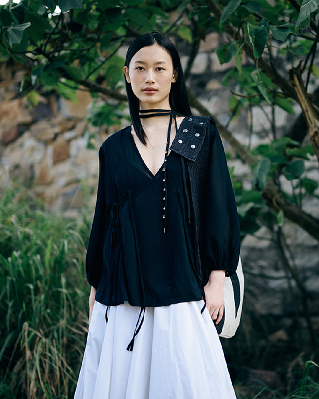 This black chiffon bubble robe top draws inspiration from traditional Indigenous clothing, with a V-neck, see-through fabric, and distinctive bubble sleeves and flared bottom design. The width can be easily adjusted by tying the various tapes through the button loops.
