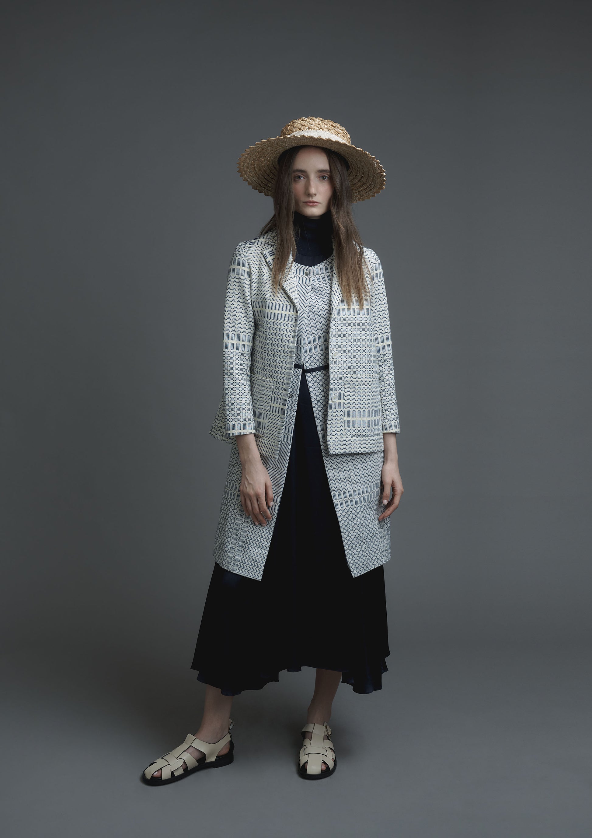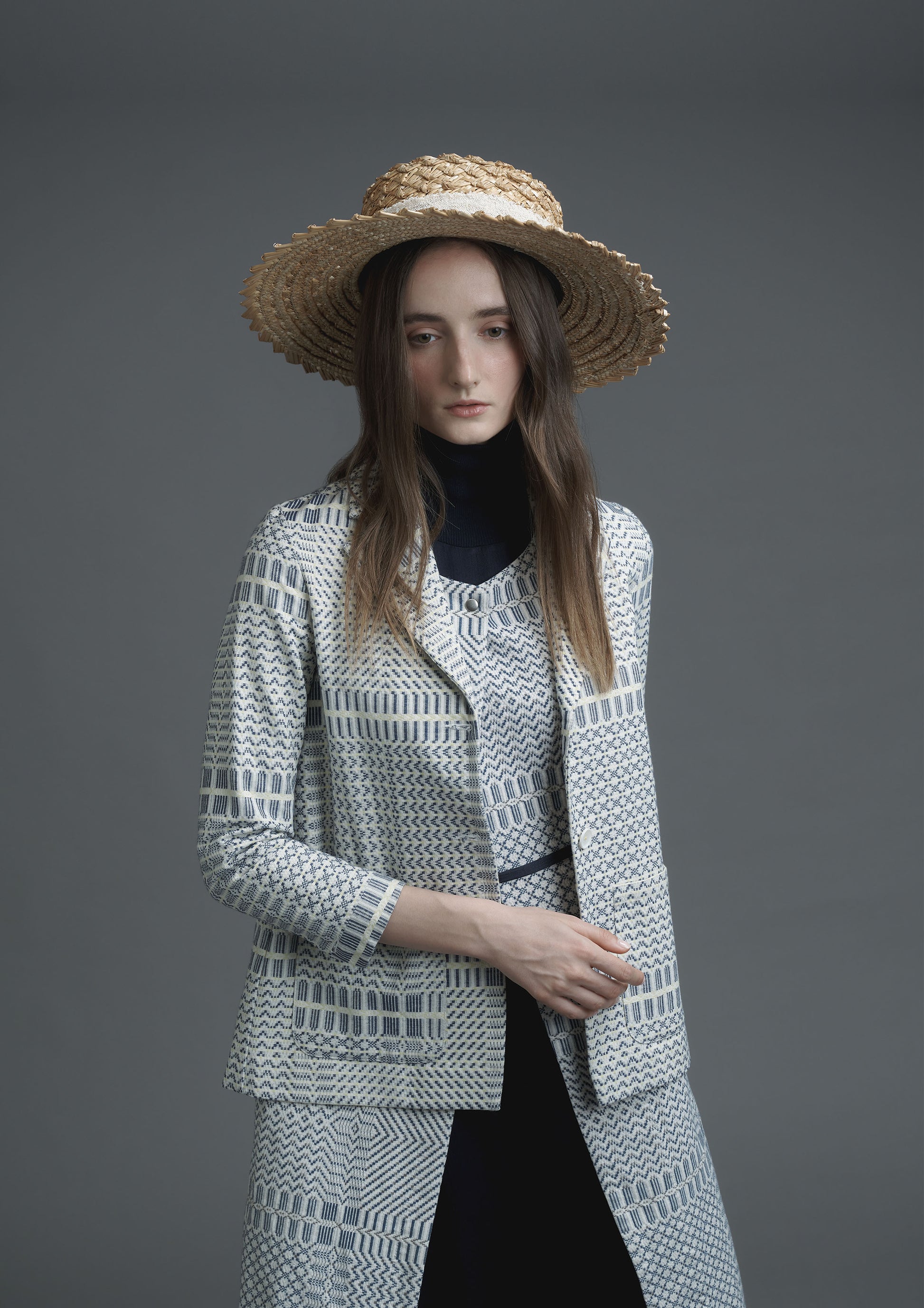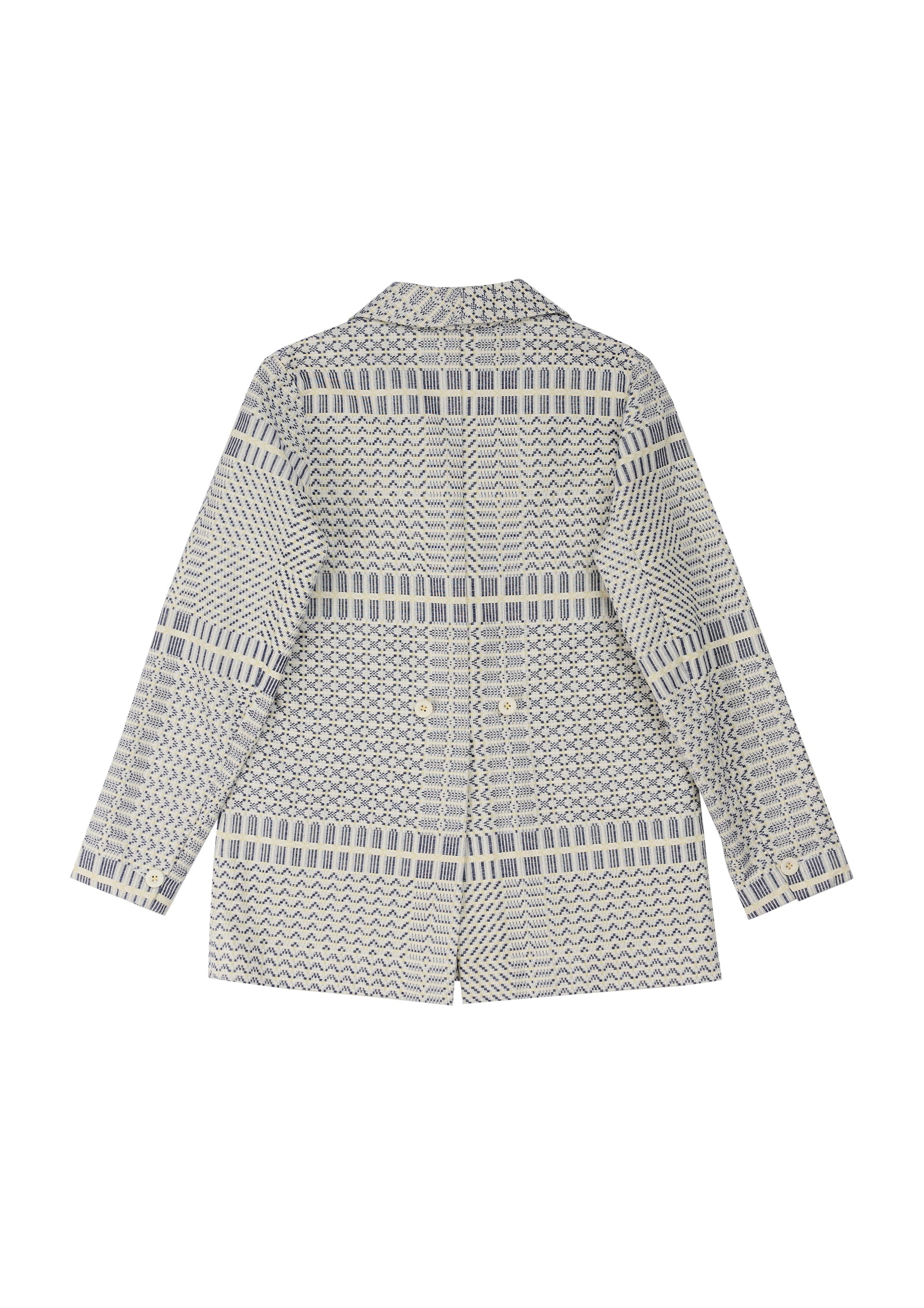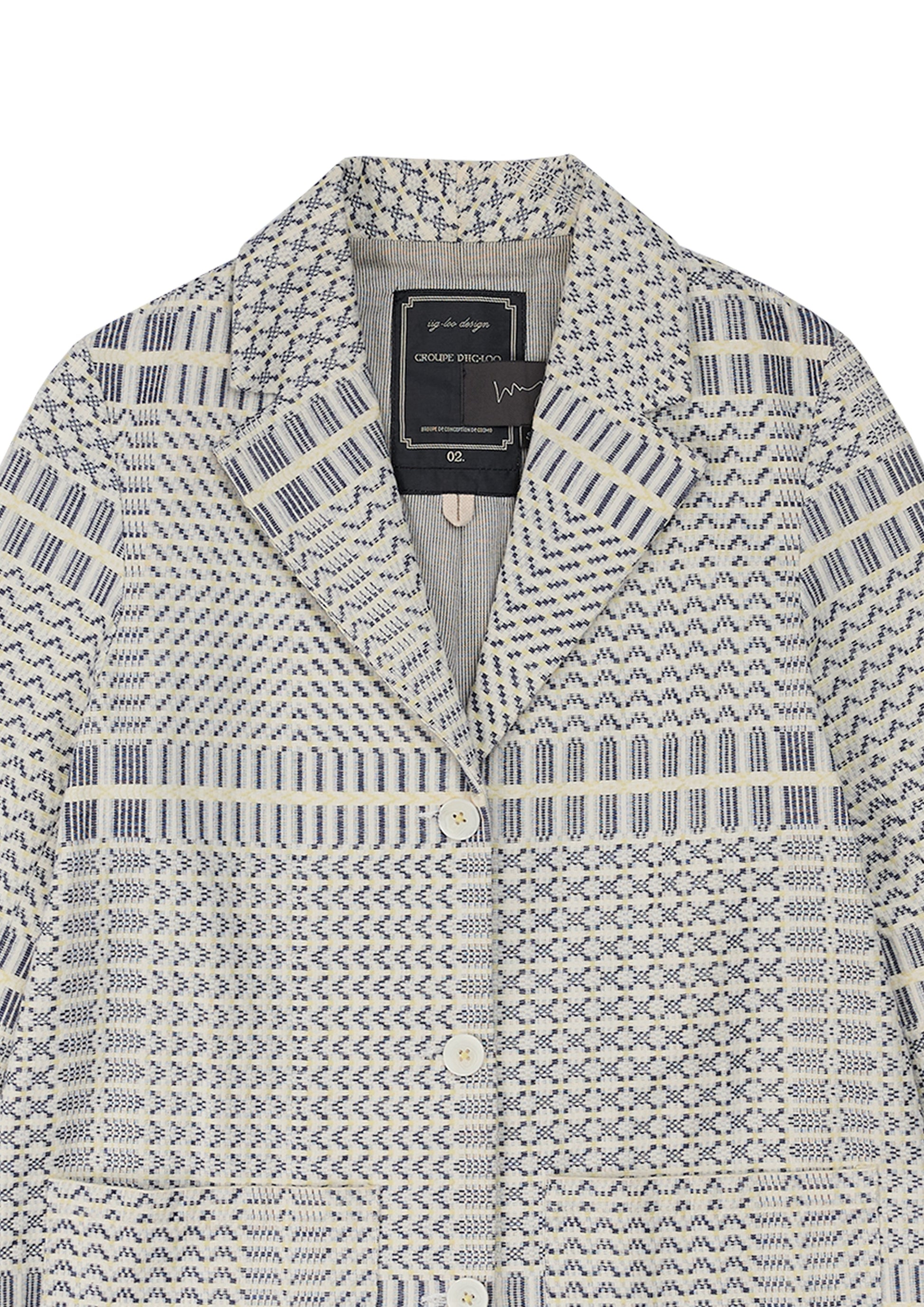Revamp this garment using jacquard fabric traditionally found in coverlets, transforming it from a vintage blazer to a modern piece.