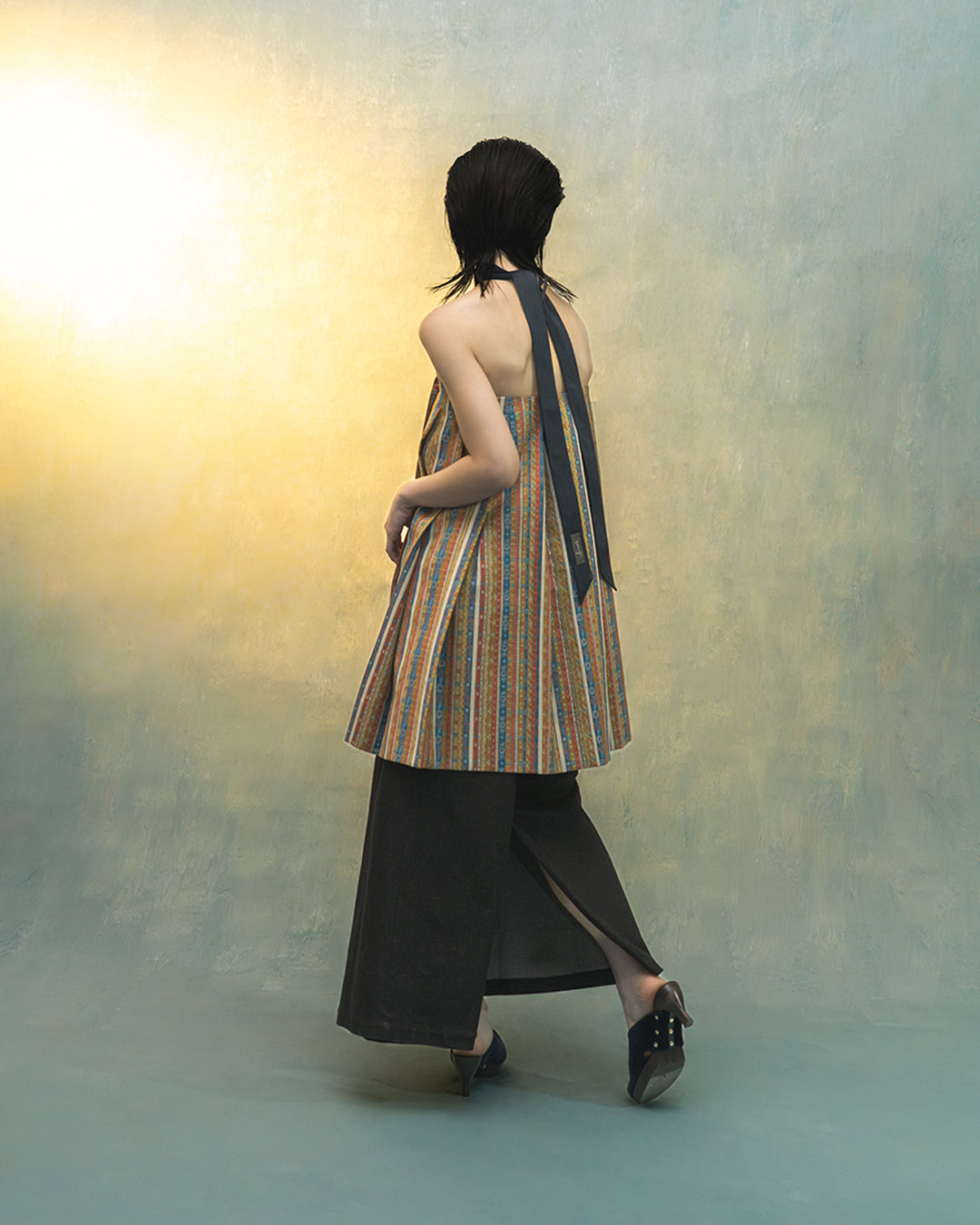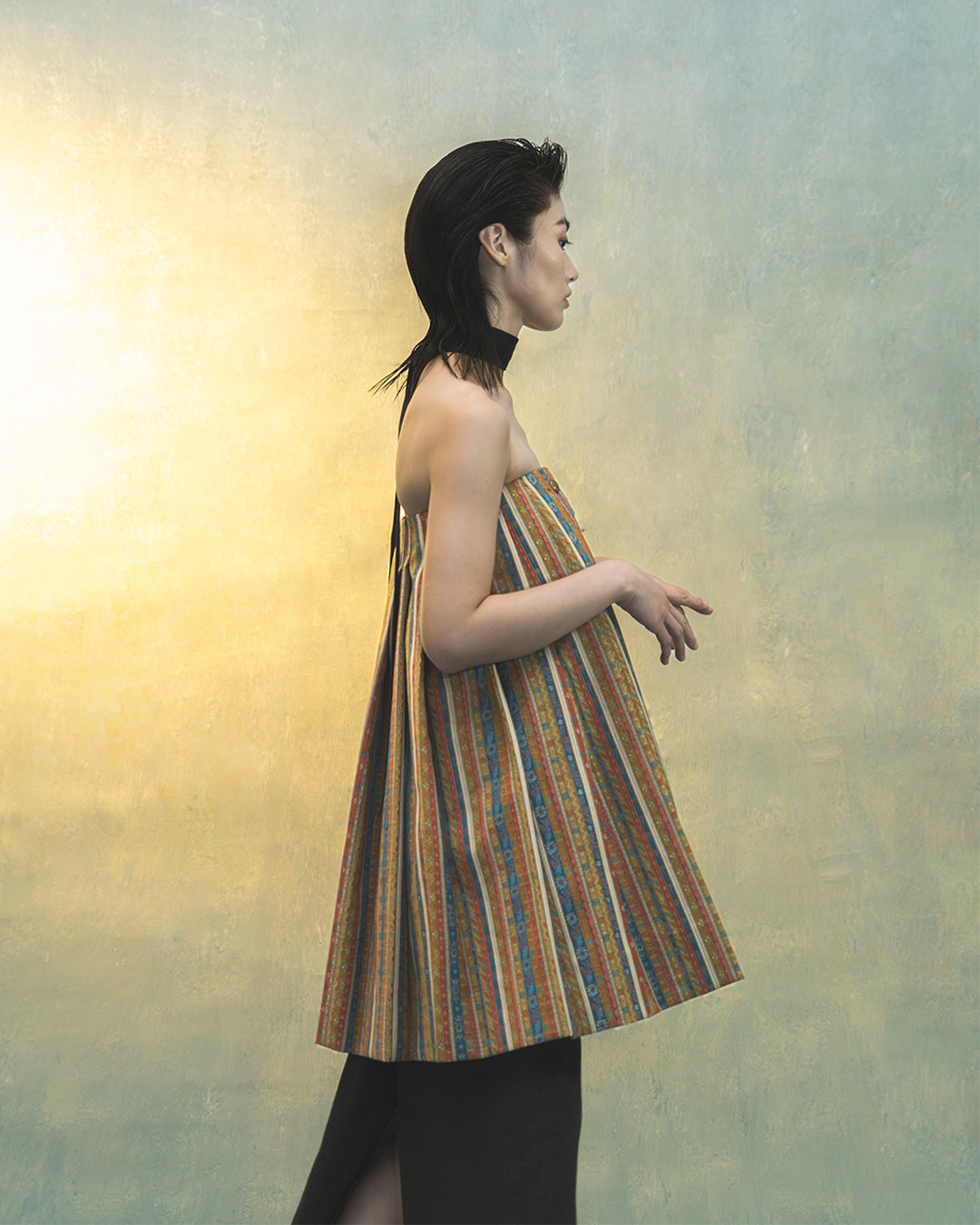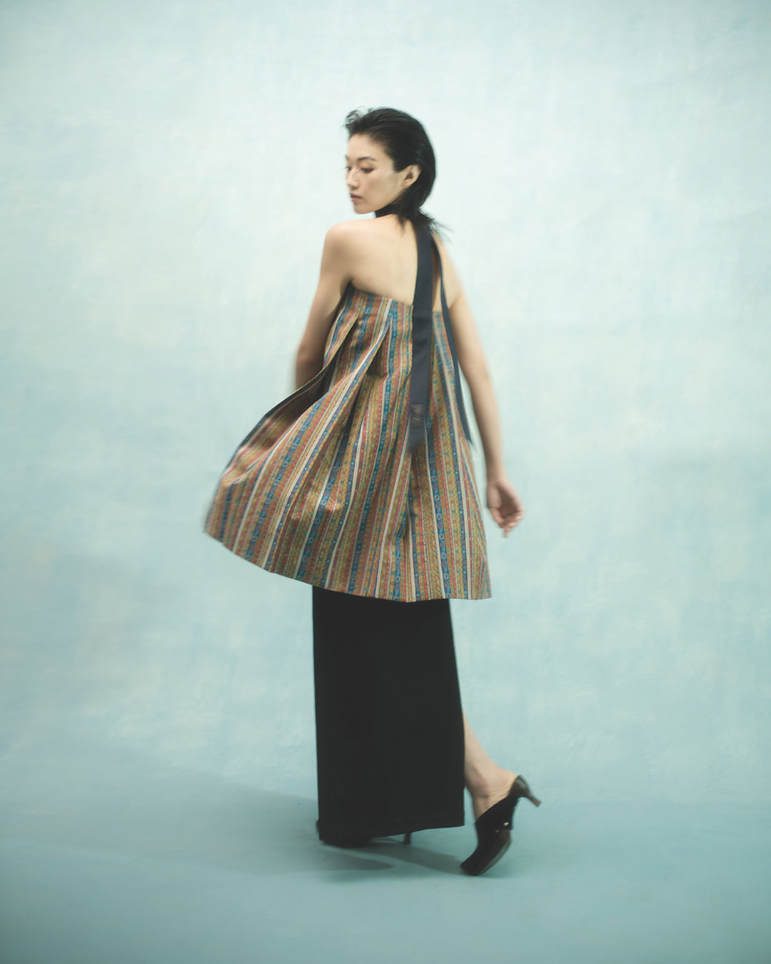 This versatile garment can be worn as a tube top or skirt, featuring an ascending pleat width design and a discreet single welt pocket hidden within the pleat. The 3 button holes allow for adjustable sizing, making it a cross-over item. It is crafted with vintage kimono fabric from UZ FABRIC, a Japanese company dedicated to upcycling, and constructed with a modern high design interpretation for future generations. Each kimono is used to create one unique fold skirt, making this a one-of-a-kind piece.