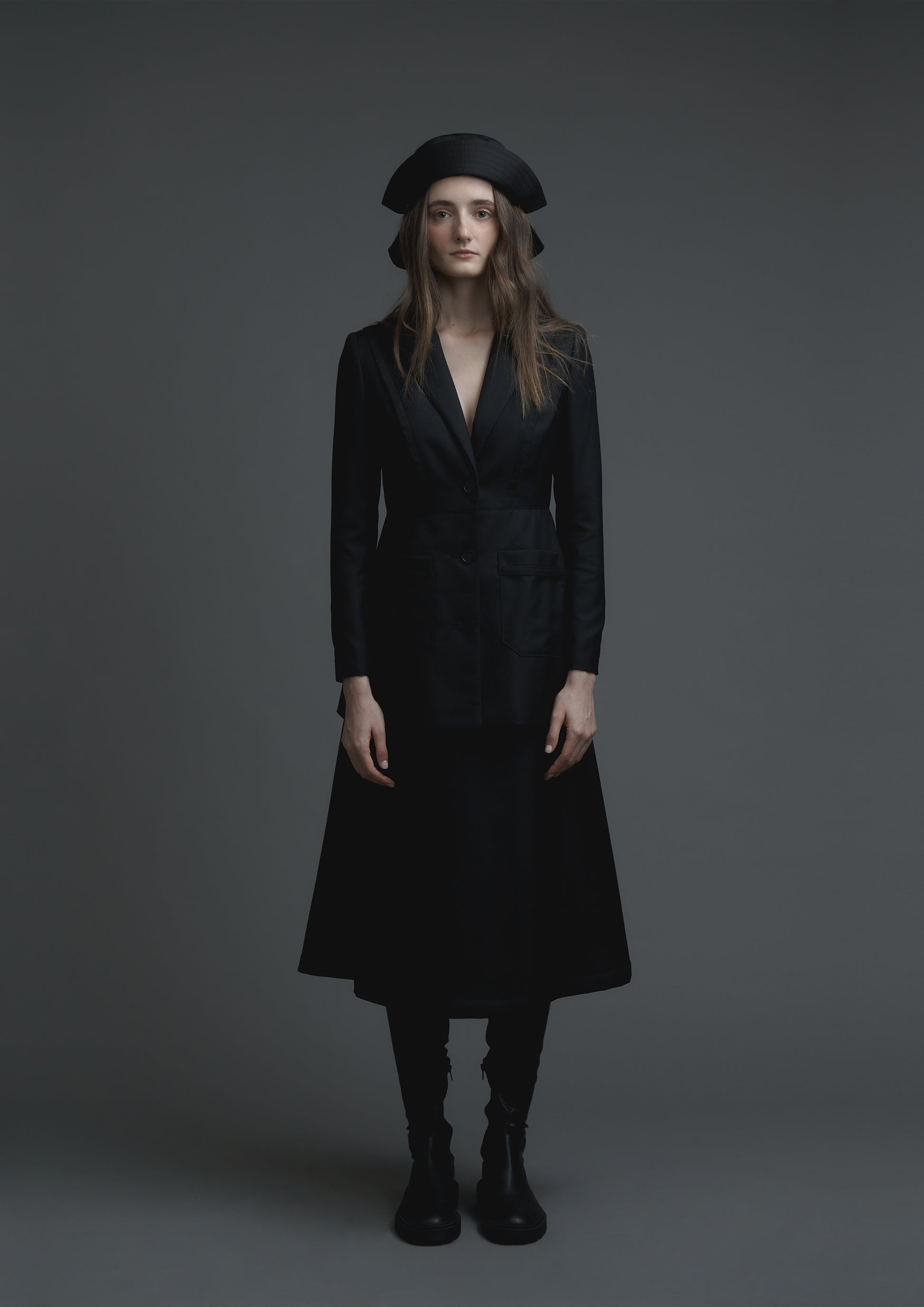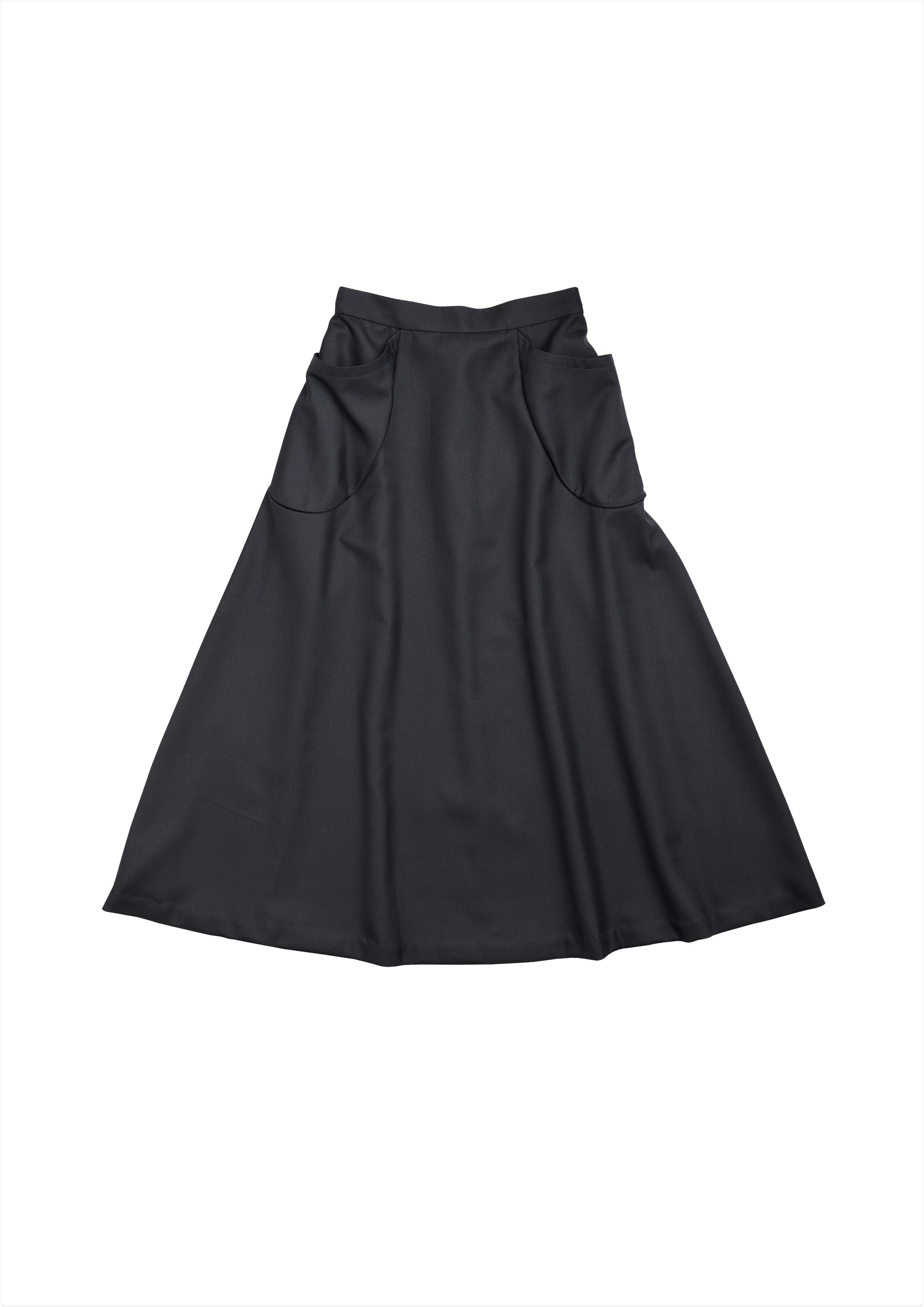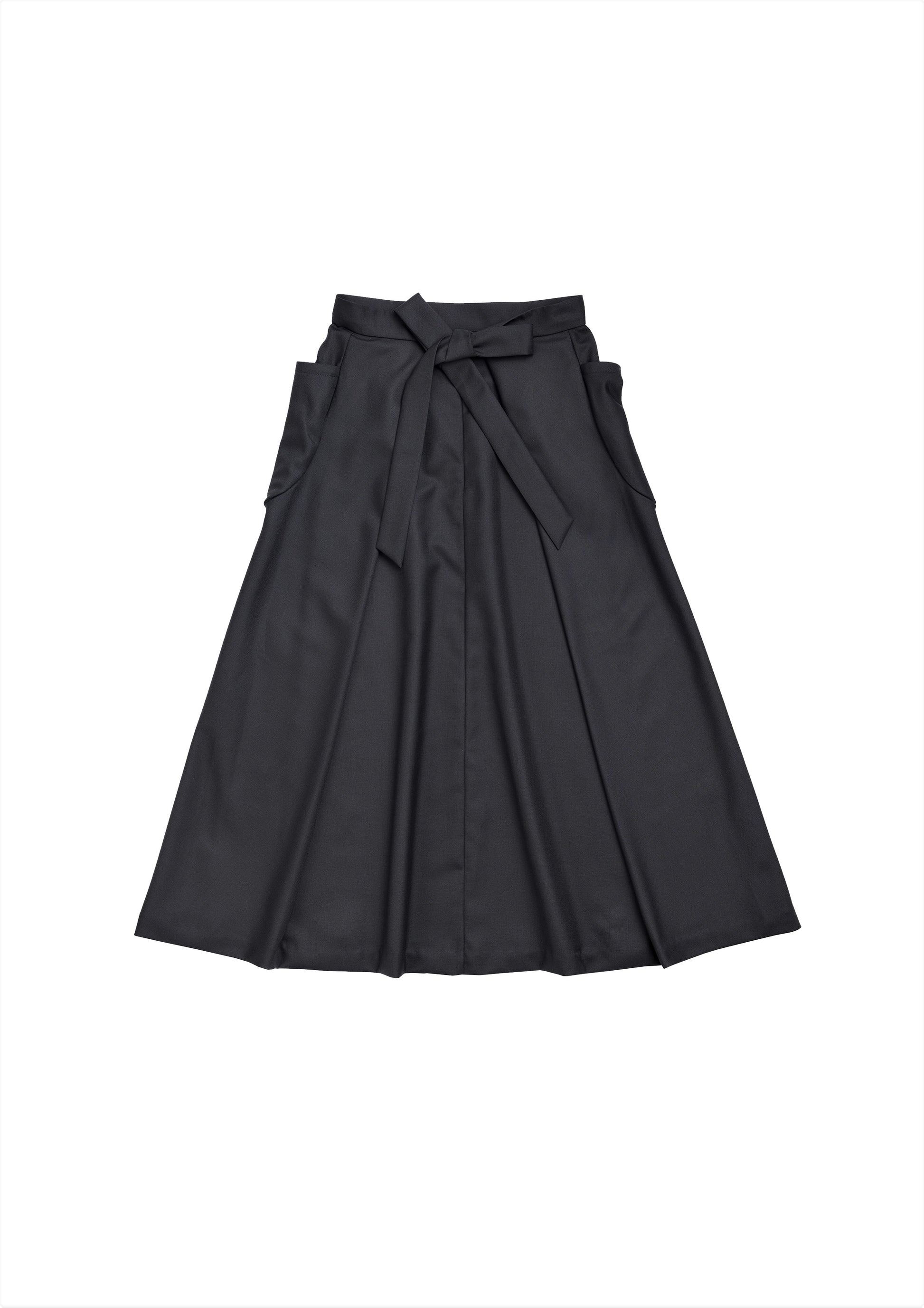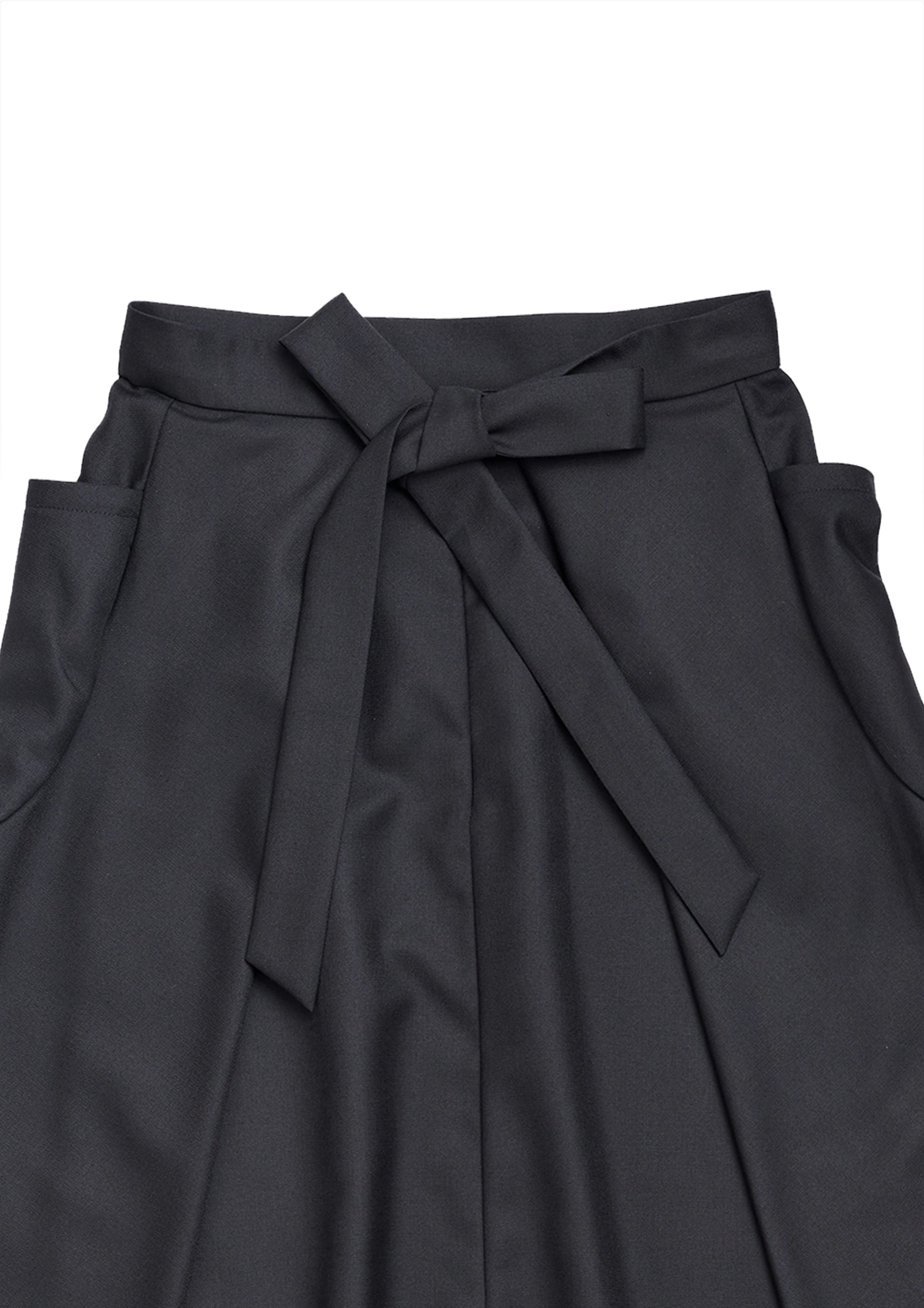 Inspired by vintage nurse aprons, this black suiting skirt features a back opening with a knot and two 3D front pockets.