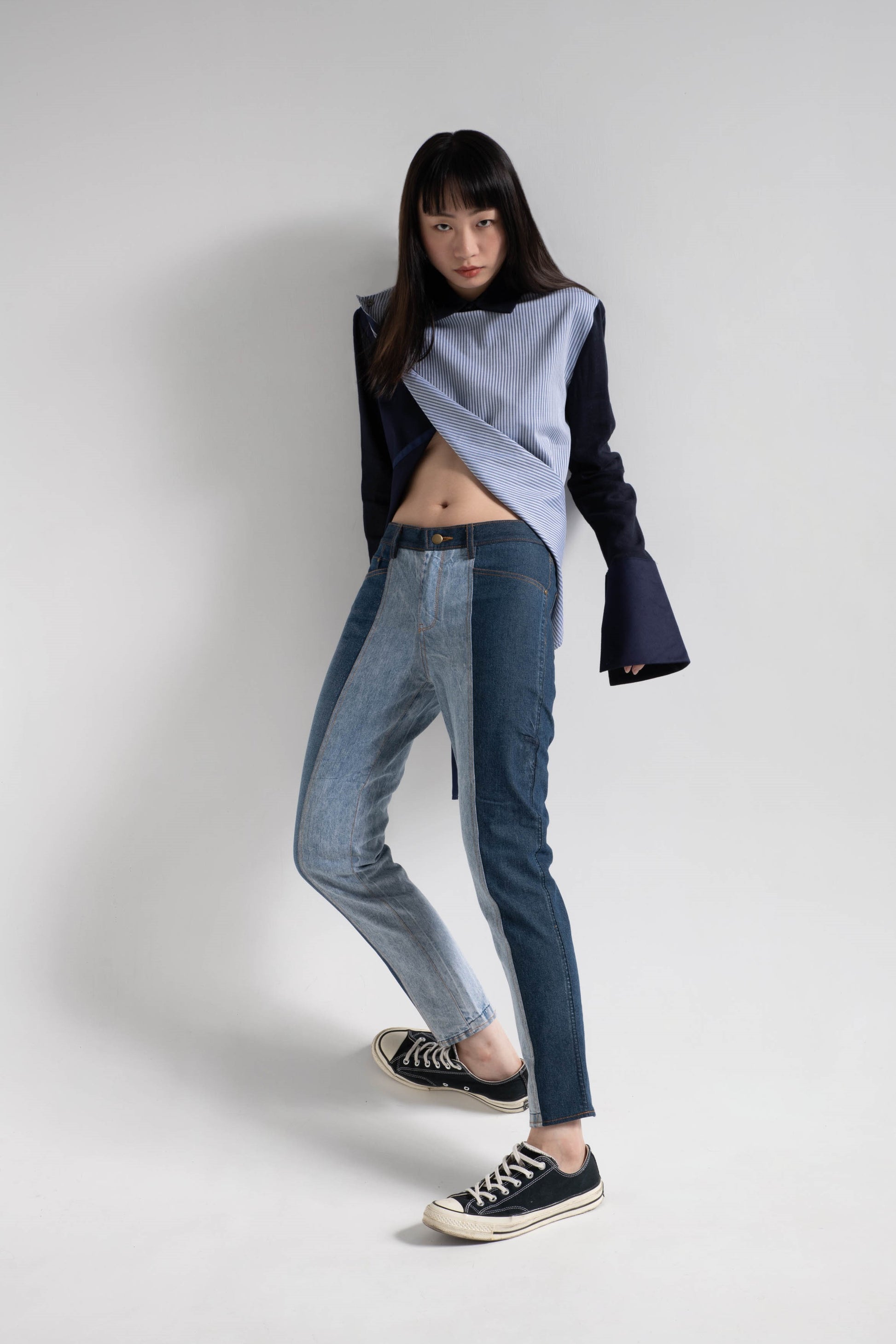 Patched fabric overlap shirt in blue striped shirting and navy cotton rayon