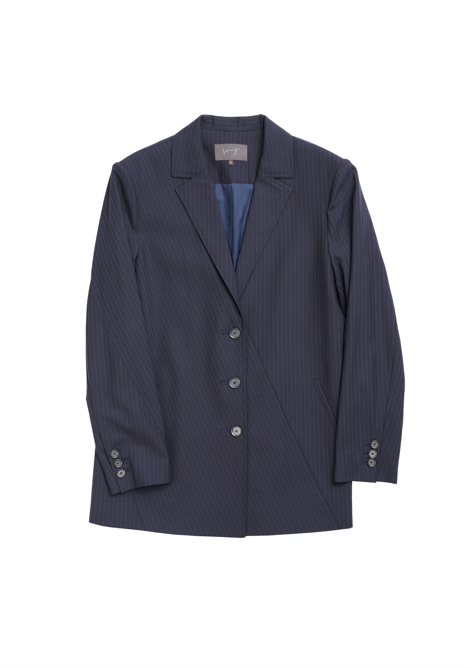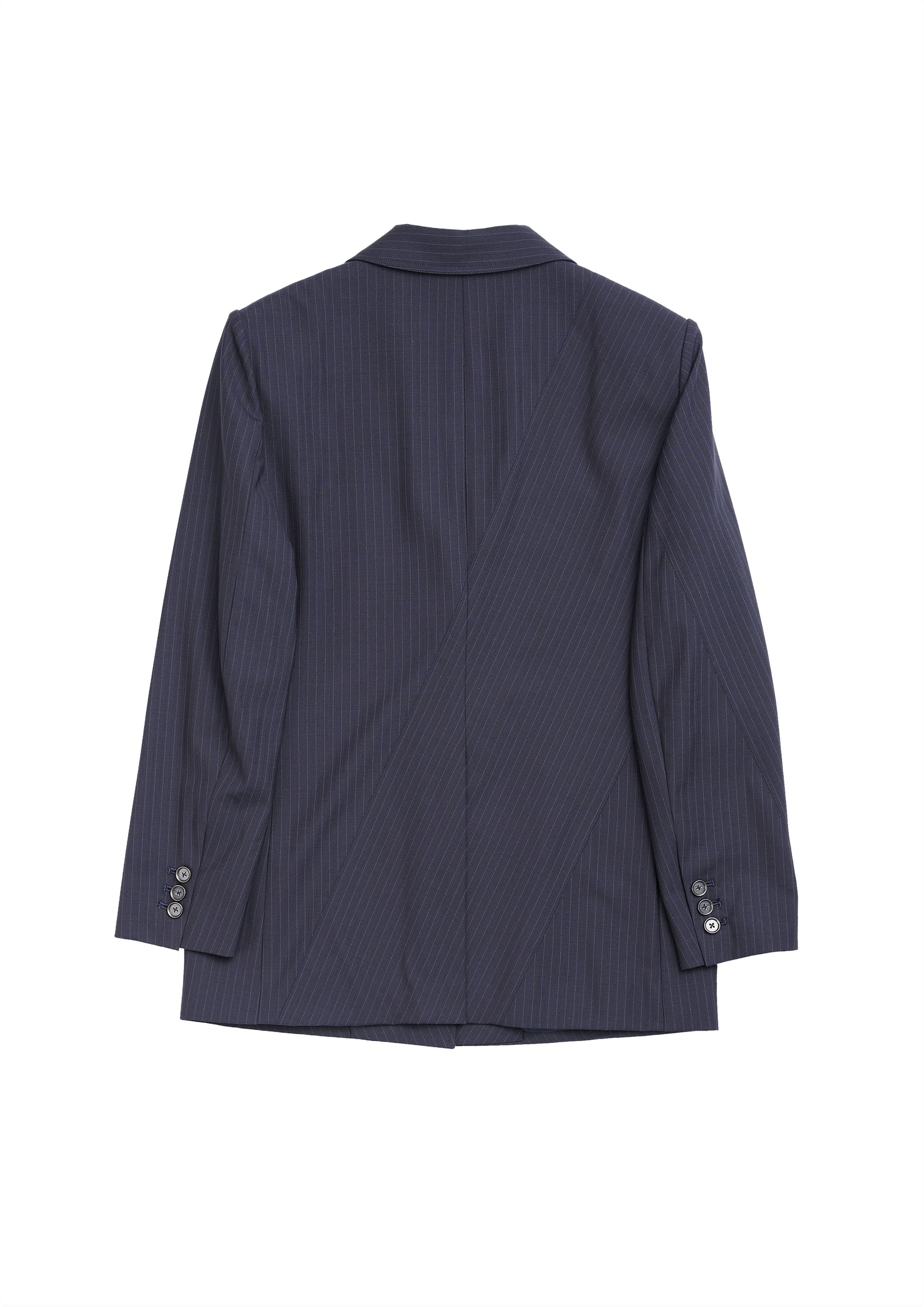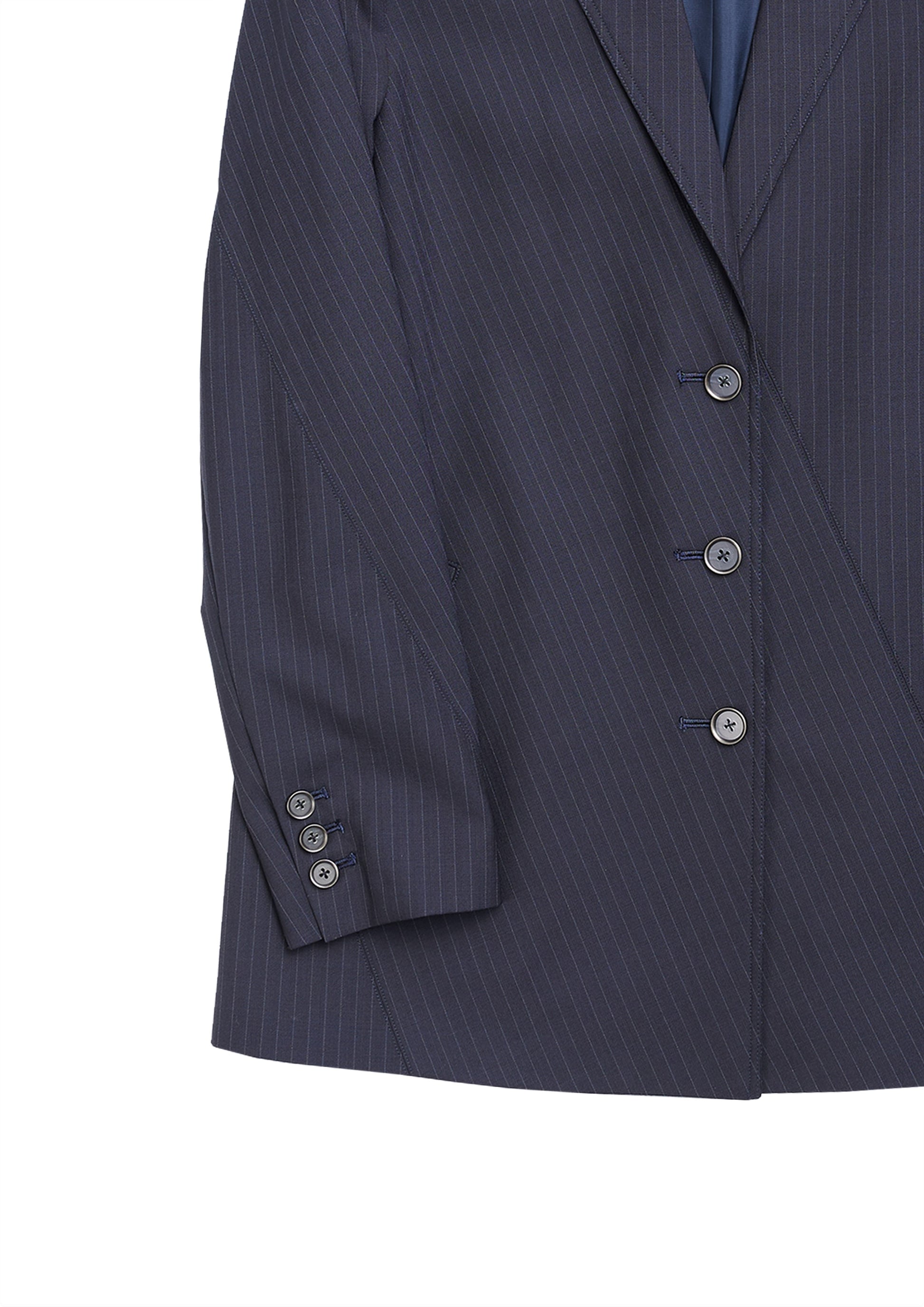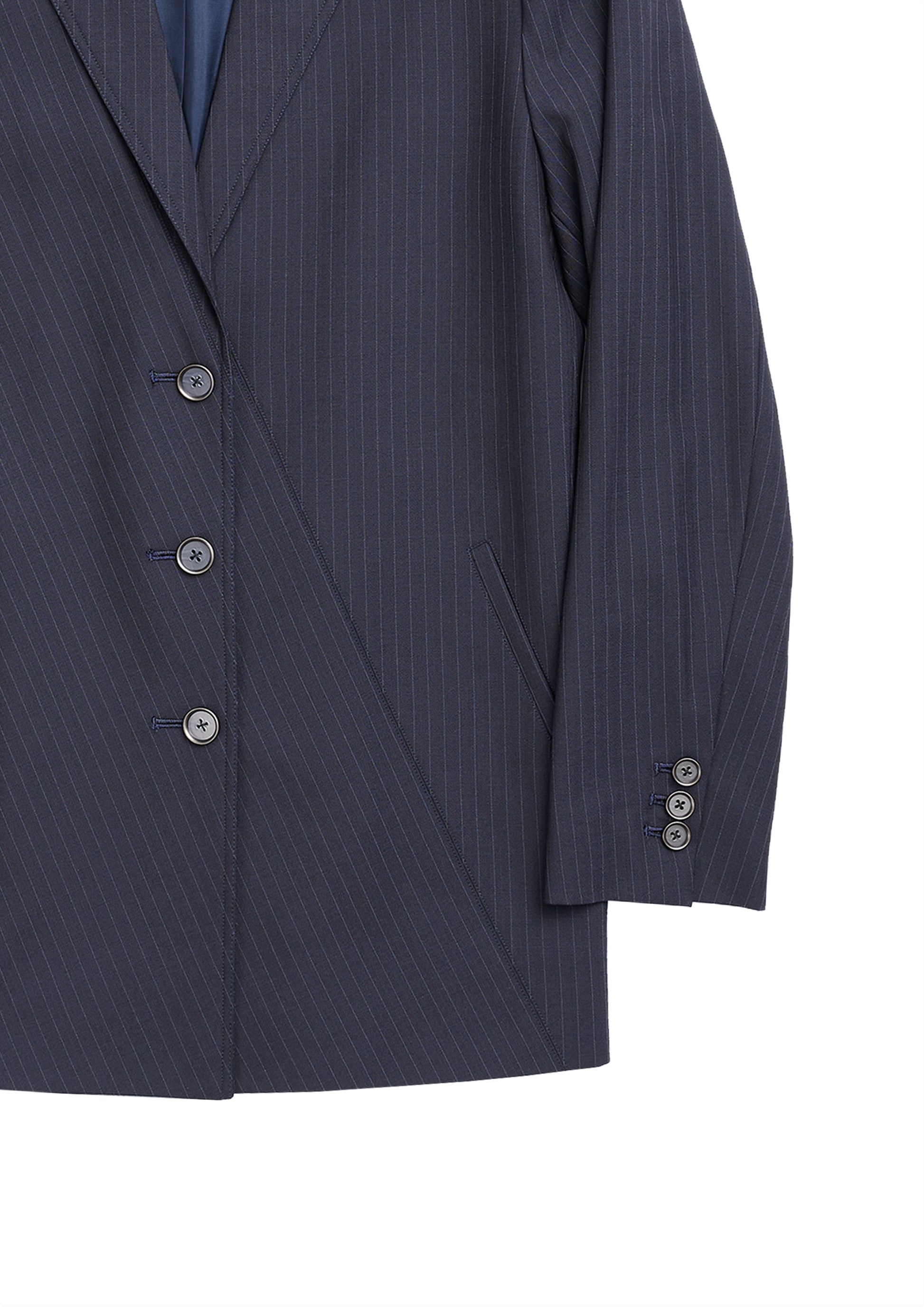This navy striped woolen suiting features a slash cut design and a loose fit silhouette for a modern and comfortable look.