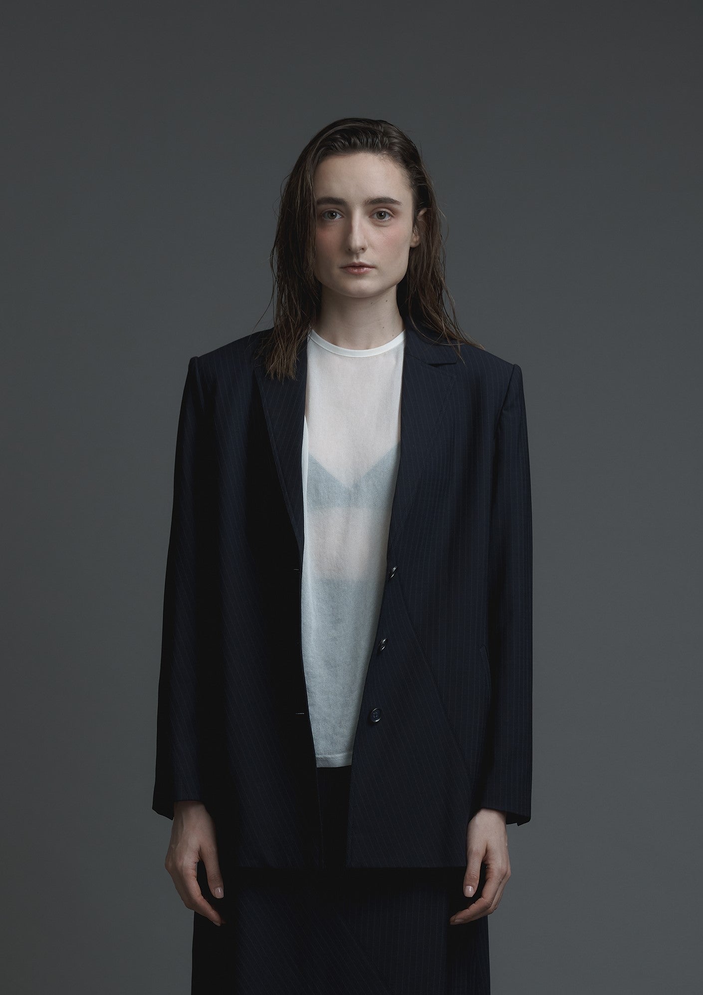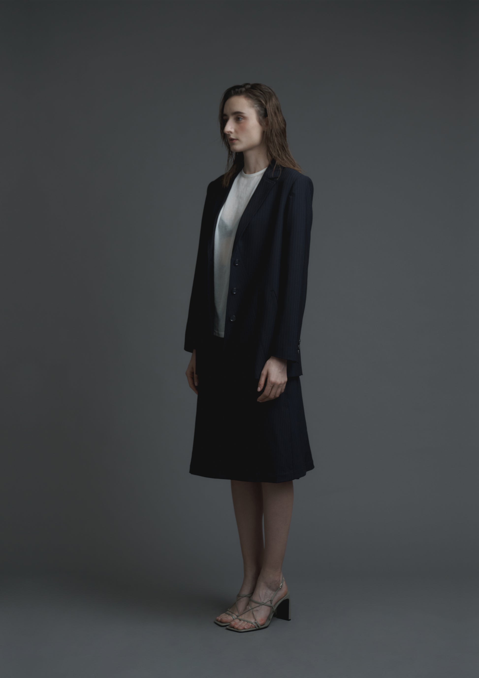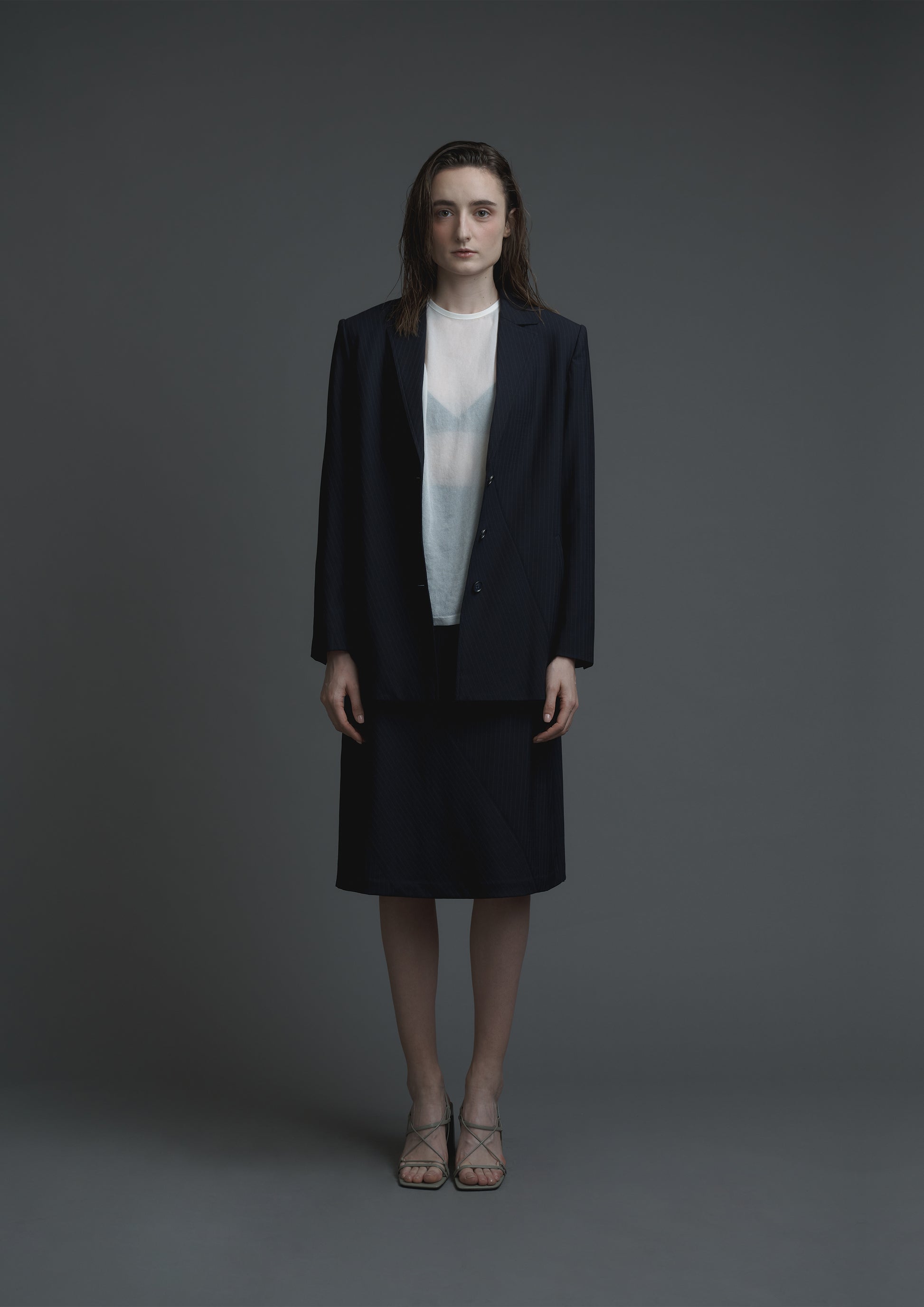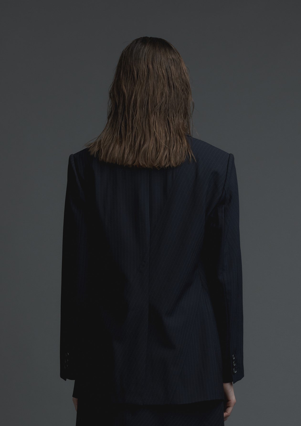 This navy striped woolen suiting features a slash cut design and a loose fit silhouette for a modern and comfortable look.