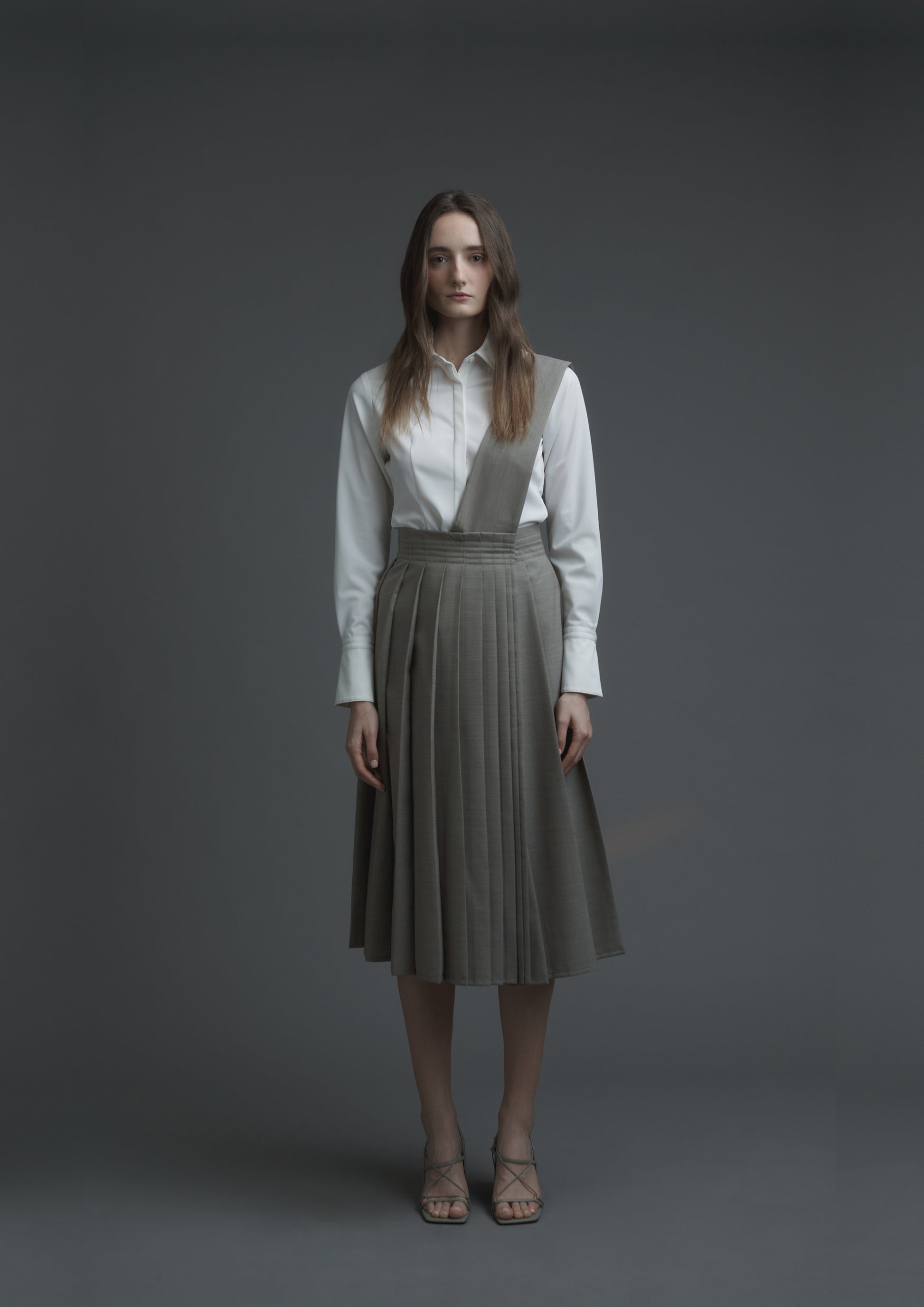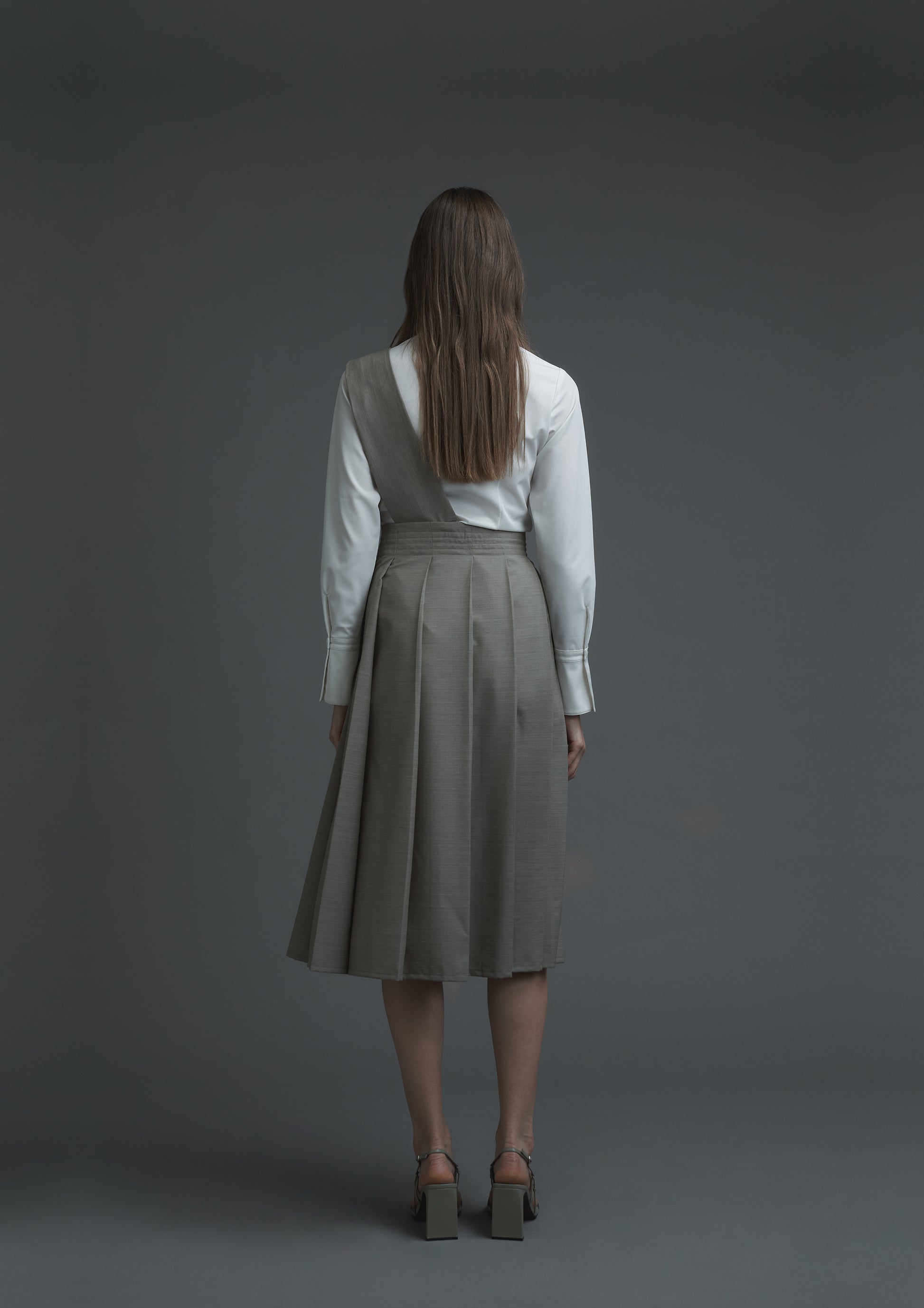 This beige striped suiting uniform pleated skirt features a half detachable zipper for versatile styling options, adjustable wrap skirt opening for a free size and customizable fit, and a convenient single side pocket for practical use.