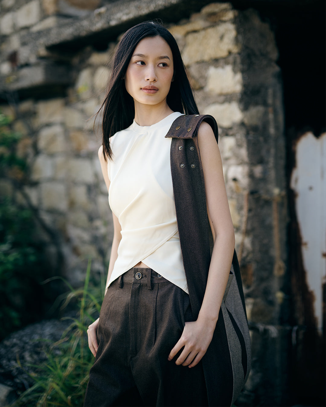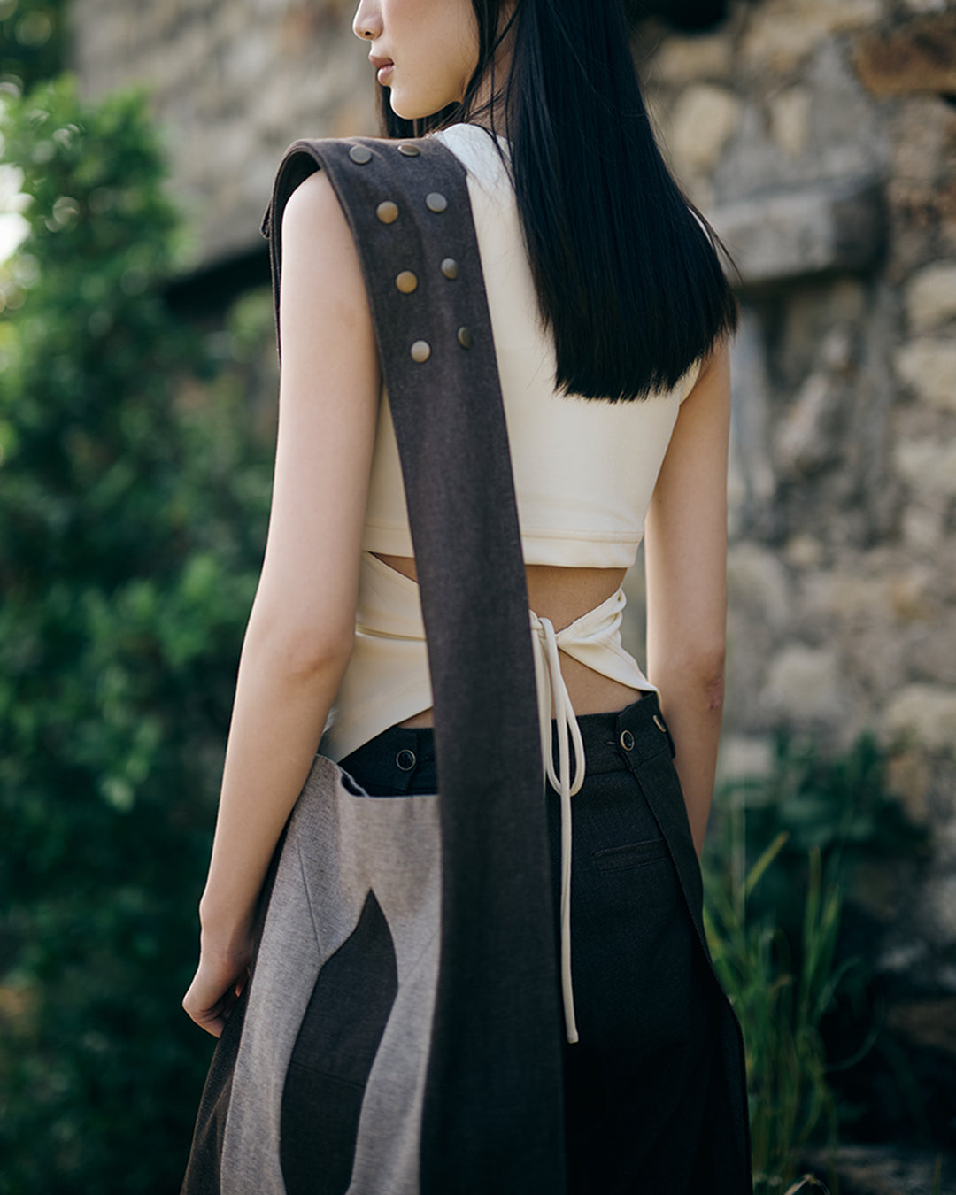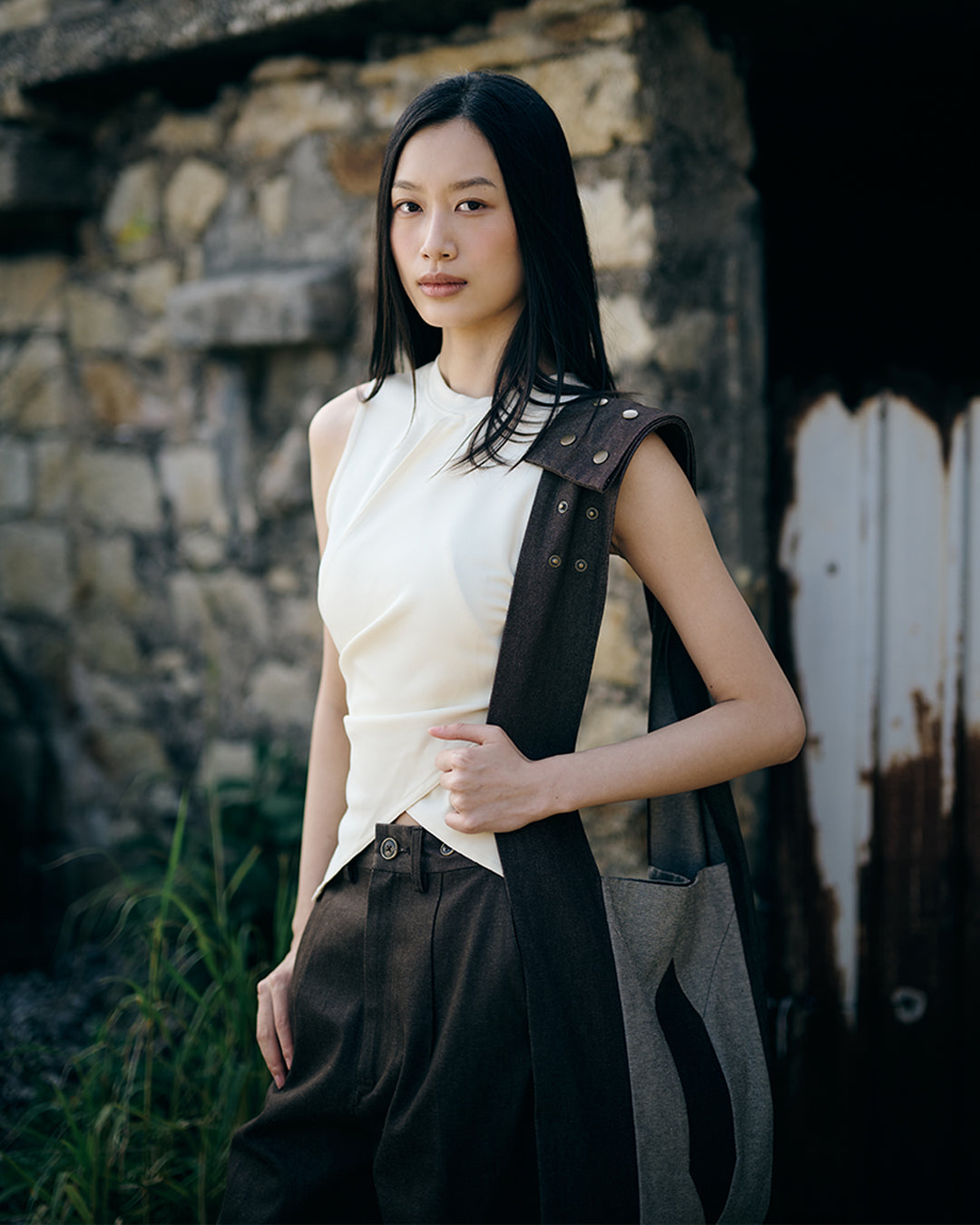 The brown denim crossbody bag is inspired by a traditional Indigenous style, with a unique hexagon panel cut featuring the initials W, H, Y. The addition of snap buttons on the shoulder strap allows for versatile wear as a shoulder bag or crossbody bag, making it a practical and stylish choice.