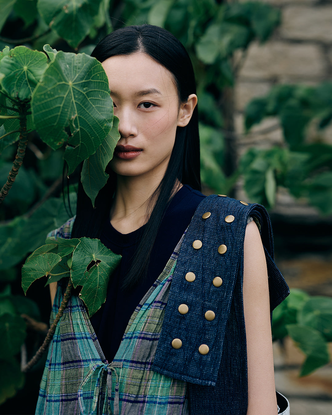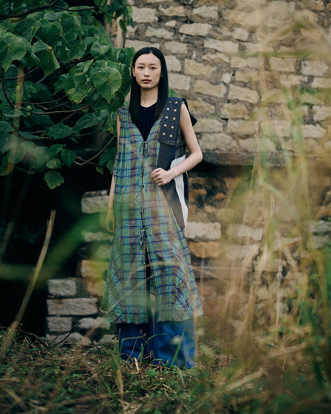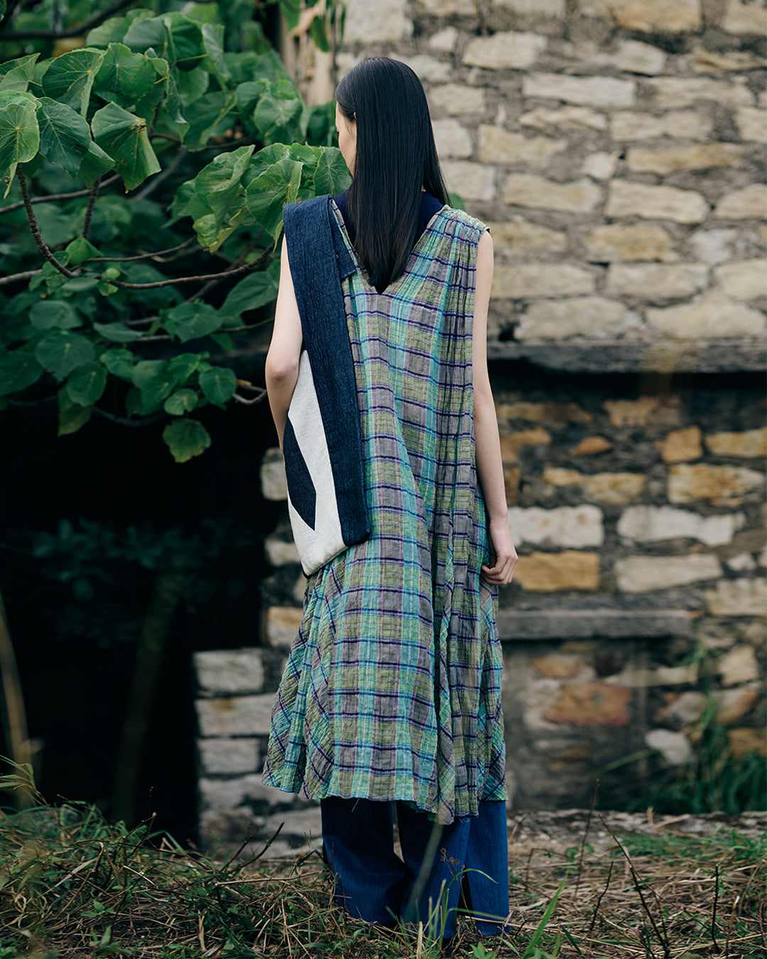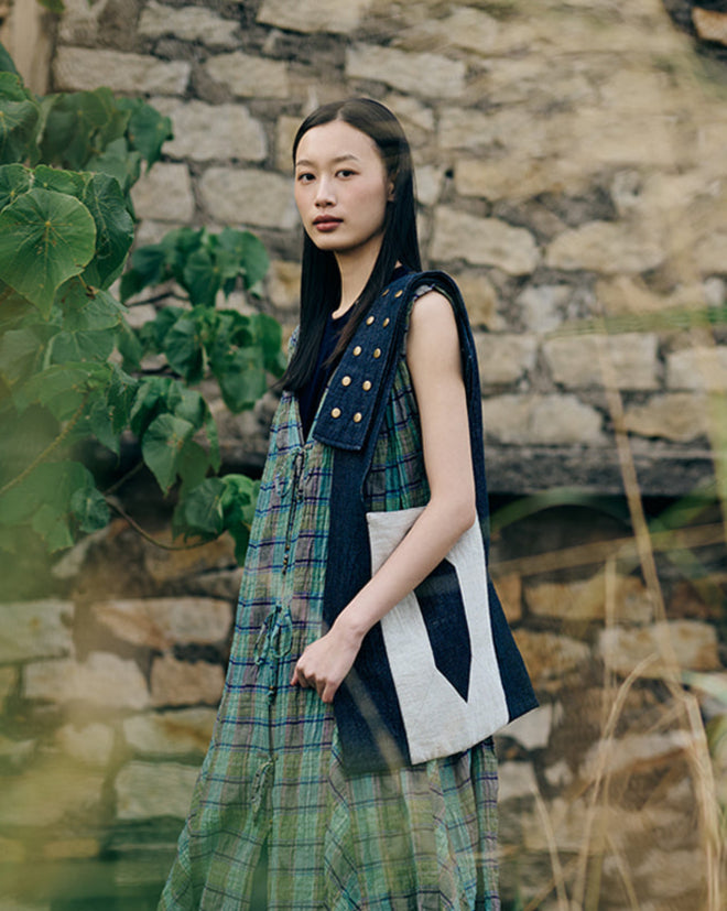 The navy cotton linen crossbody bag is inspired by a traditional Indigenous style, with a unique hexagon panel cut featuring the initials W, H, Y. The addition of snap buttons on the shoulder strap allows for versatile wear as a shoulder bag or crossbody bag, making it a practical and stylish choice.