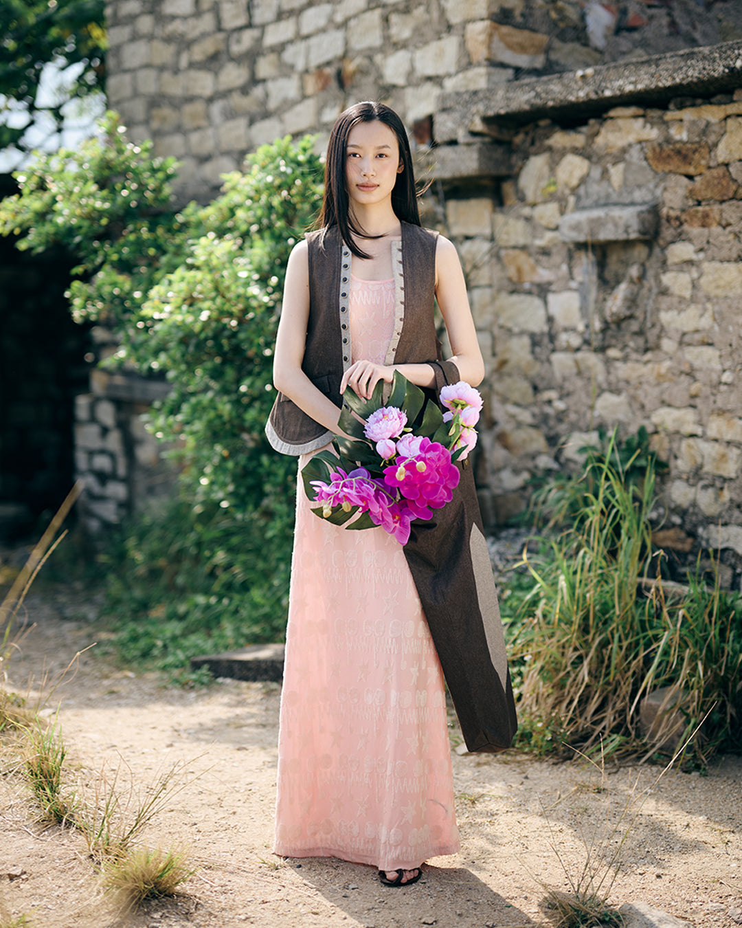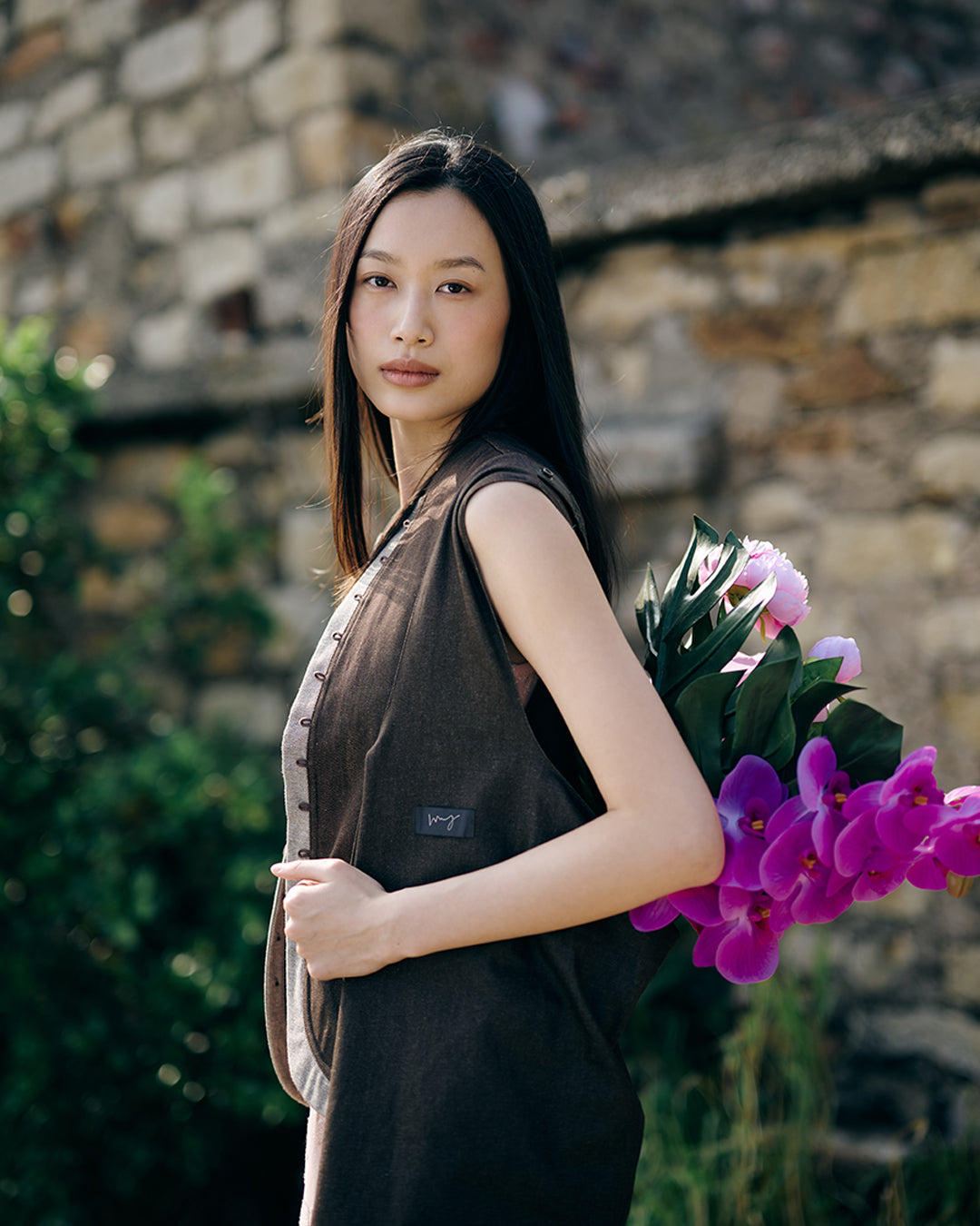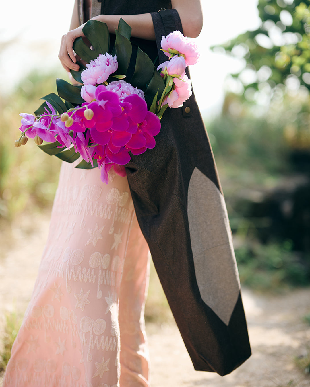 The brown denim flower bag features a unique hexagon panel cut with the initials W, H, Y. Snap buttons added to the shoulder strap make it easy to roll and store inside your daily bag, increasing its practicality.