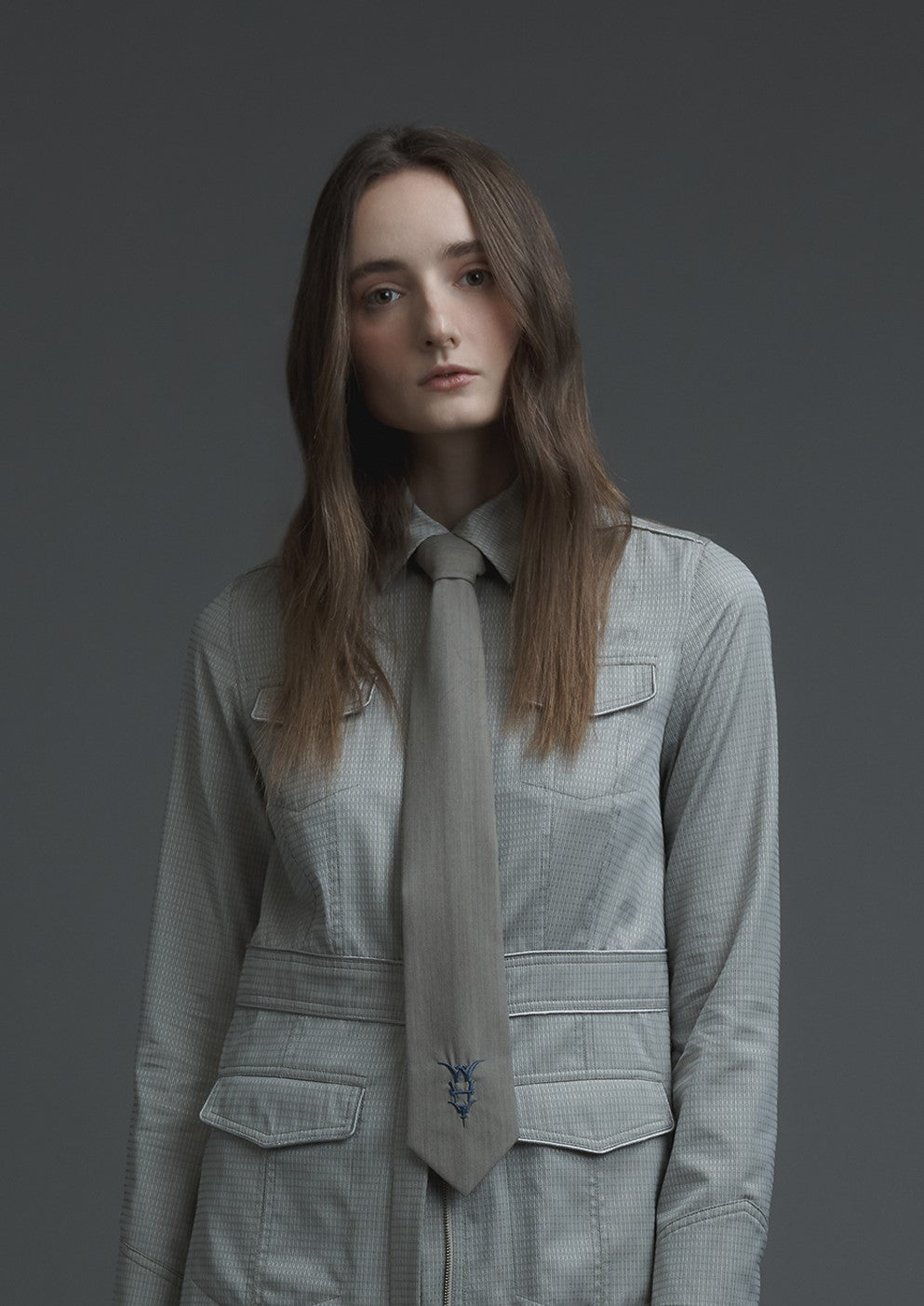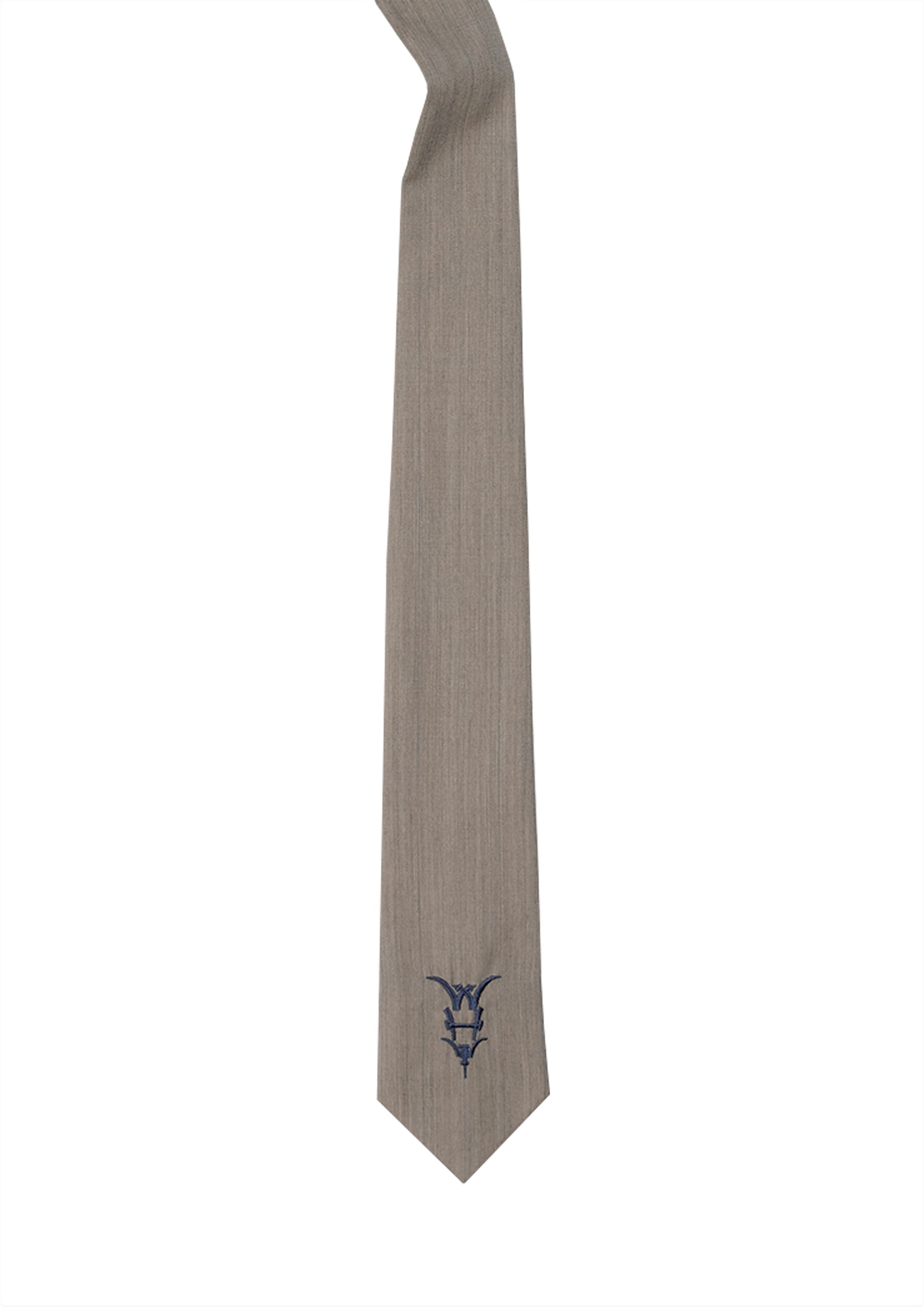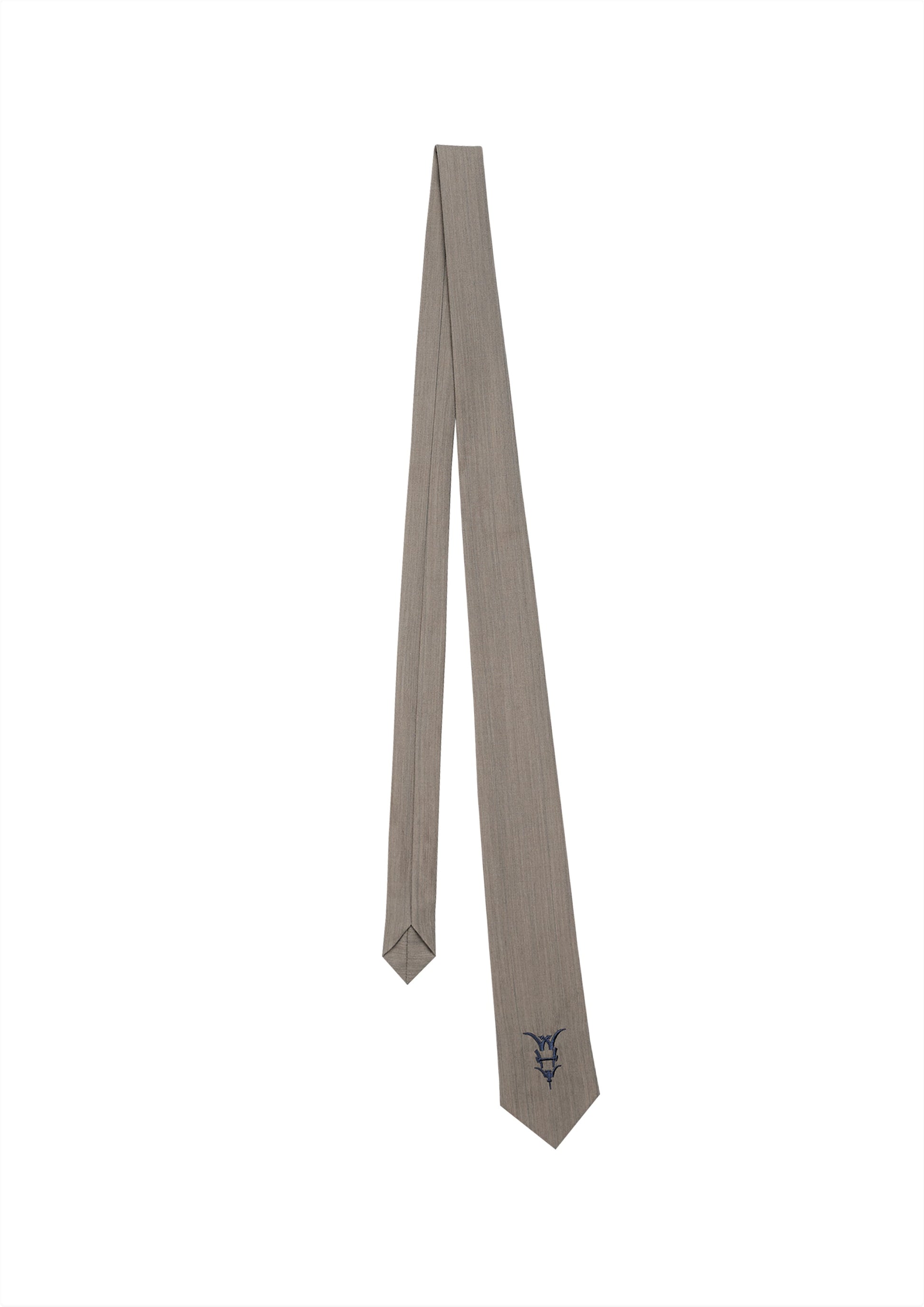 Embroidery logo tie with WHY special made logo for HUMANKIND collection. The embroidered logo adds a touch of elegance and sophistication to this beige striped suiting tie.