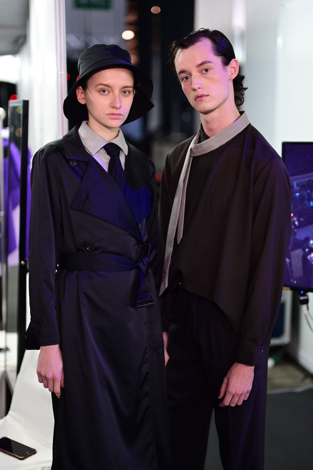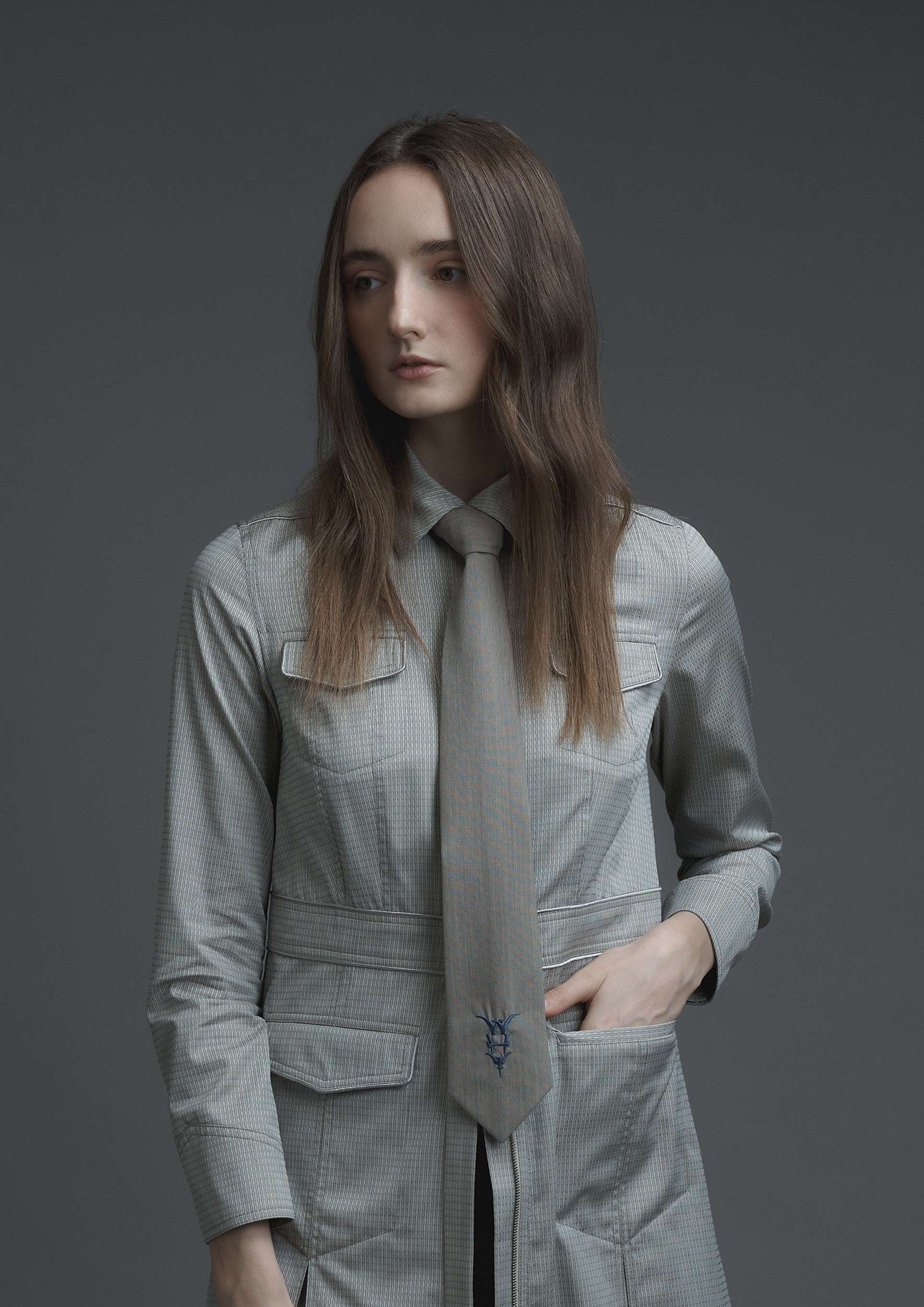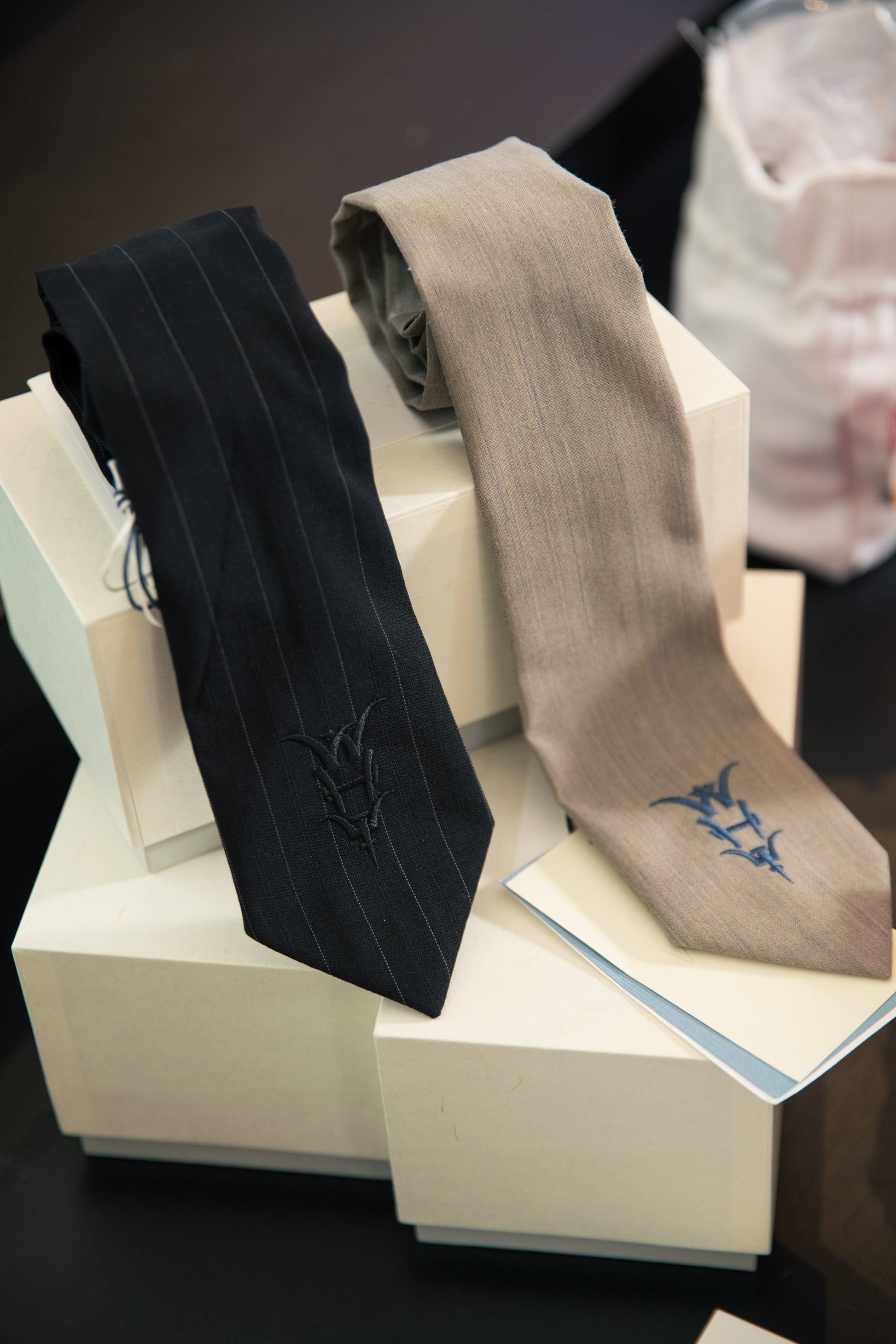 Embroidery logo tie with WHY special made logo for HUMANKIND collection. The embroidered logo adds a touch of elegance and sophistication to this beige striped suiting tie.