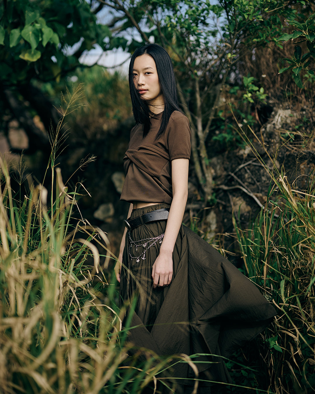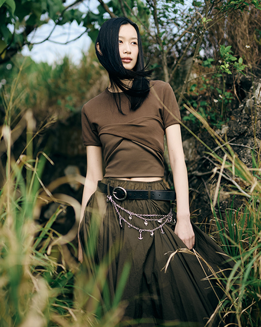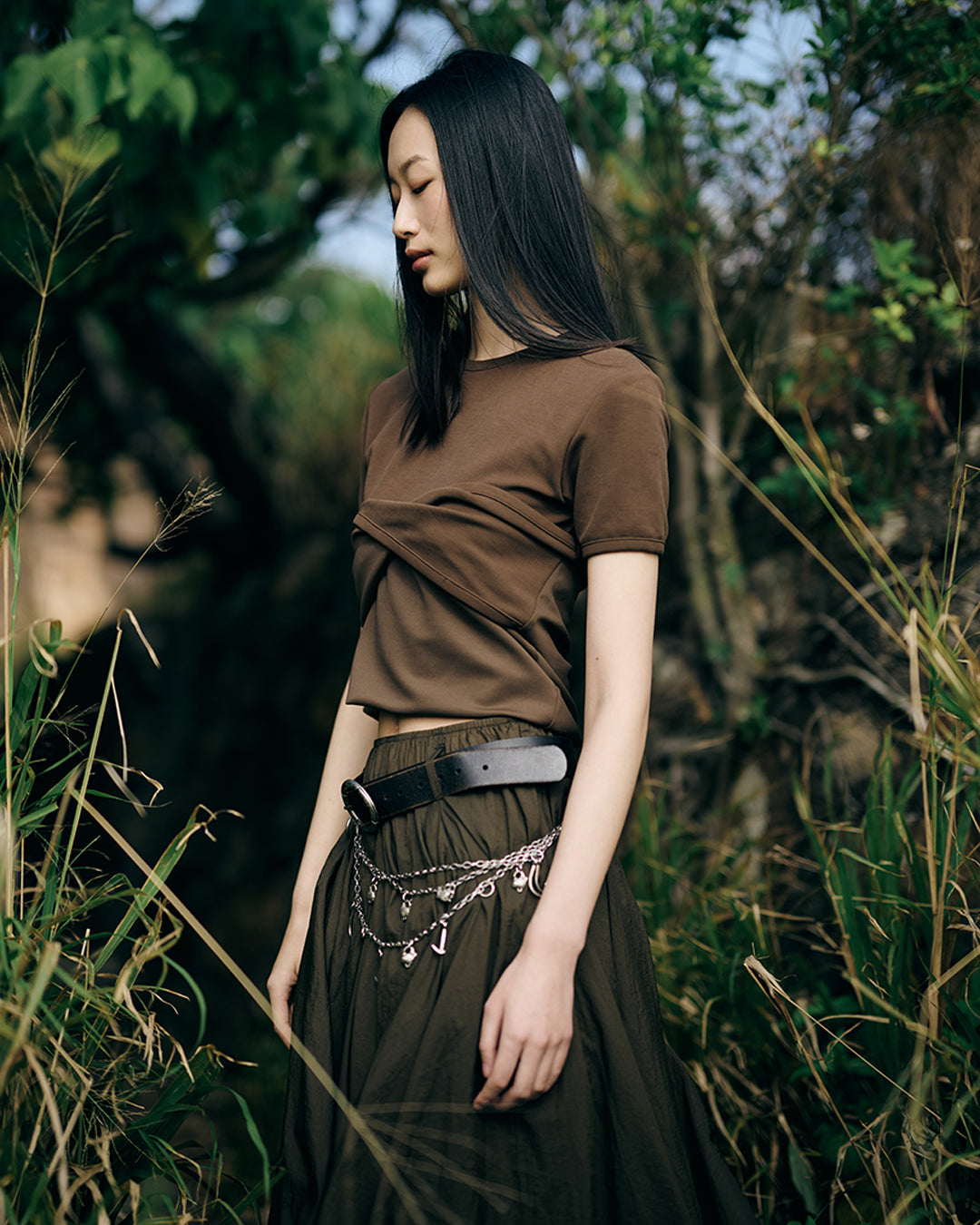 This expertly crafted brown jersey Flip flap tee presents an extended silhouette with a distinctive twisted ribbon-like panel adorning the front bottom hem. The innovative design allows wearers to fold the lower portion upward to chest height, transforming the garment into a sophisticated double-layered configuration for enhanced styling versatility.