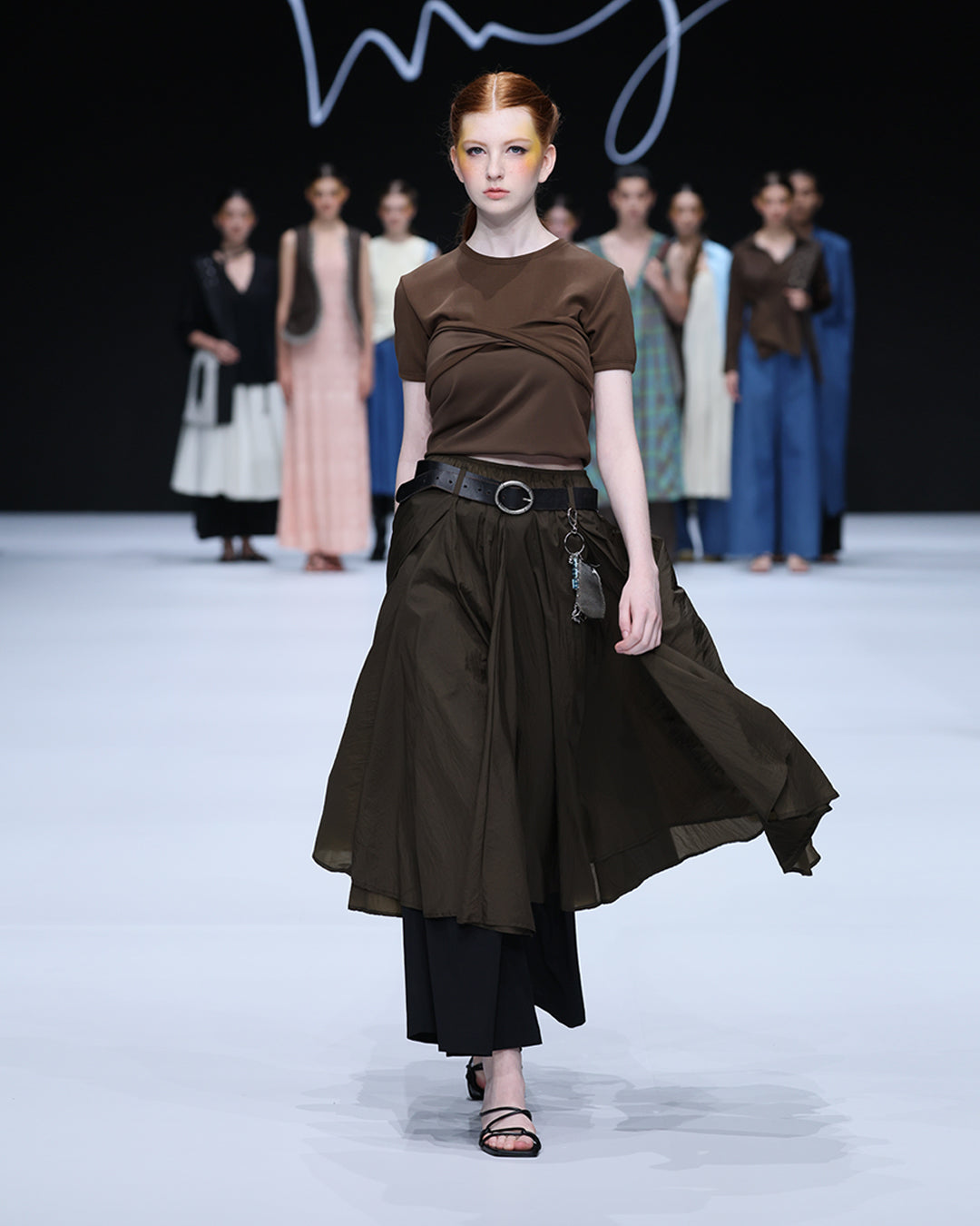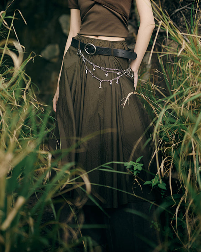 This skirt features a unique 8-panel funnel shape design that creates a voluminous, draped silhouette. It is made with a super lightweight nylon for a comfortable and flowy feel. The elastic waistband and side pocket design add practicality and versatility to this dress.