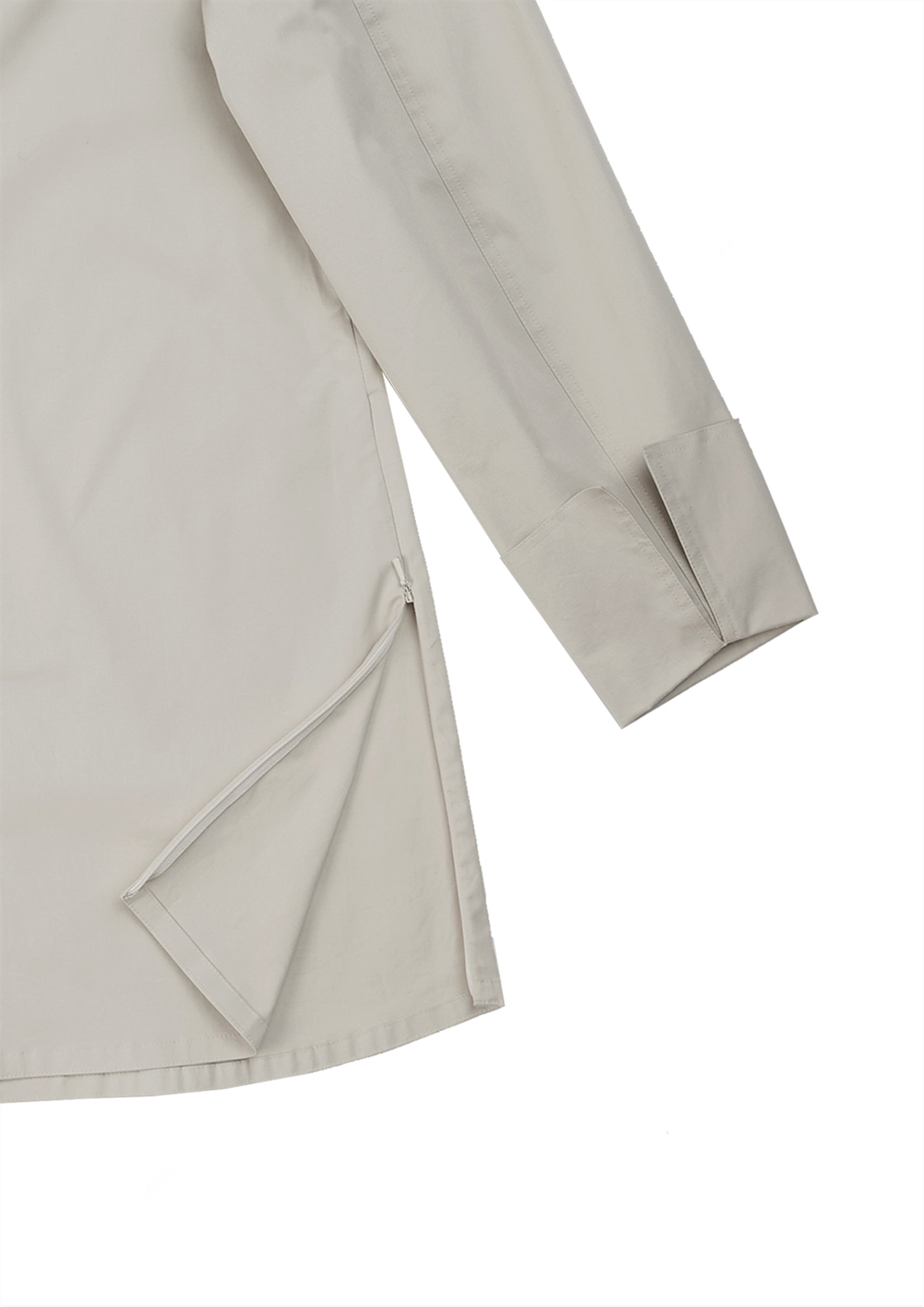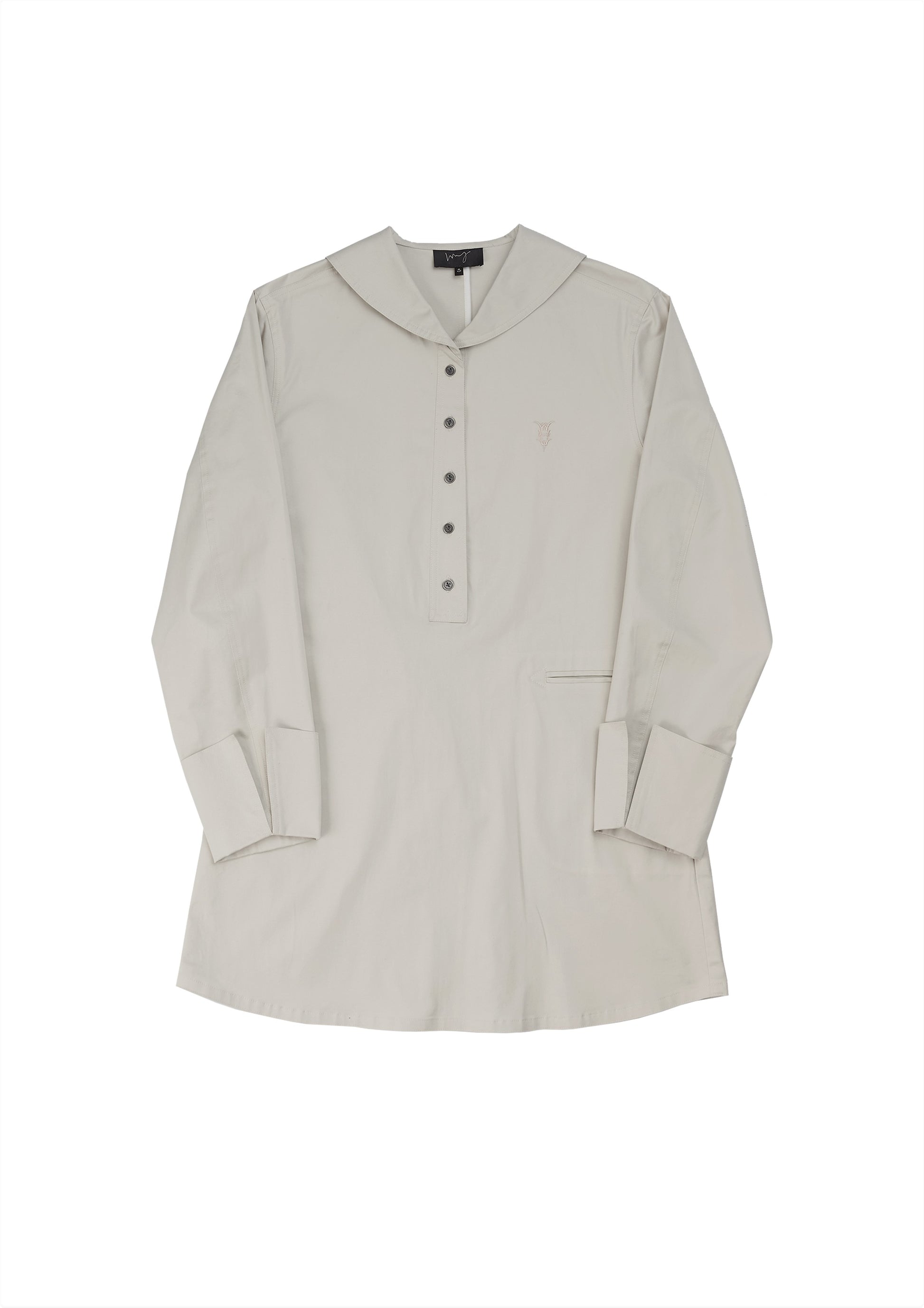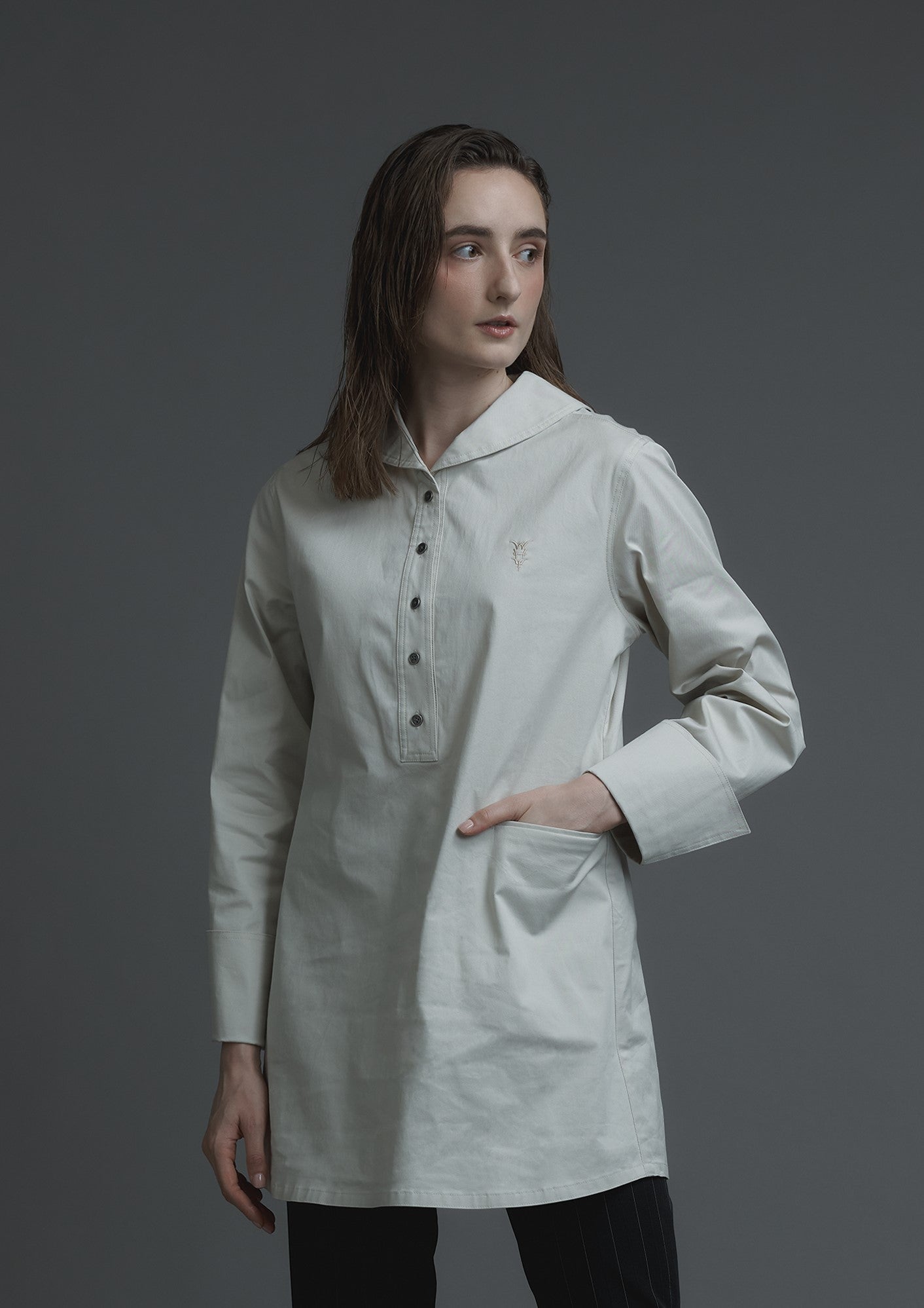 This ivory Japanese cotton long top features long sleeves and a single pocket design. The embroidery logo adds a touch of elegance, while the metal buttons and invisible zipper side opening provide functionality.