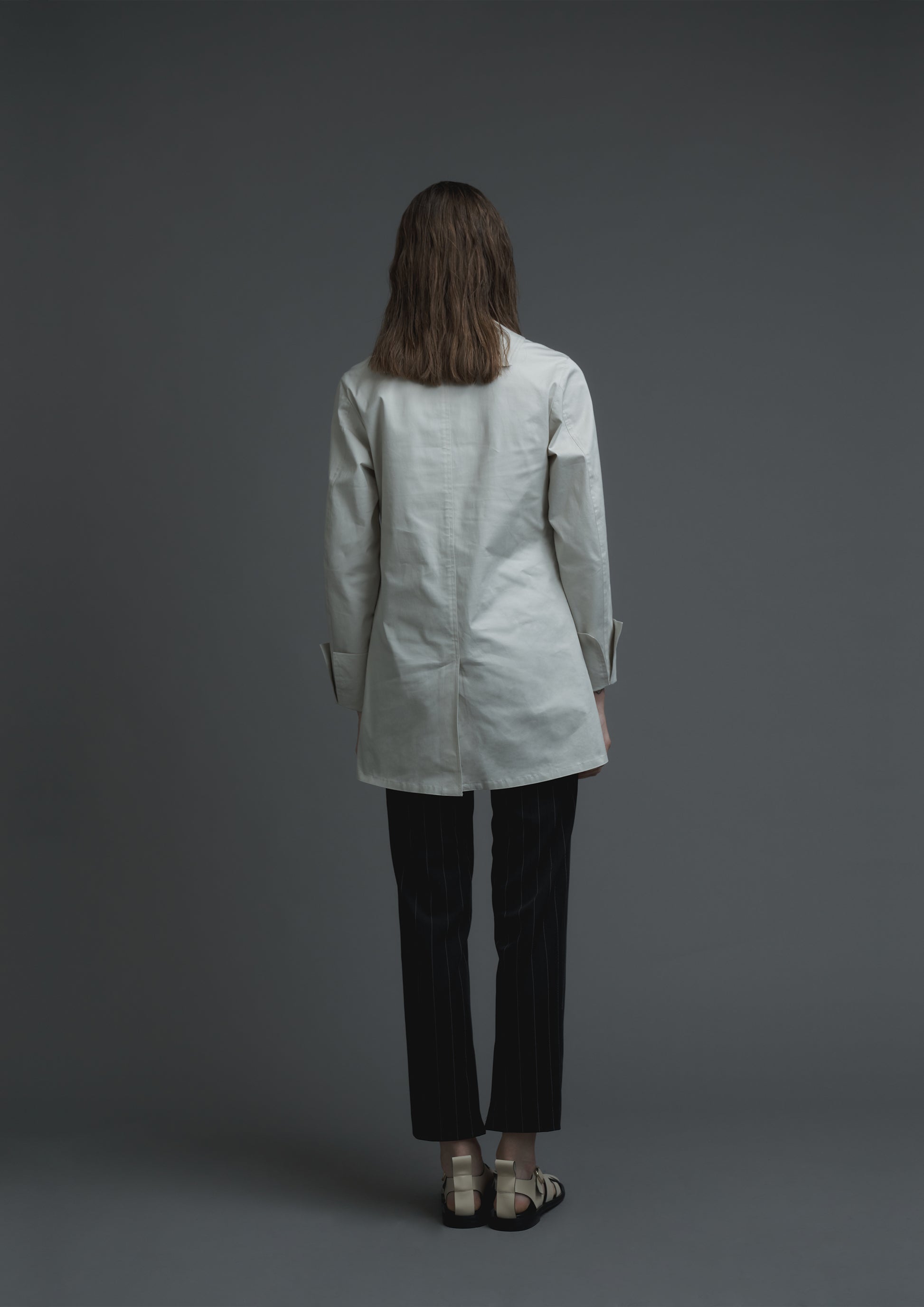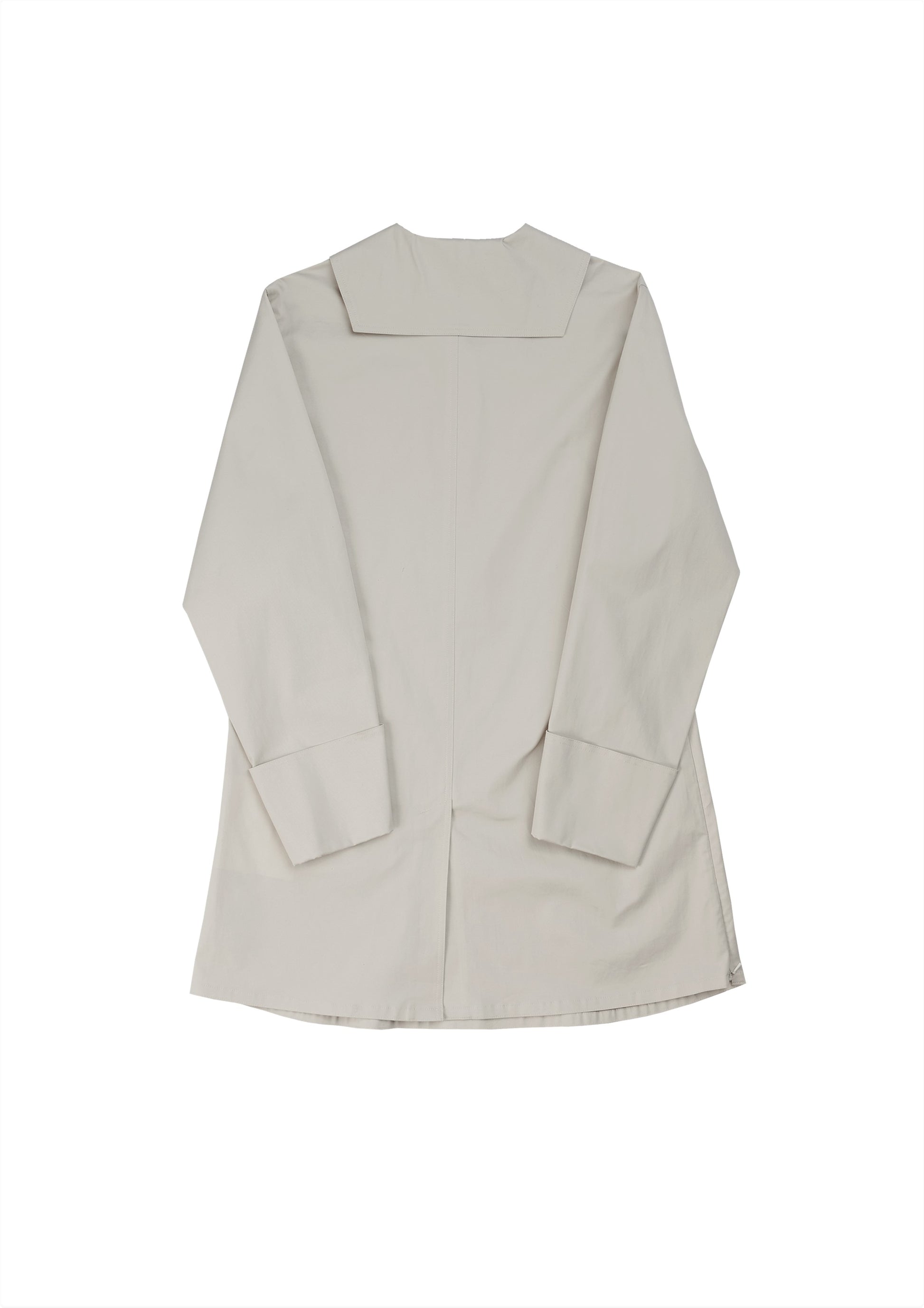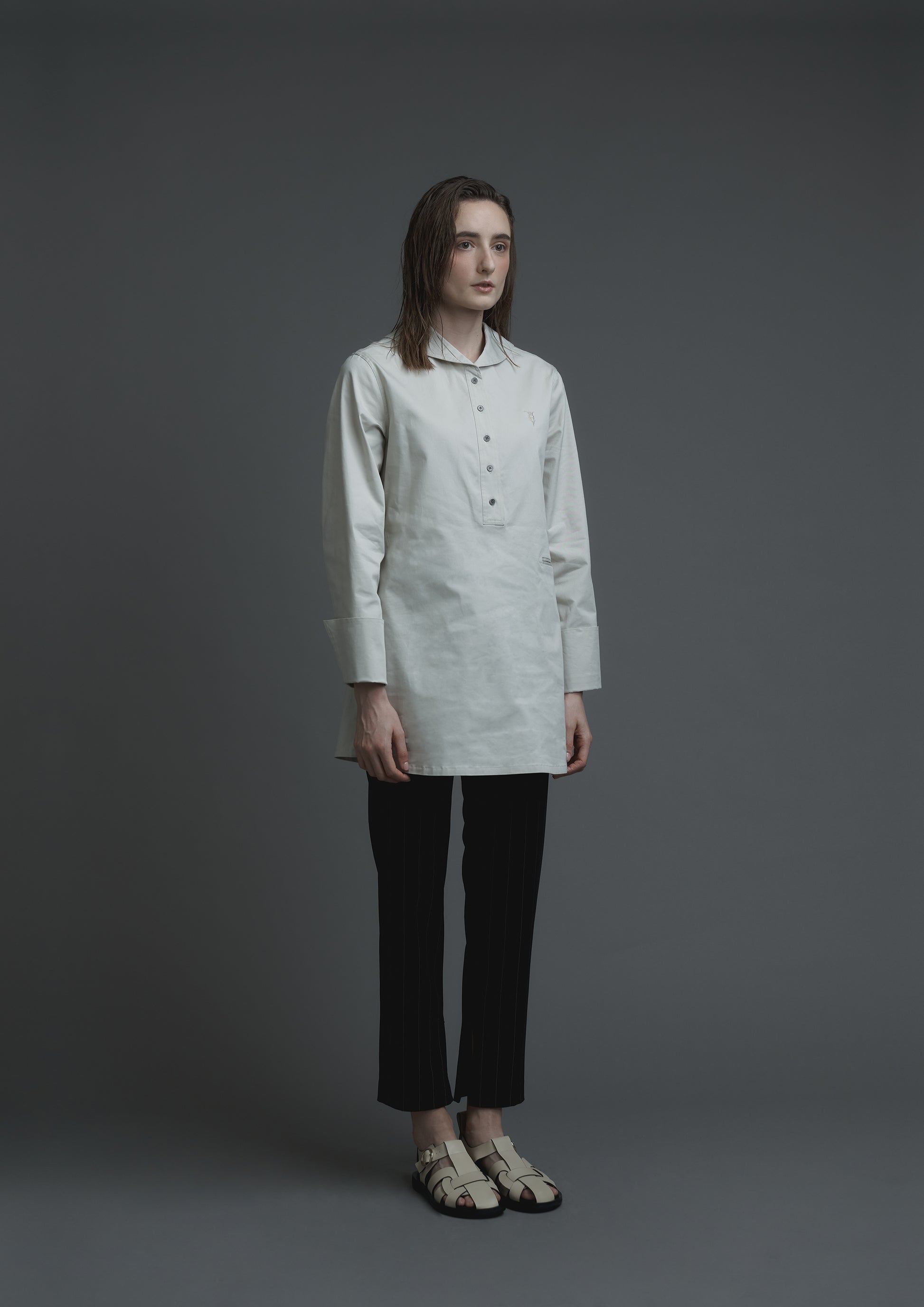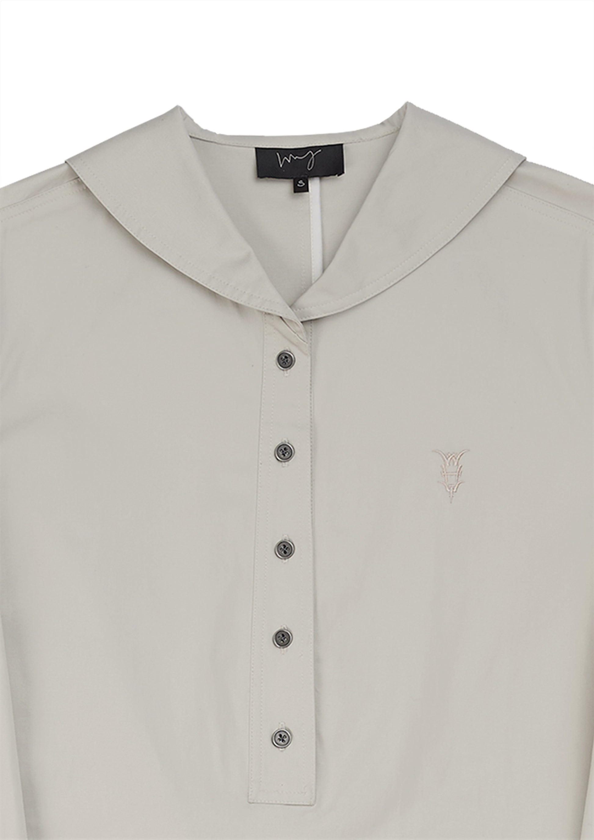 This ivory Japanese cotton long top features long sleeves and a single pocket design. The embroidery logo adds a touch of elegance, while the metal buttons and invisible zipper side opening provide functionality.