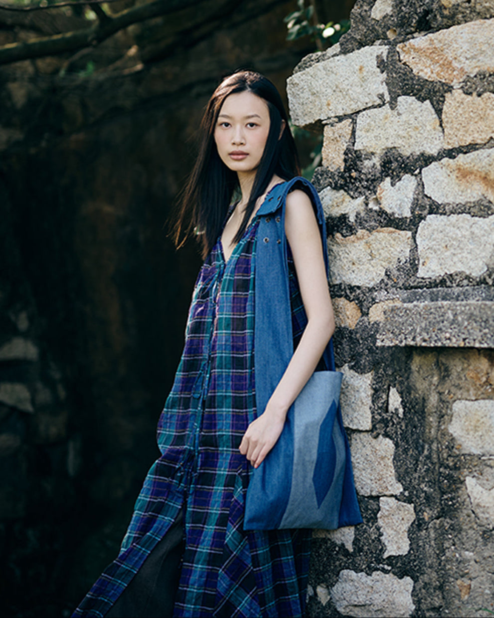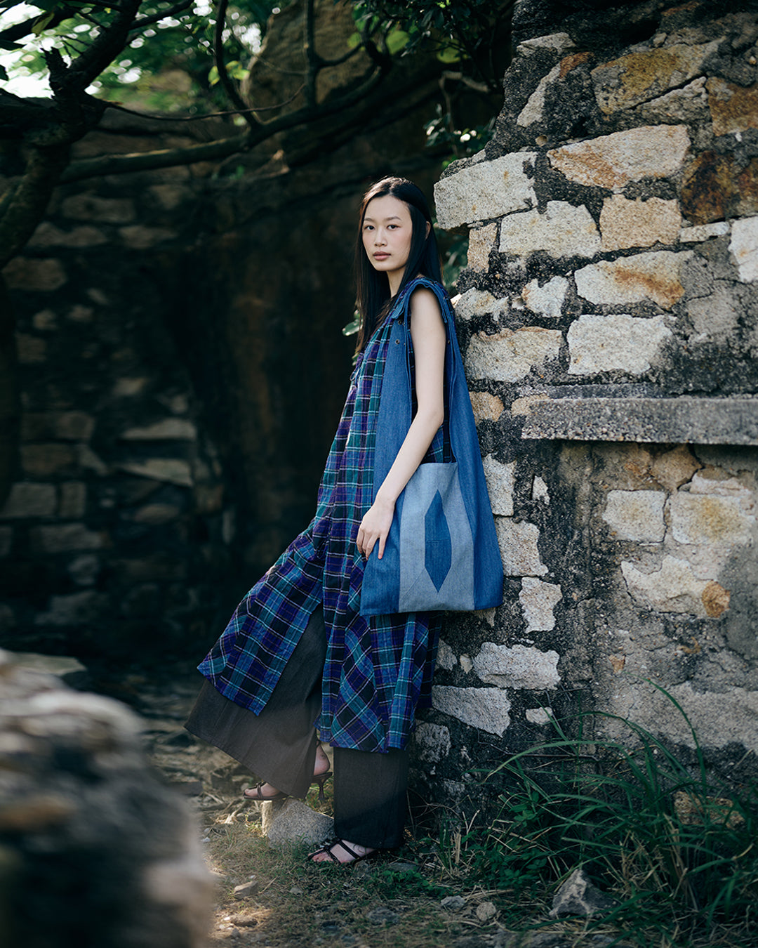 The blue denim crossbody bag is inspired by a traditional Indigenous style, with a unique hexagon panel cut featuring the initials W, H, Y. The addition of snap buttons on the shoulder strap allows for versatile wear as a shoulder bag or crossbody bag, making it a practical and stylish choice.