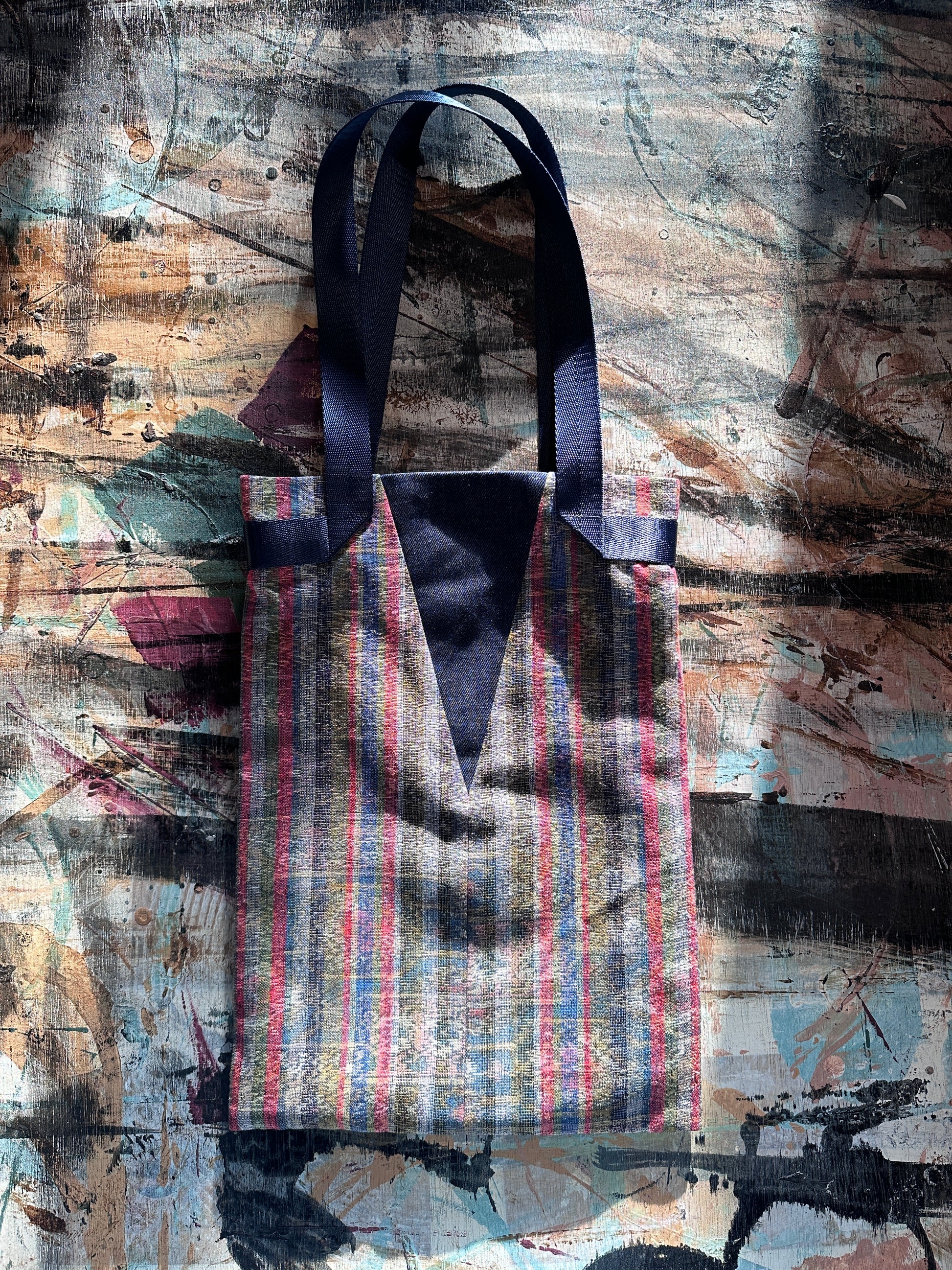 This unique Y-shaped patch on the front panel of our A4-sized tote is the ideal solution for storing your documents or iPad. The vintage kimono fabric from UZfabric, paired with denim, creates a one-of-a-kind piece. Made with care in Hong Kong.