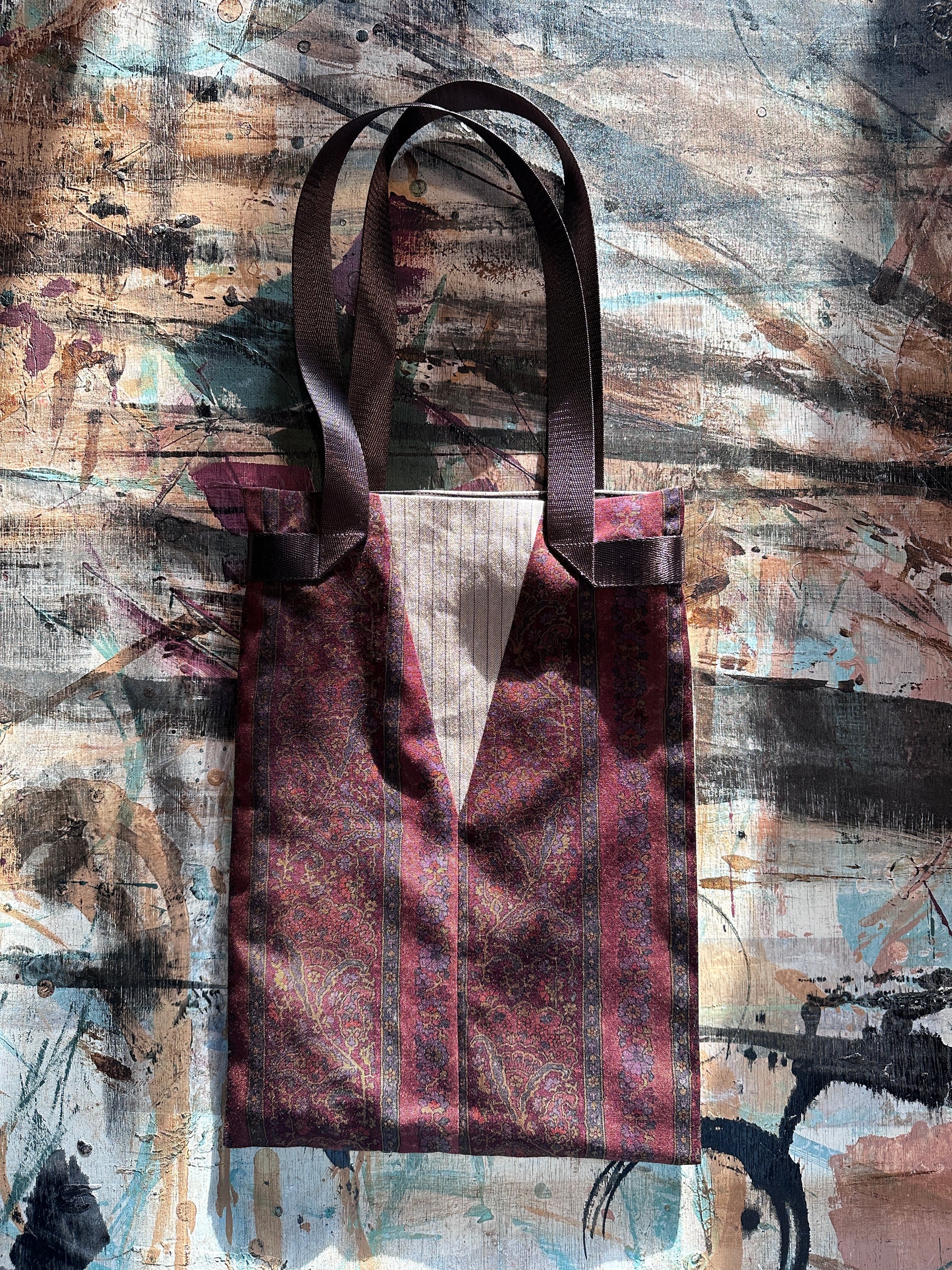 This unique Y-shaped patch on the front panel of our A4-sized tote is the ideal solution for storing your documents or iPad. The vintage kimono fabric from UZfabric, paired with denim, creates a one-of-a-kind piece. Made with care in Hong Kong.