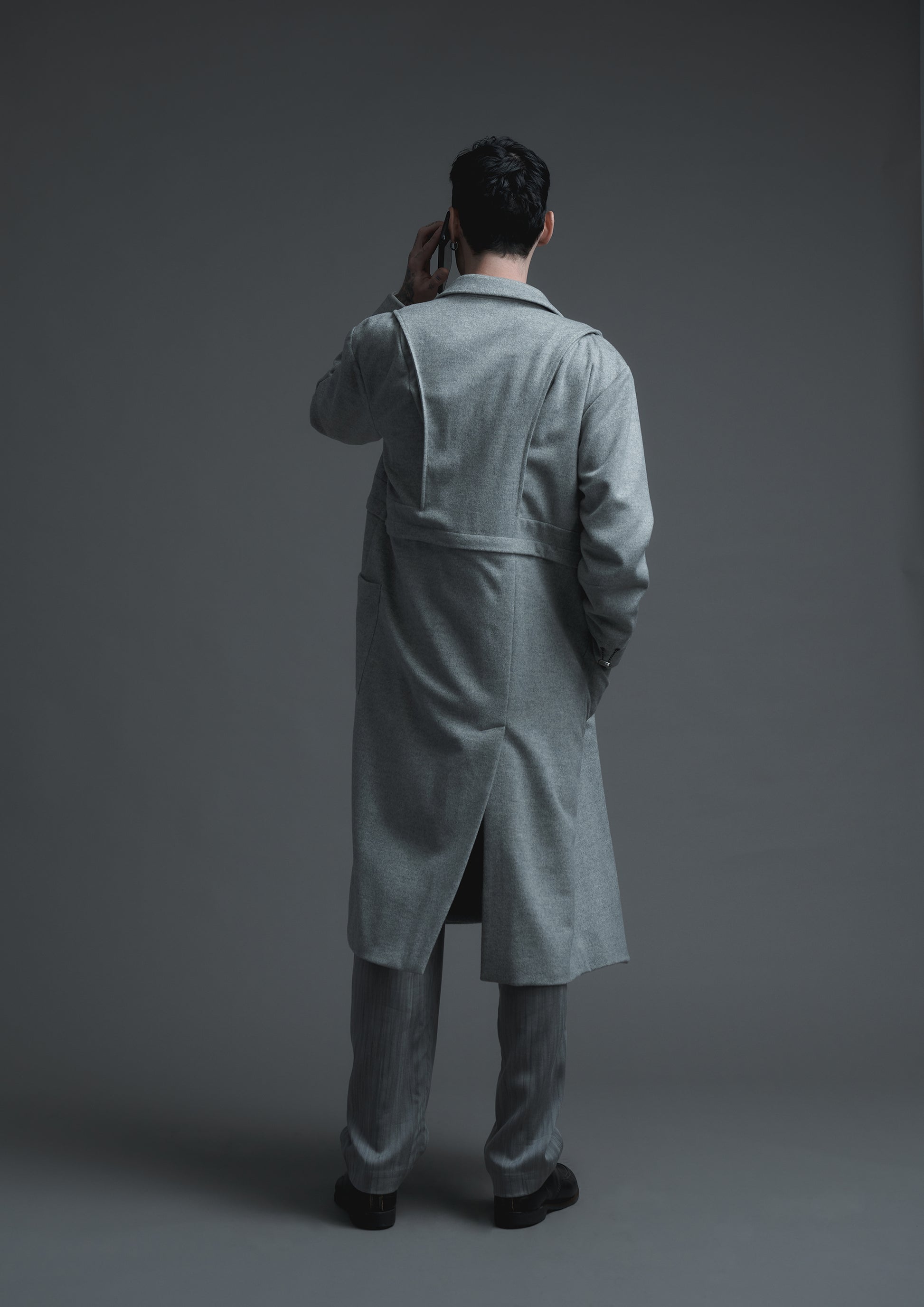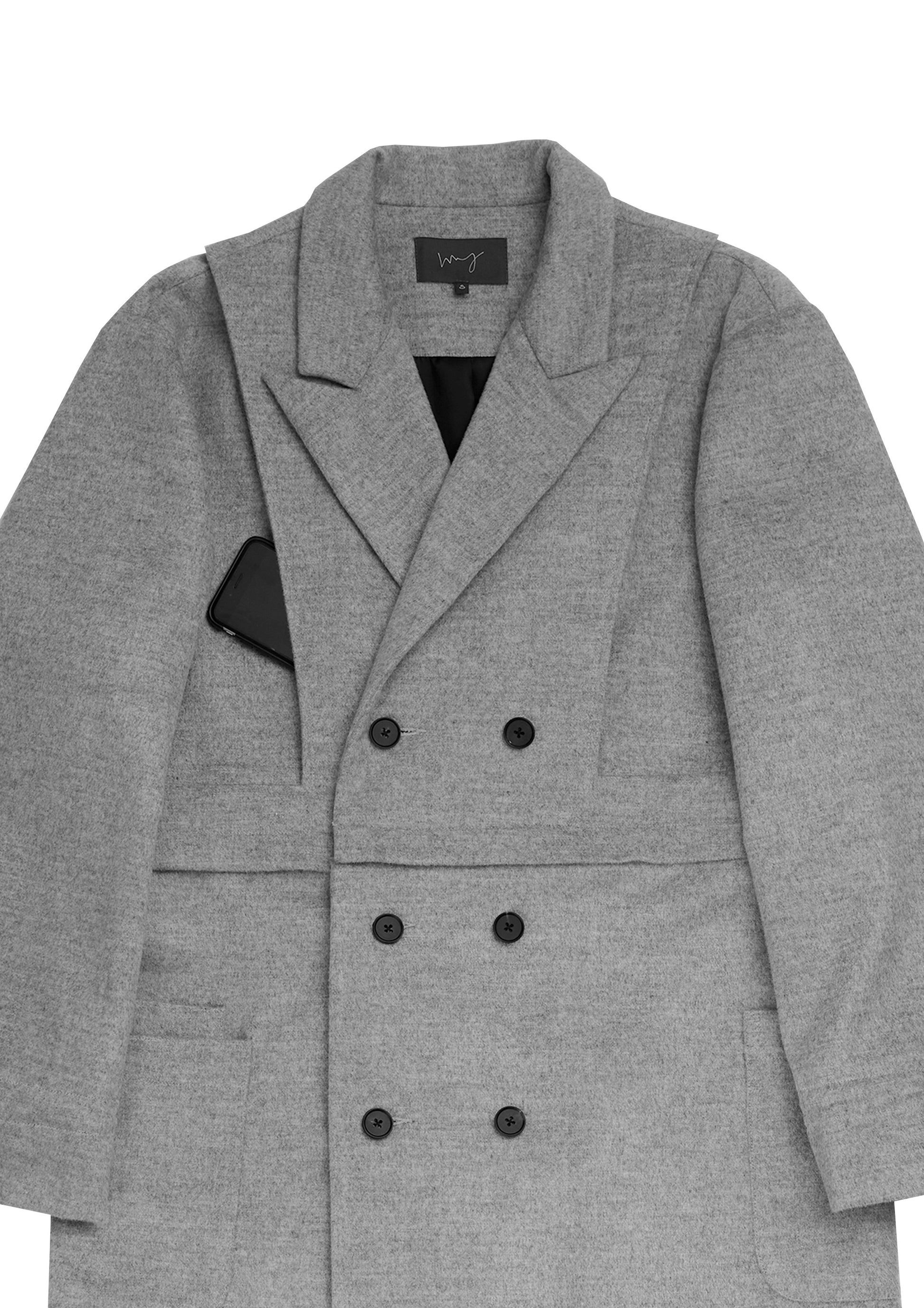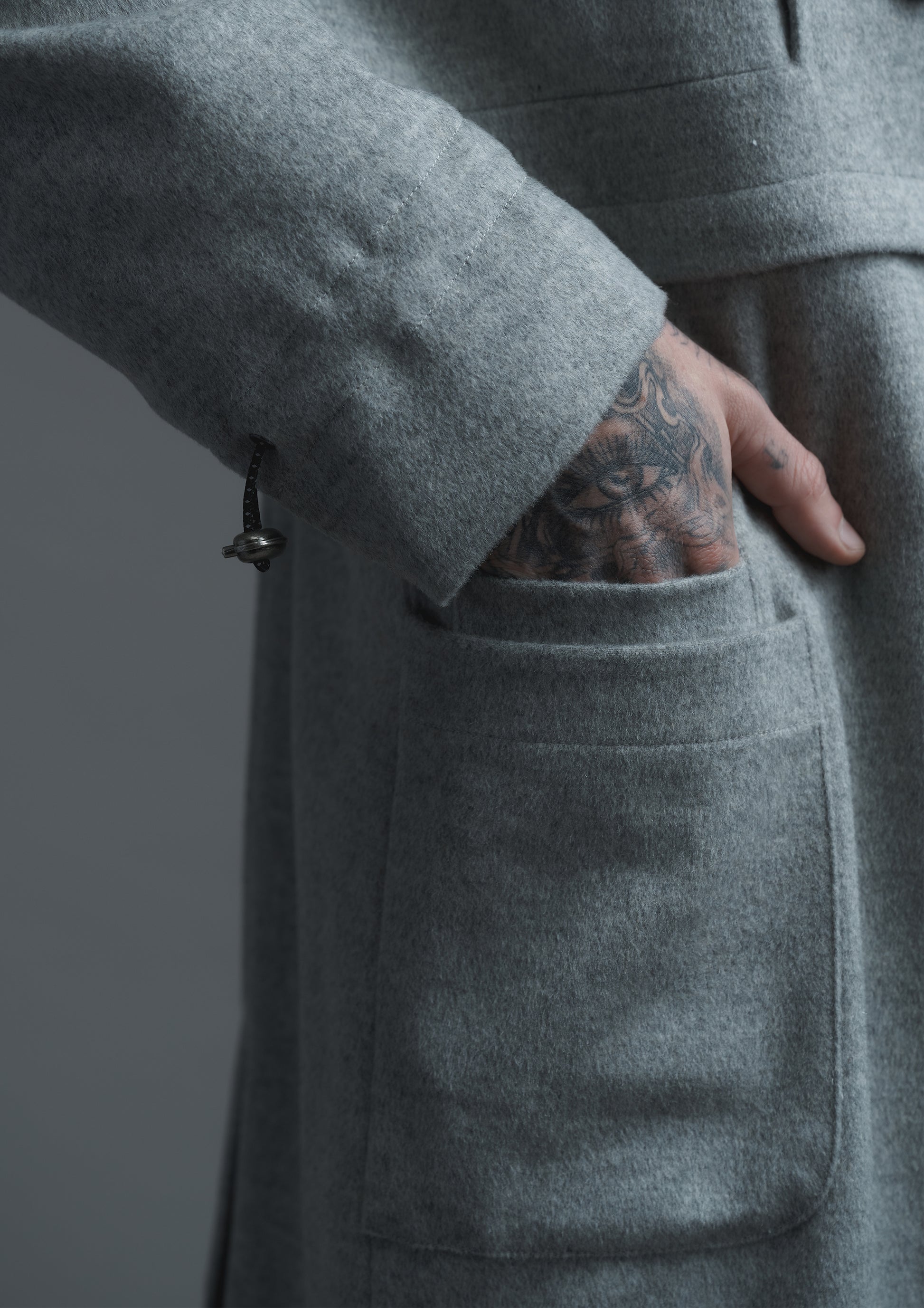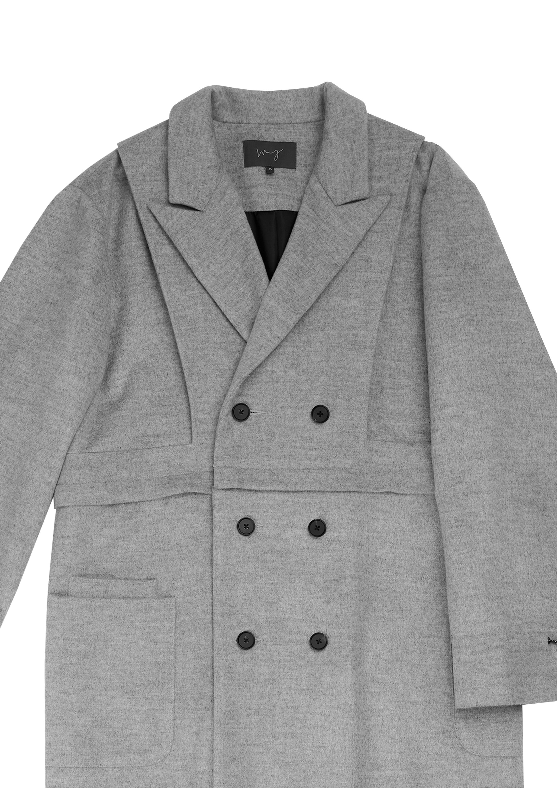 This grey woolen apron cut 2-way lab coat is inspired by vintage nurse aprons. It features a detachable zipper for versatility in styling, as well as a string adjuster on the sleeve cuff and buffalo buttons used throughout. The multi-pocket design adds practicality to this professional and informative garment.