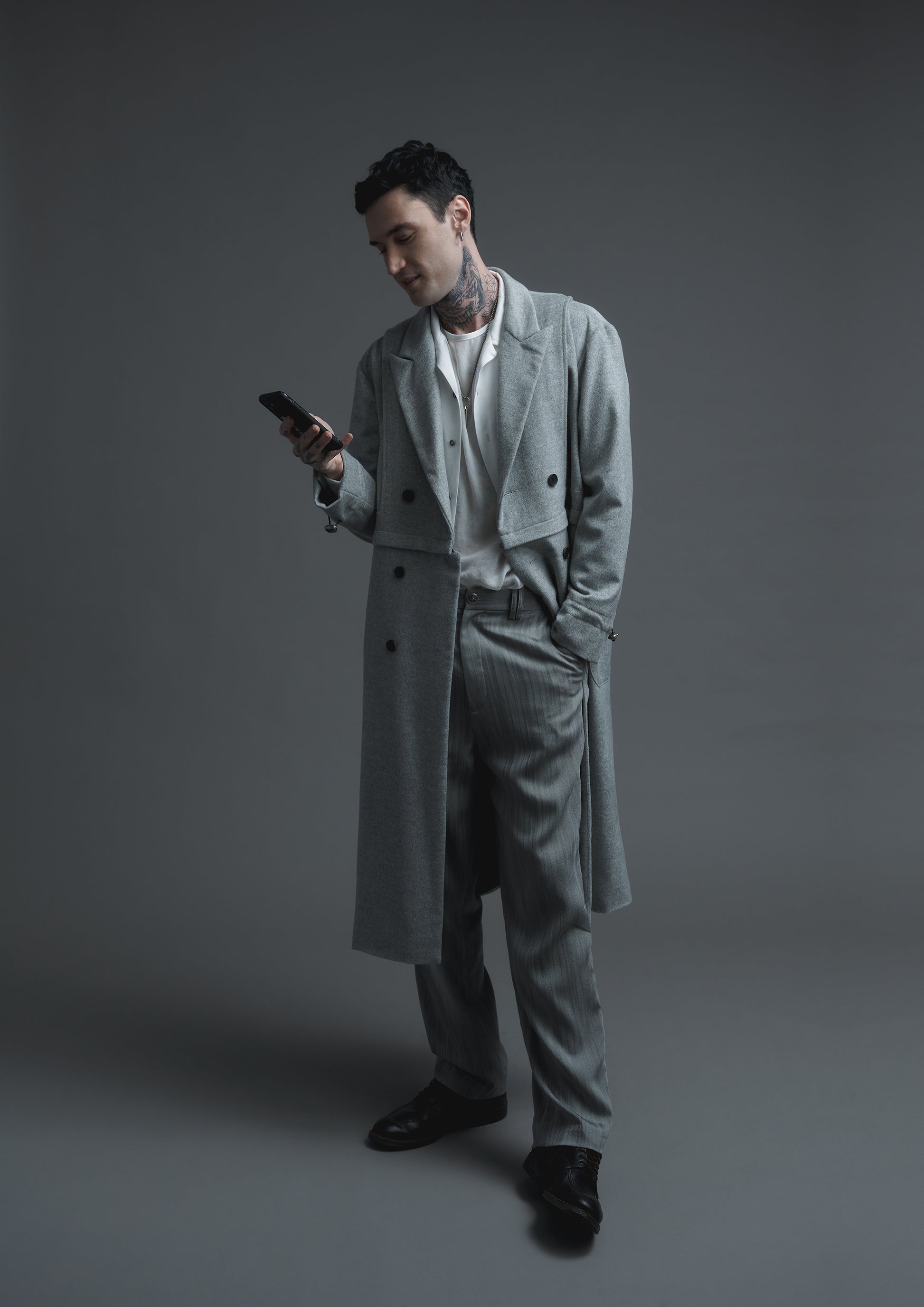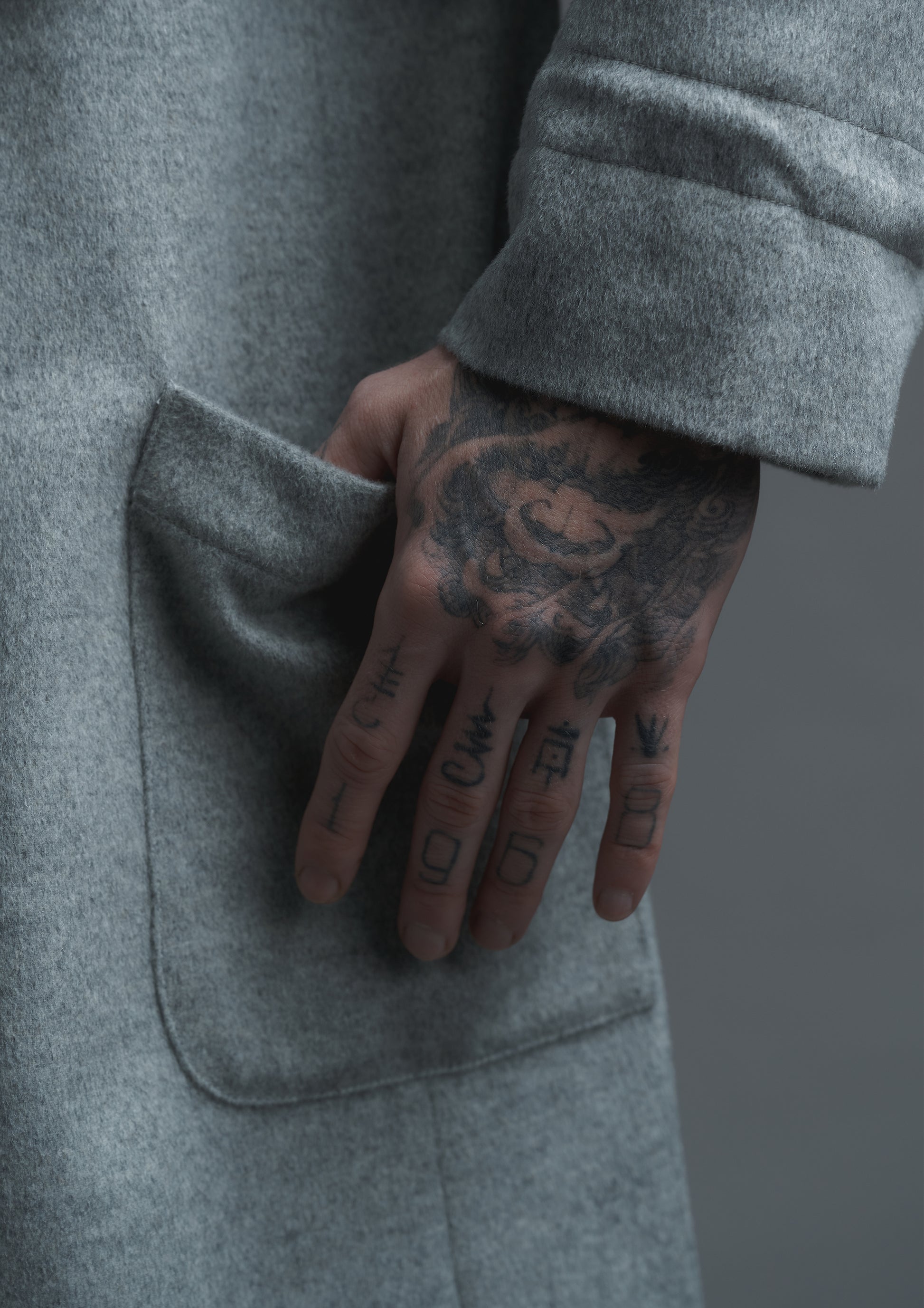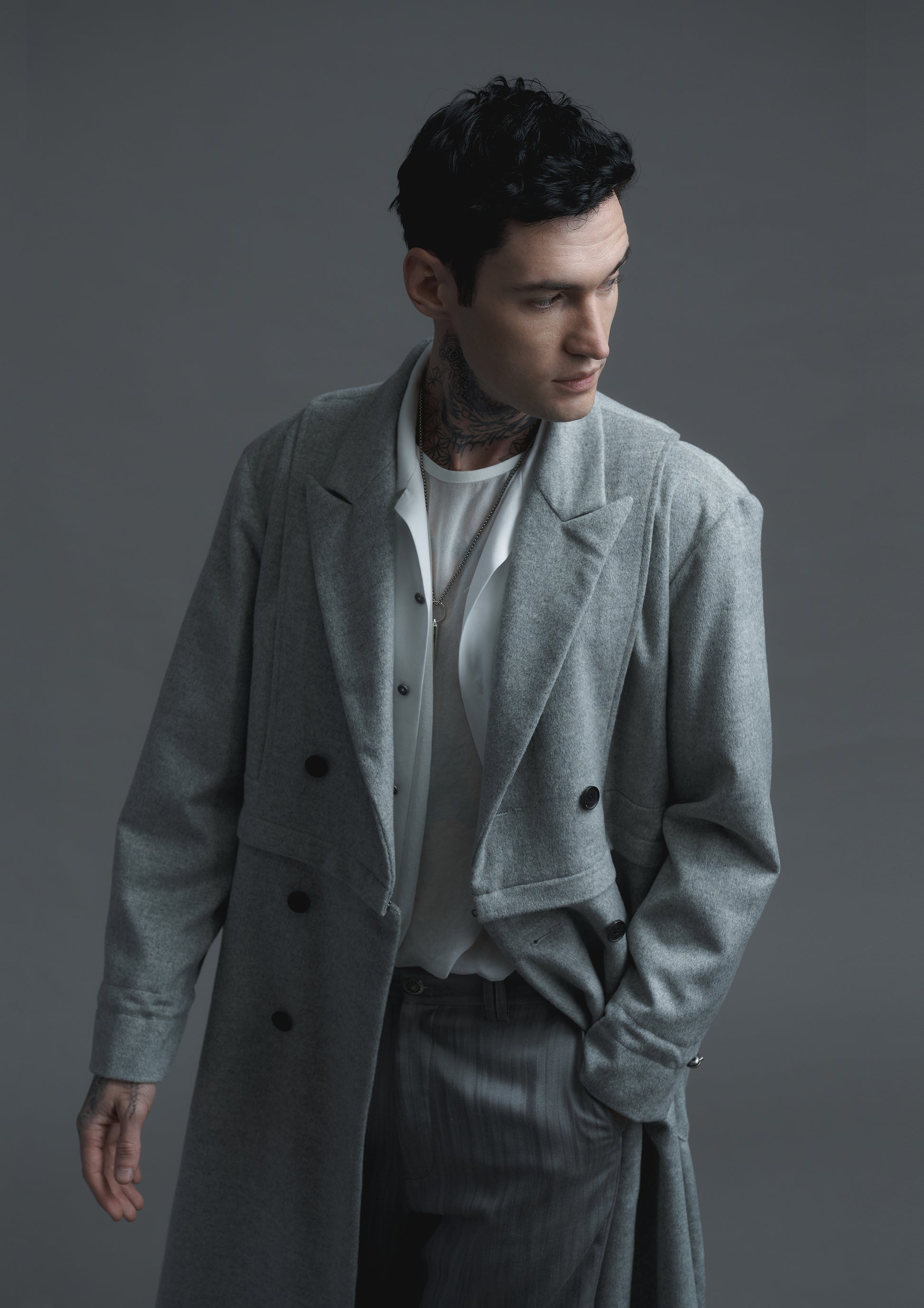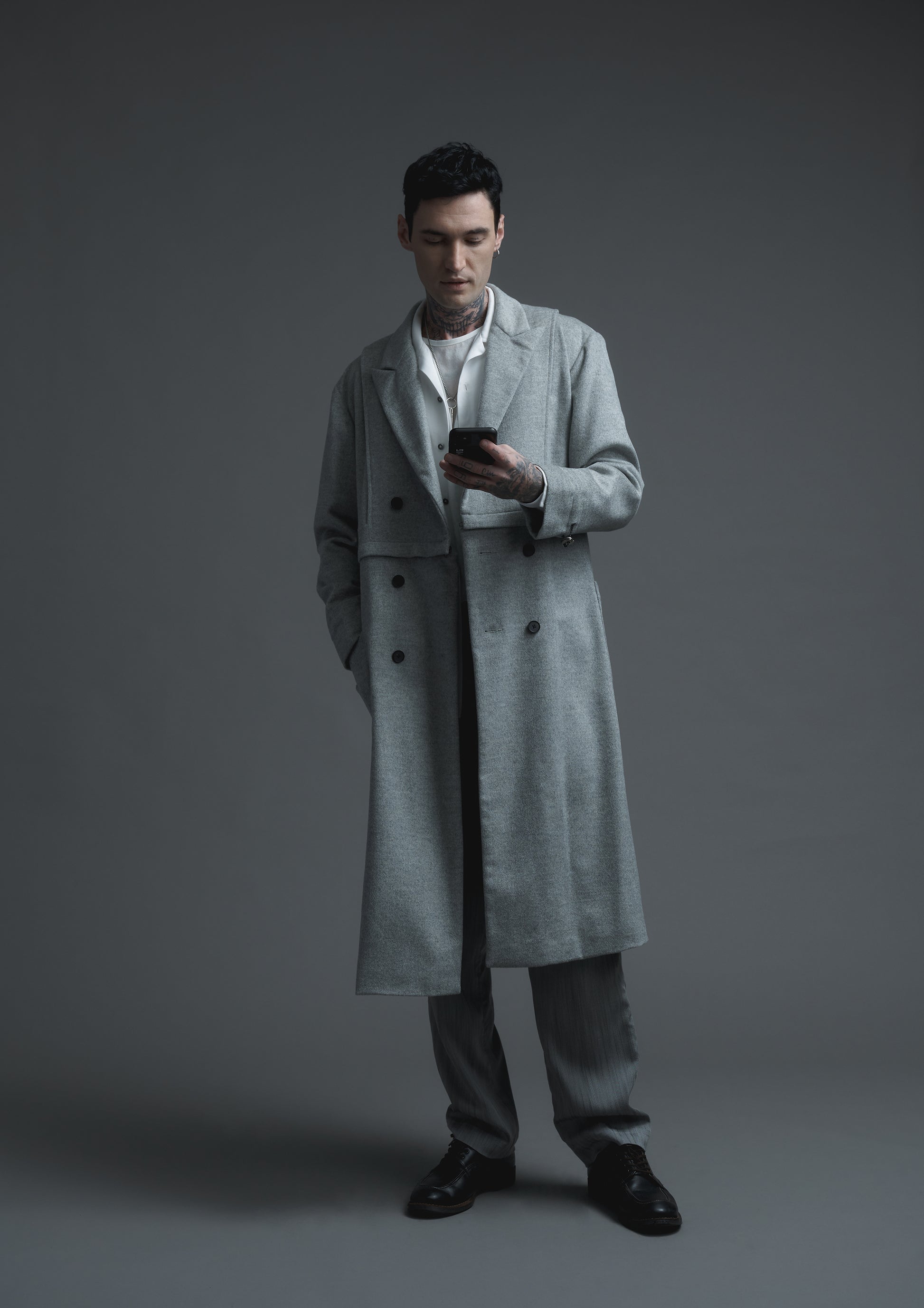 This grey woolen apron cut 2-way lab coat is inspired by vintage nurse aprons. It features a detachable zipper for versatility in styling, as well as a string adjuster on the sleeve cuff and buffalo buttons used throughout. The multi-pocket design adds practicality to this professional and informative garment.