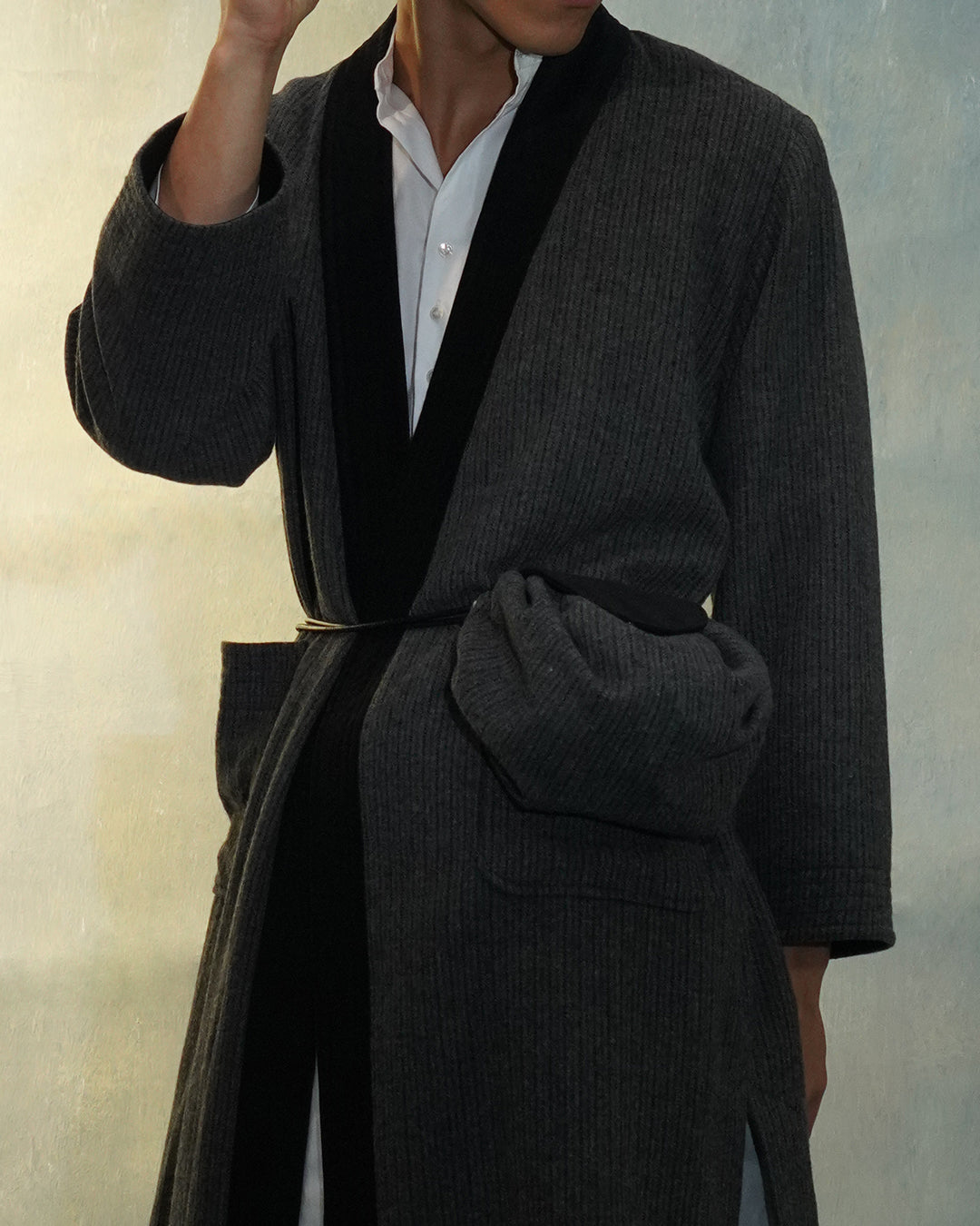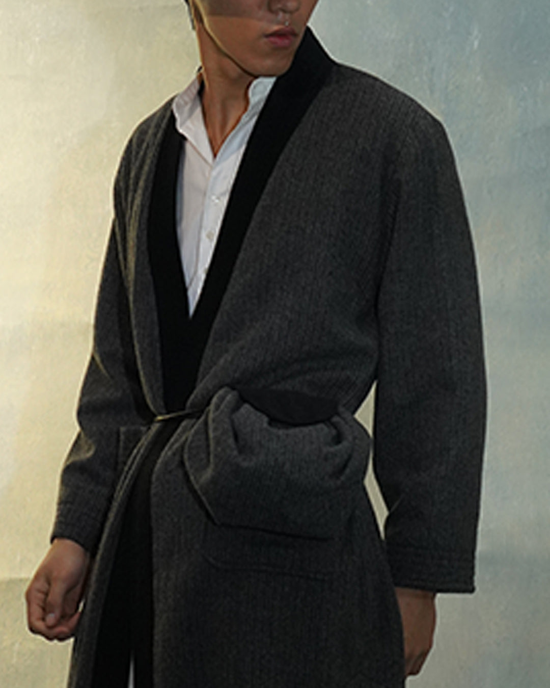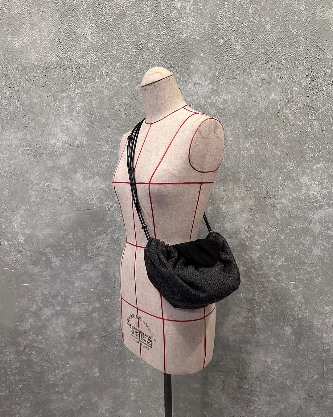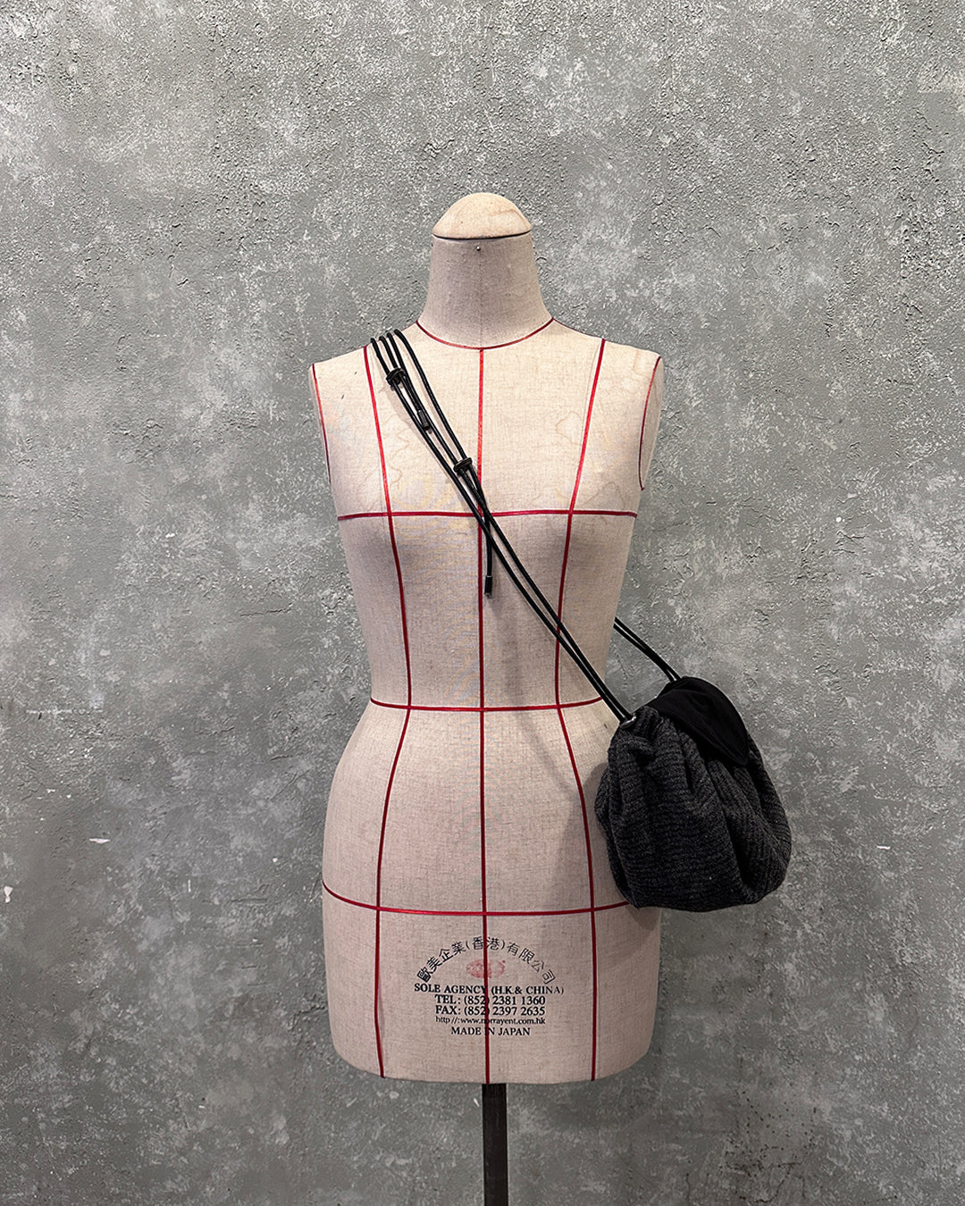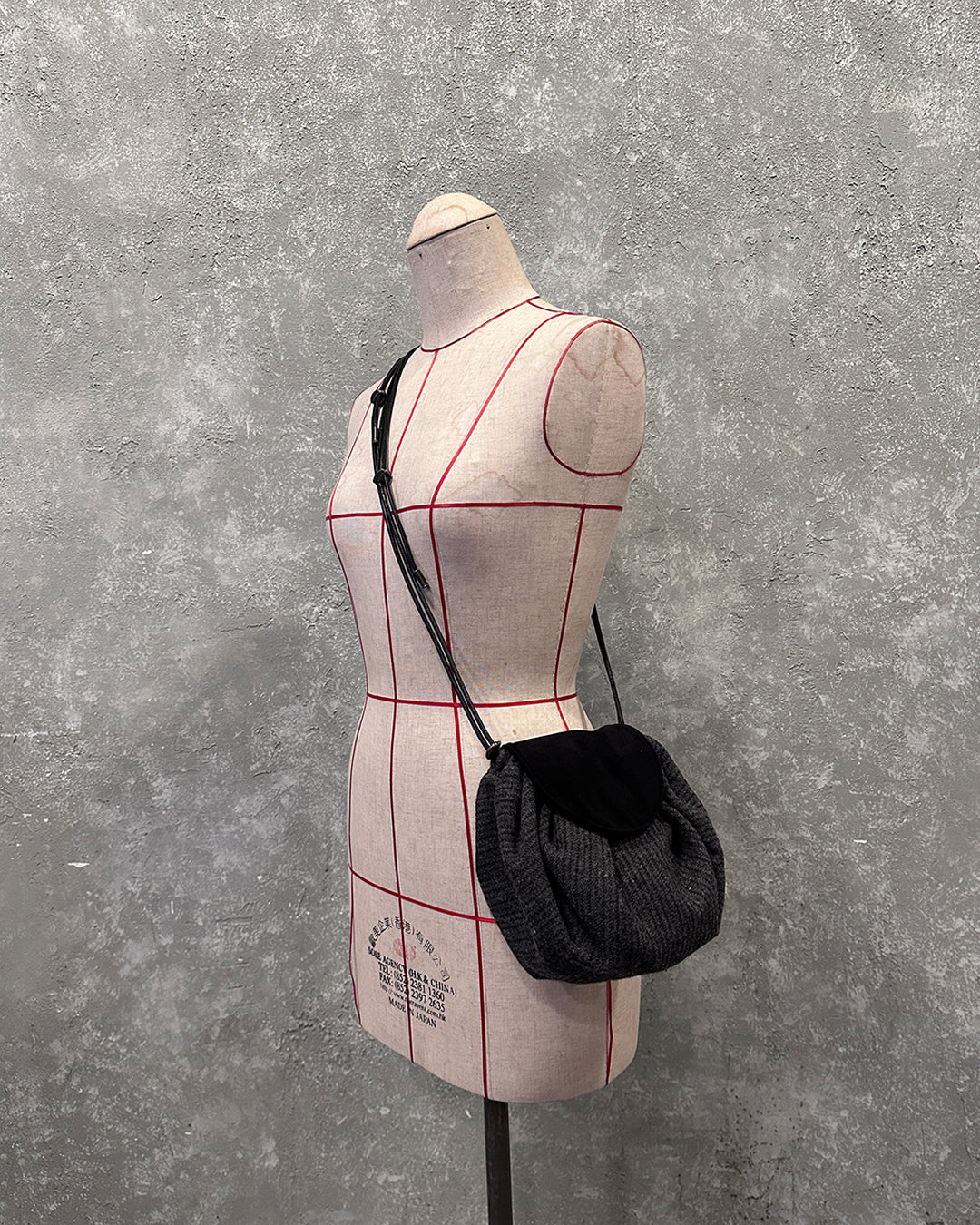 This Child bag in grey stripes takes inspiration from the Chinese traditional perfume bag "xiāngnáng". It allows for easy size and volume adjustments with a metal stopper. The leather flap is secured with a magnet button, while two small pockets can be found inside. Expertly made in Hong Kong.