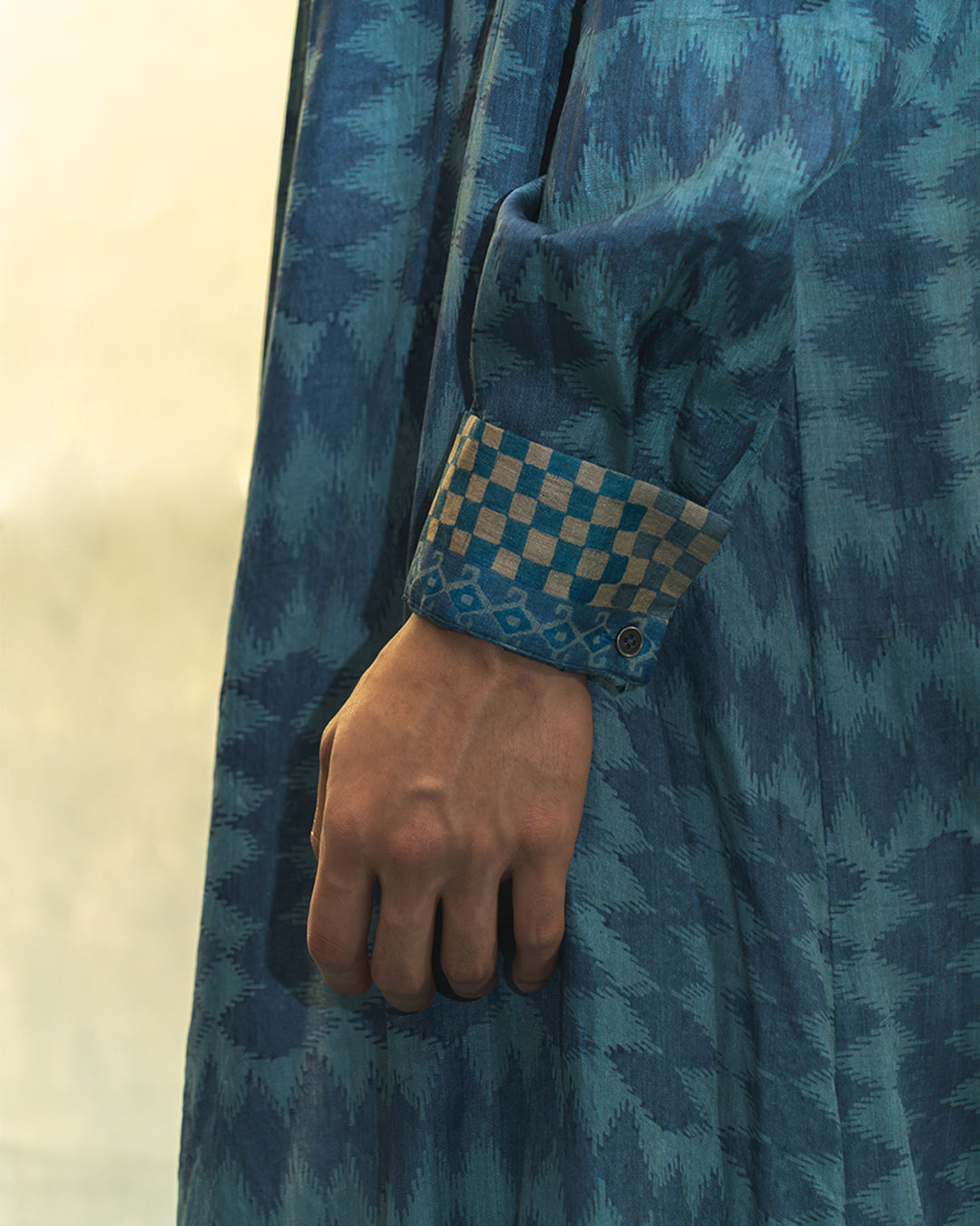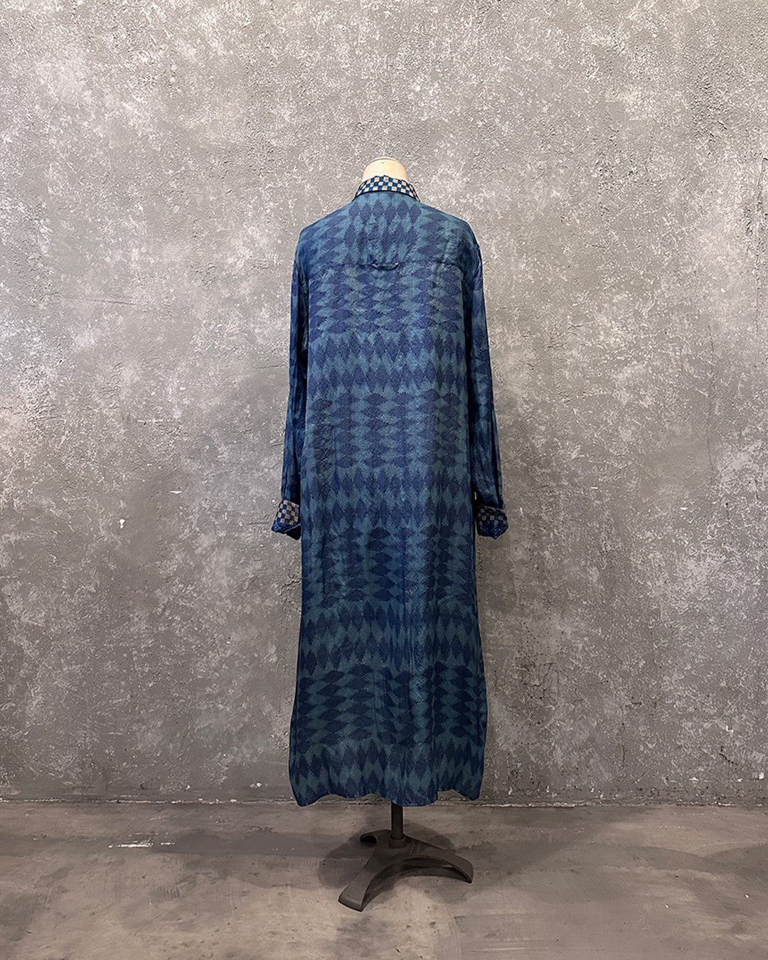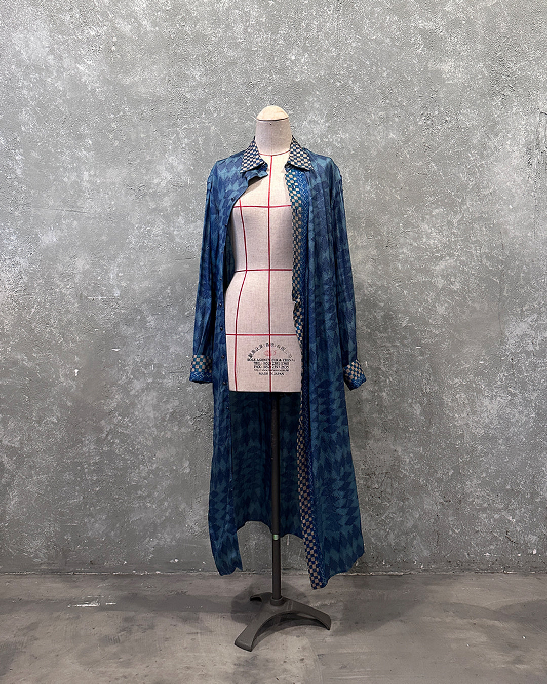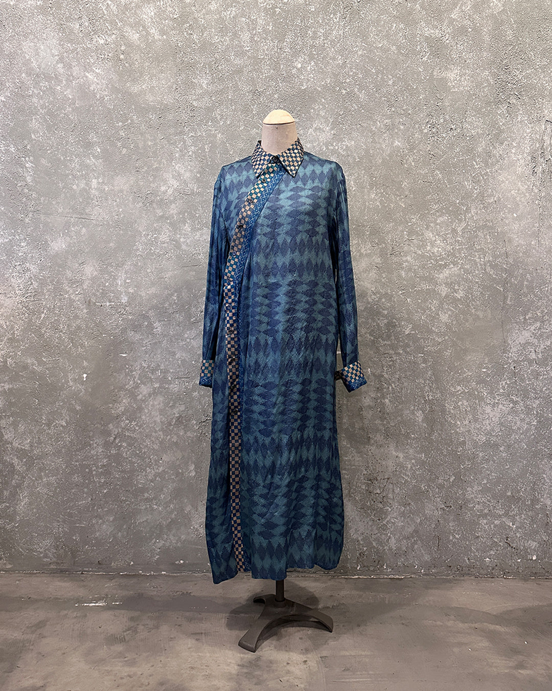This mandarin long shirt is crafted from a vintage India saree, offering a unique, lightweight silk piece with timeless Chinese-inspired design. The relaxed silhouette and intricate prints make it a statement of culture and craftsmanship.