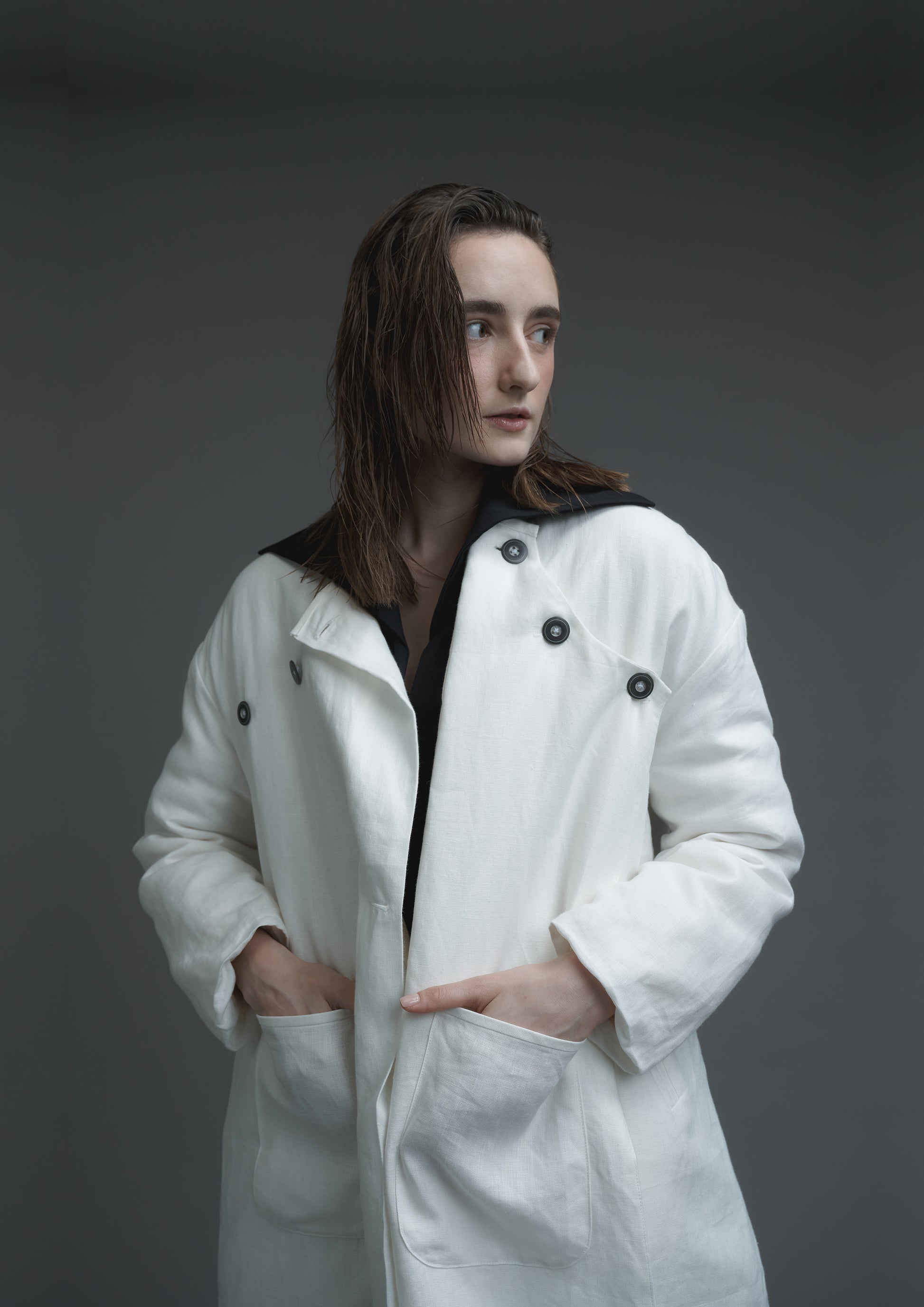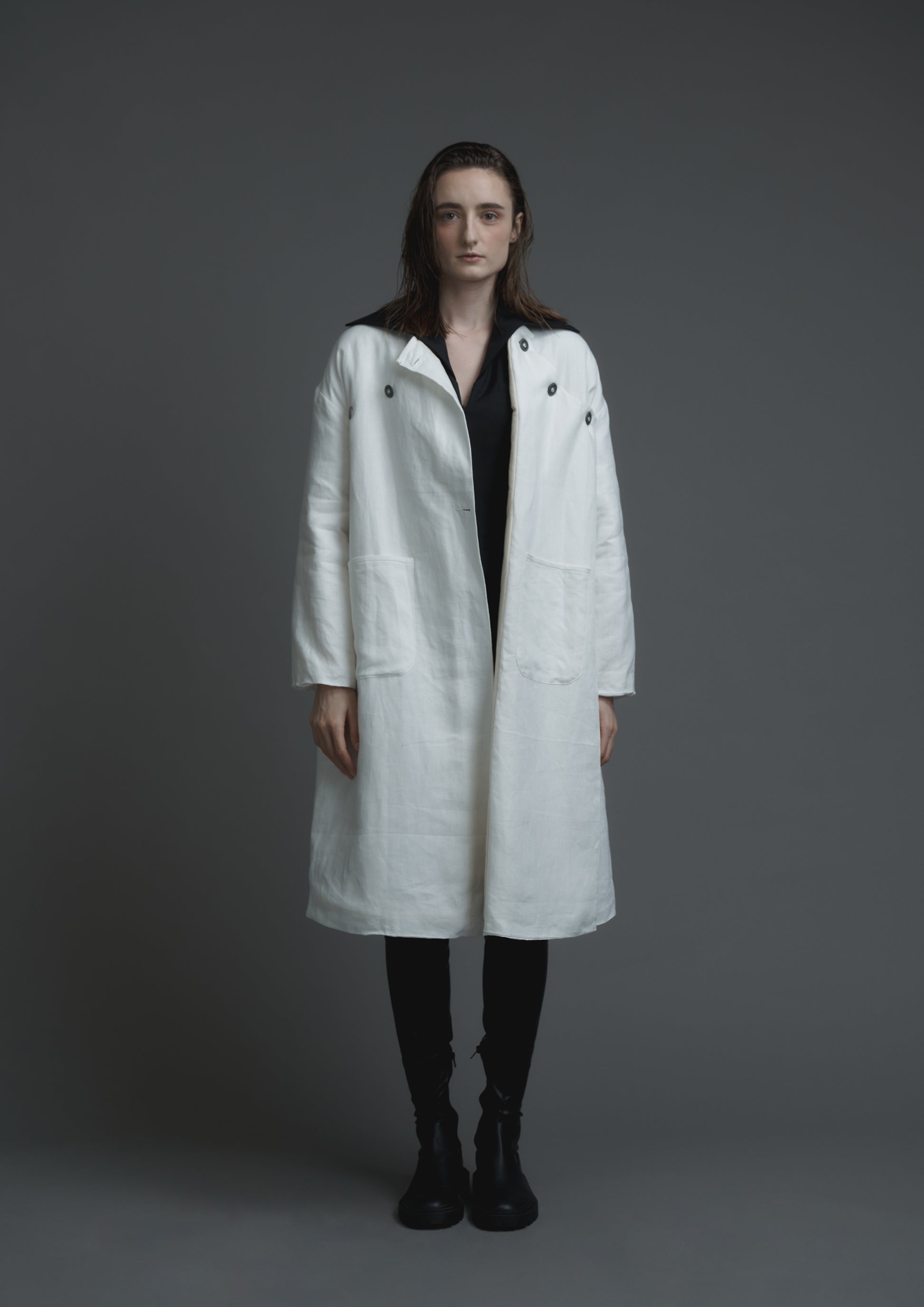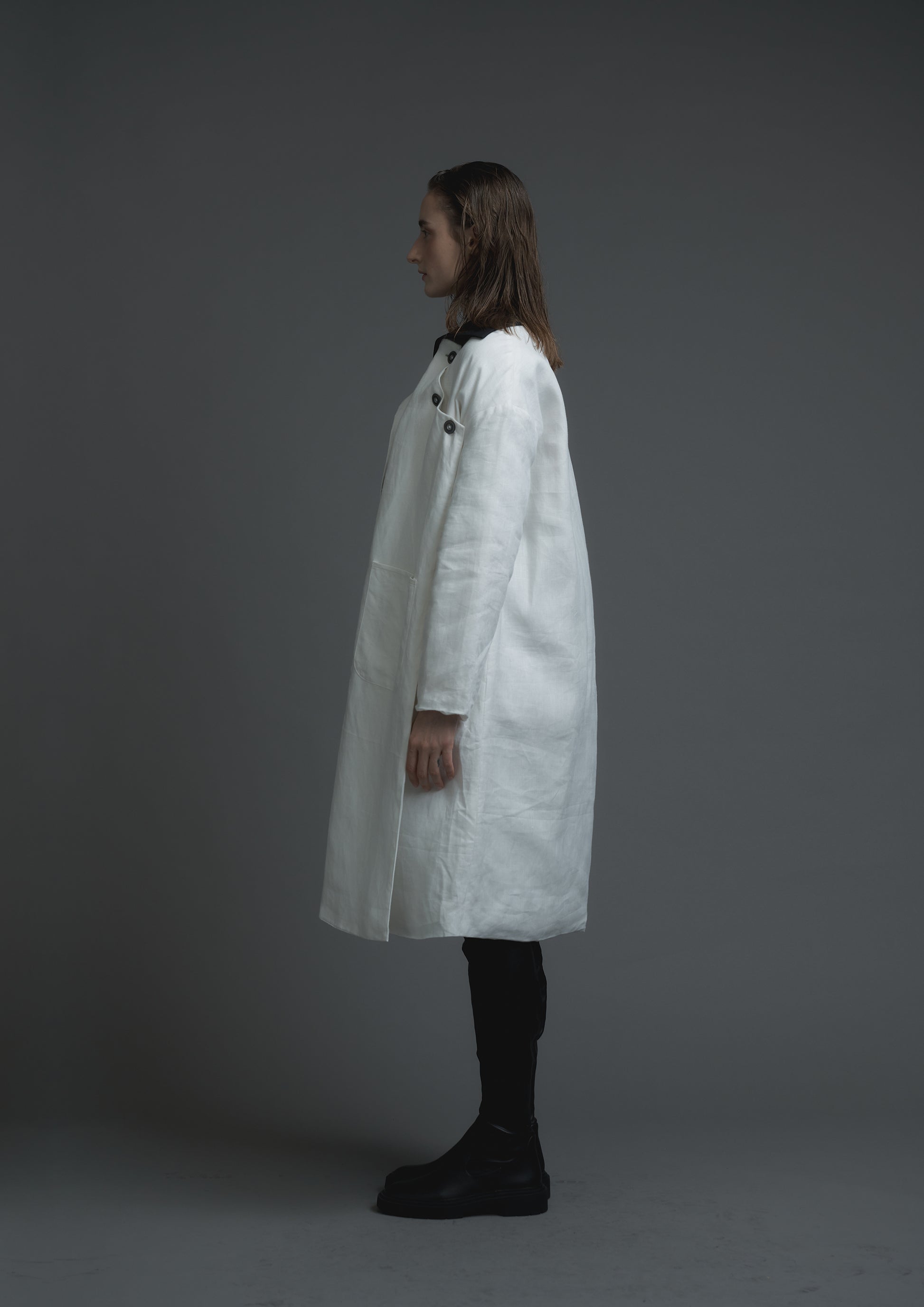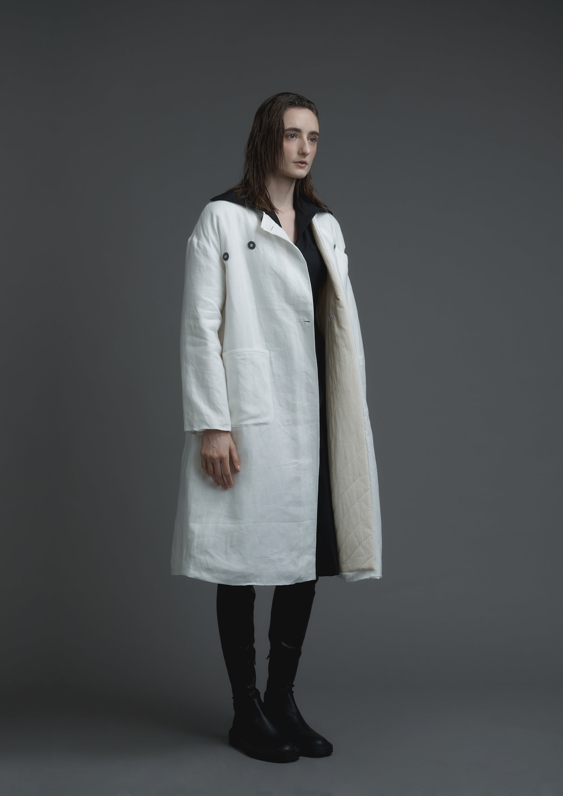This product is influenced by medical protective and patient clothing and features discreet cuffs with elastic bands, as well as front and inner side pockets. The coat also boasts a quilted cotton lining for extra comfort and warmth.