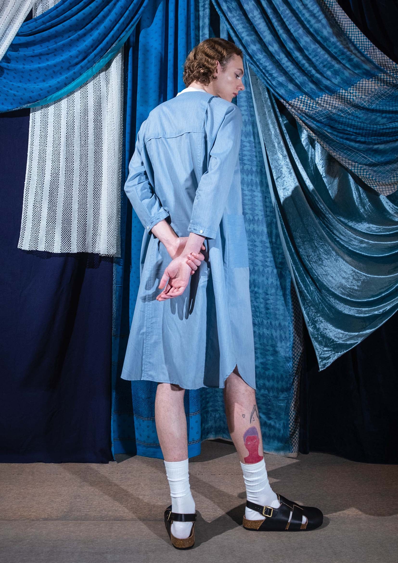 The Shirt dress T in blue striped shirting features T sleeves and a free size cut, crafted from high quality Japanese shirting fabric for durability and comfort. The adjustable cuff with button up details and the pleated yoke details add a touch of elegance, while the flat pockets and shell buttons provide functionality.